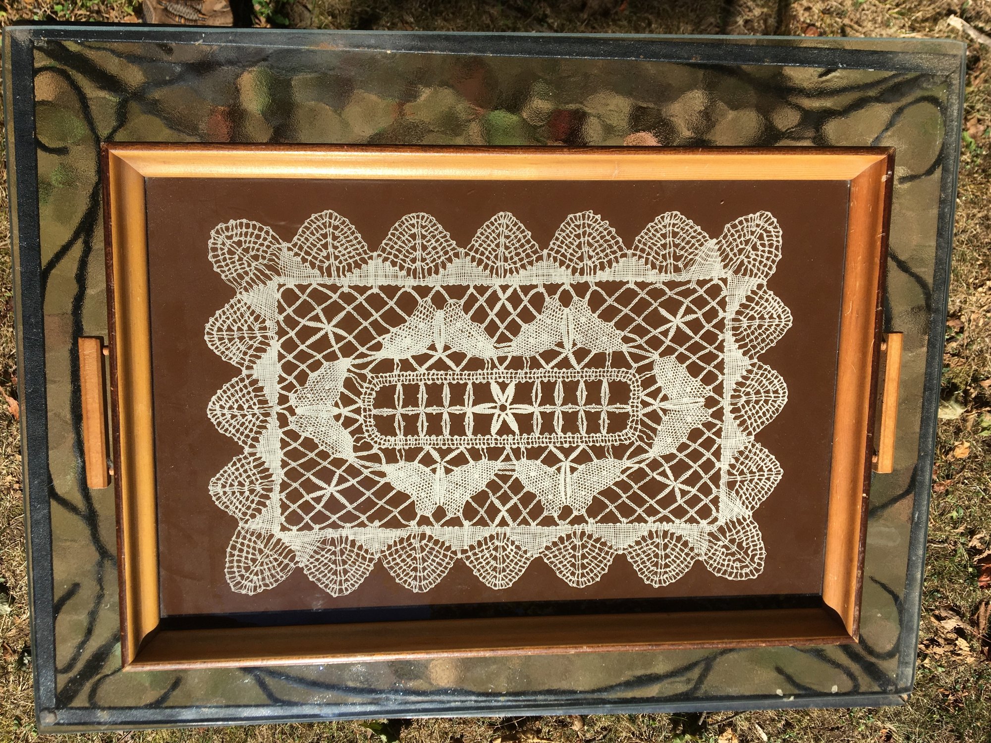Antique Serving Tray with Butterfly Butterflies embroidered Lace Doily Display in nice Estate found condition. - See photos for size and overall condition.