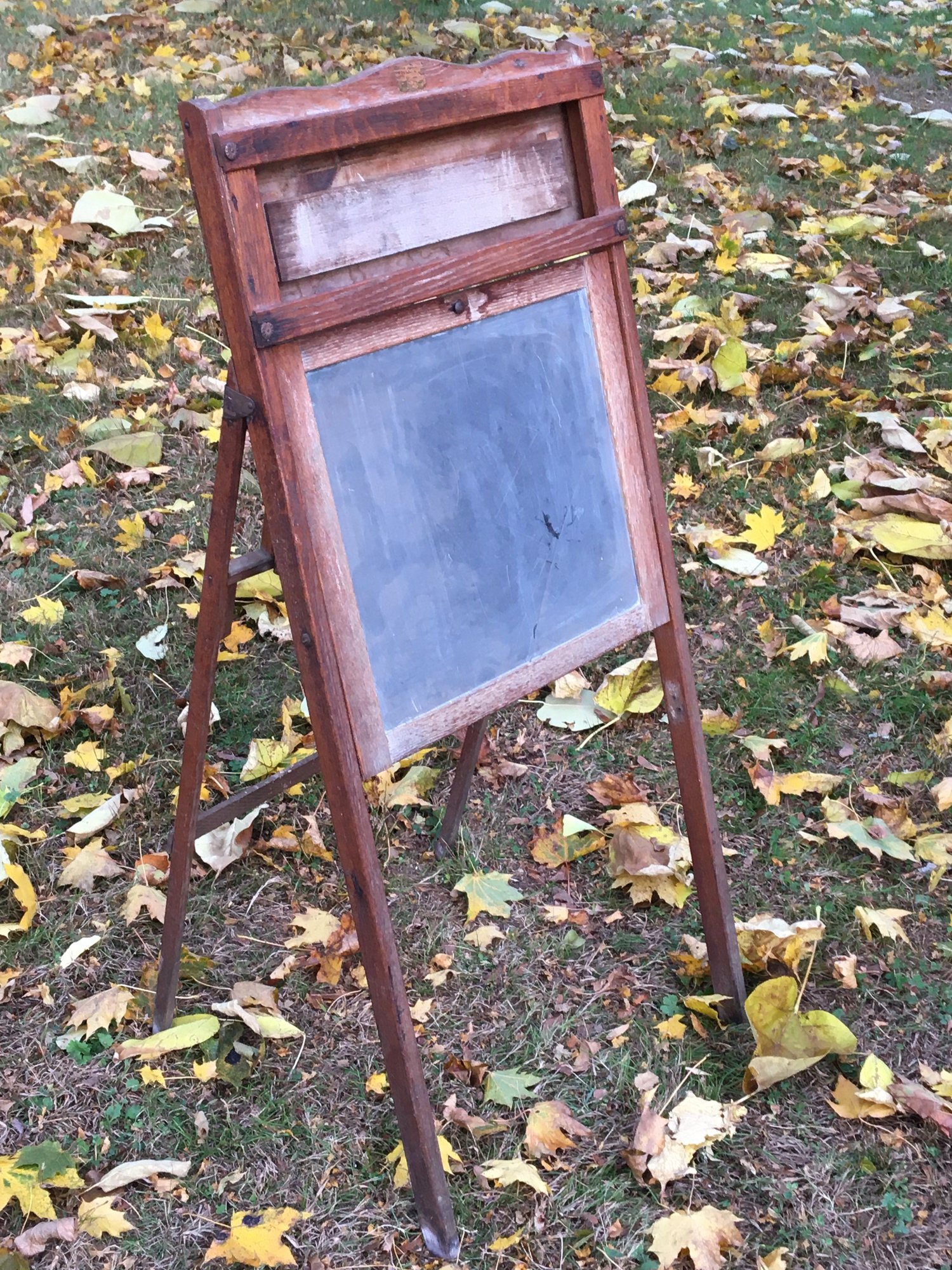 Antique Standing Fold up Flip Down School Chalkboard / Blackboard. - Estate found, Frame is made of Oak and Slate Chalkboard has a crack. Late 1800s-early 1900s. - See photos for overall condition and size comparison.
