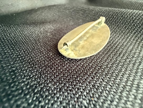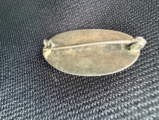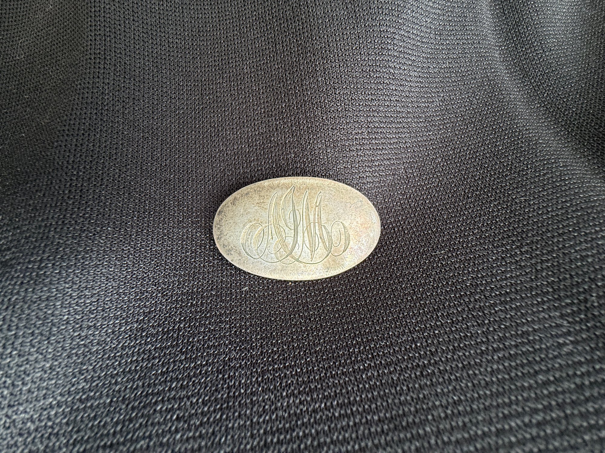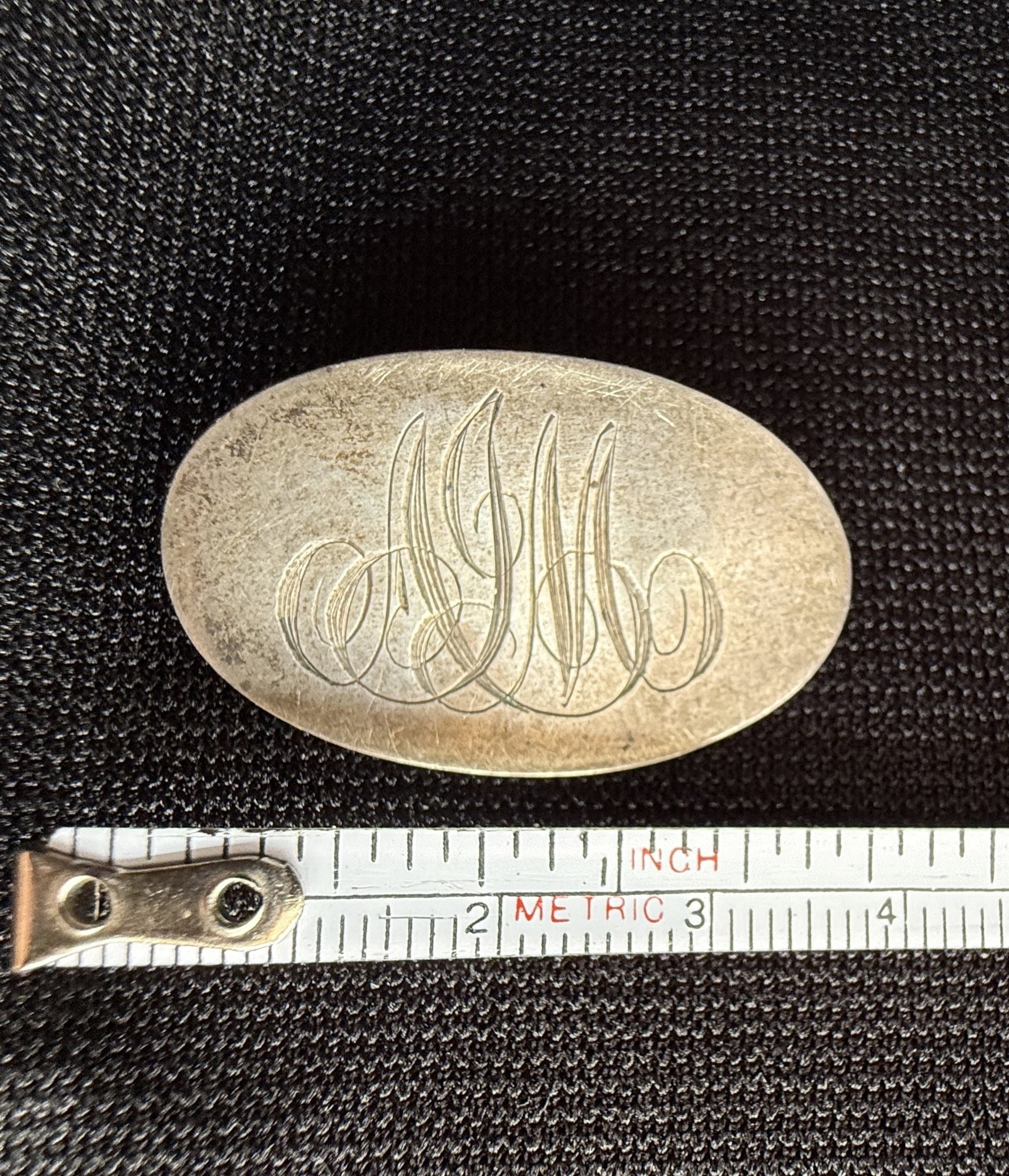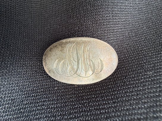 Antique sterling silver brooch, estimated to date from the early twentieth century, engraved with the elegantly scrolling monogram initials "AJM".