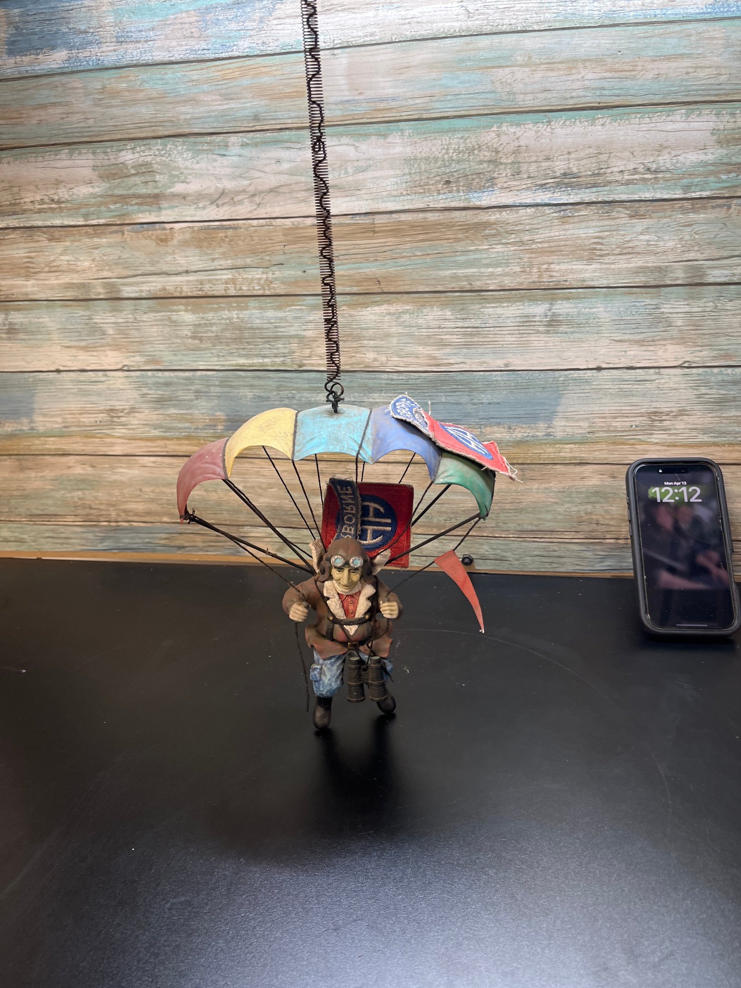 One parachut red one is crack see pictures for details. Measurements are 9 inches tall and approximately 9 inches wide.