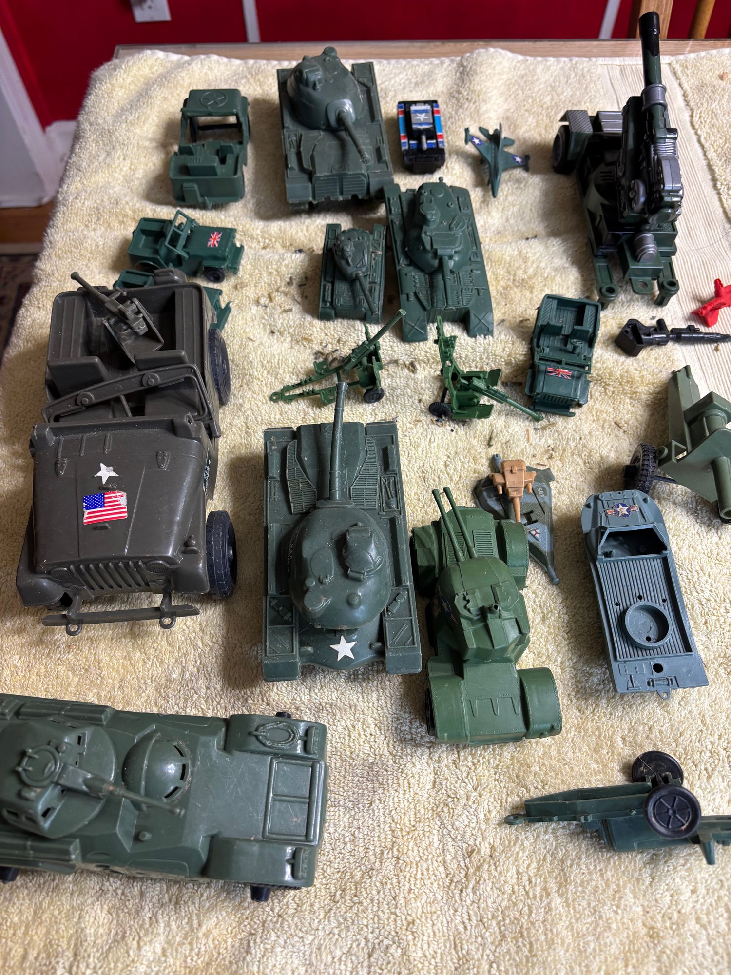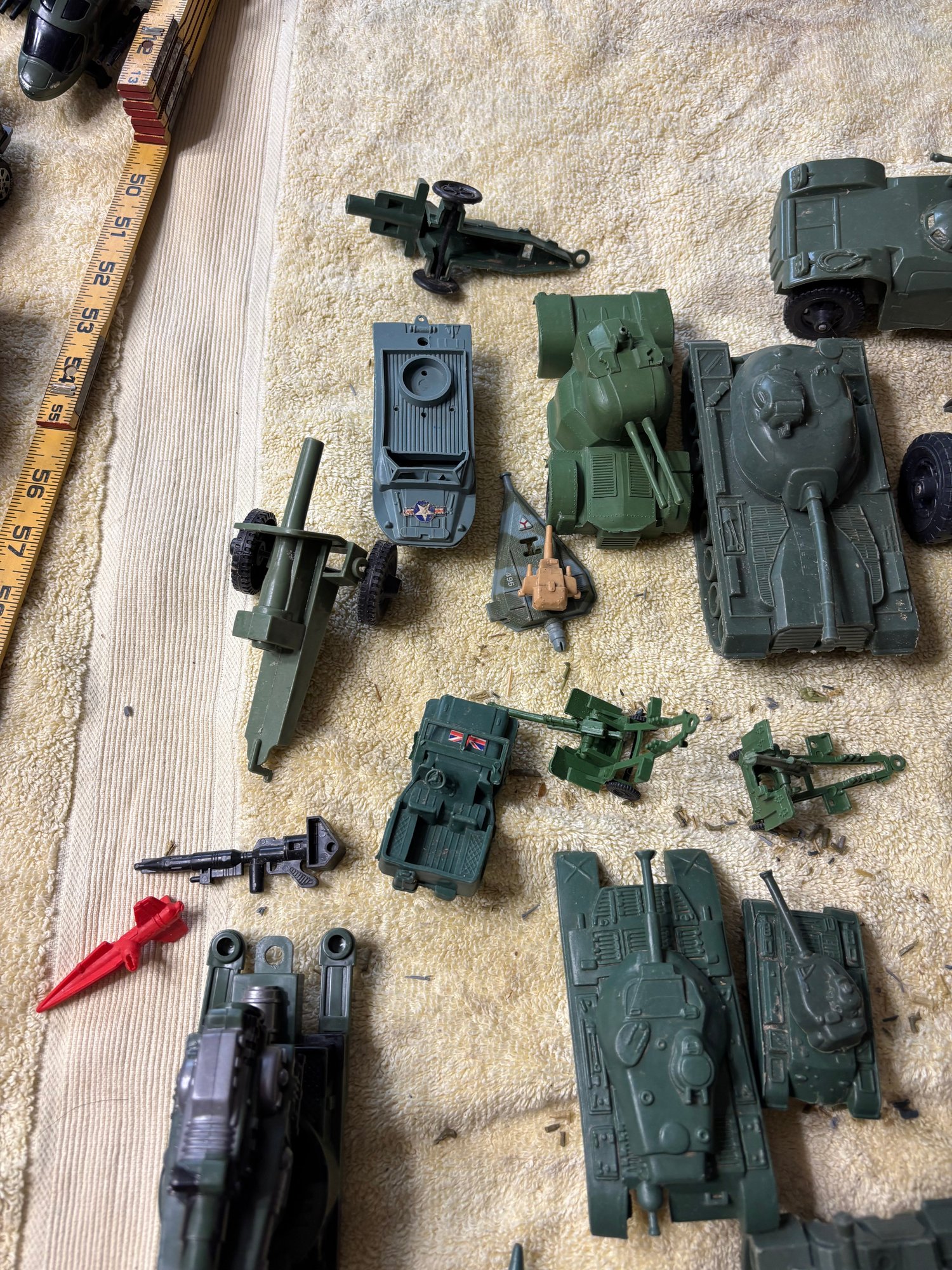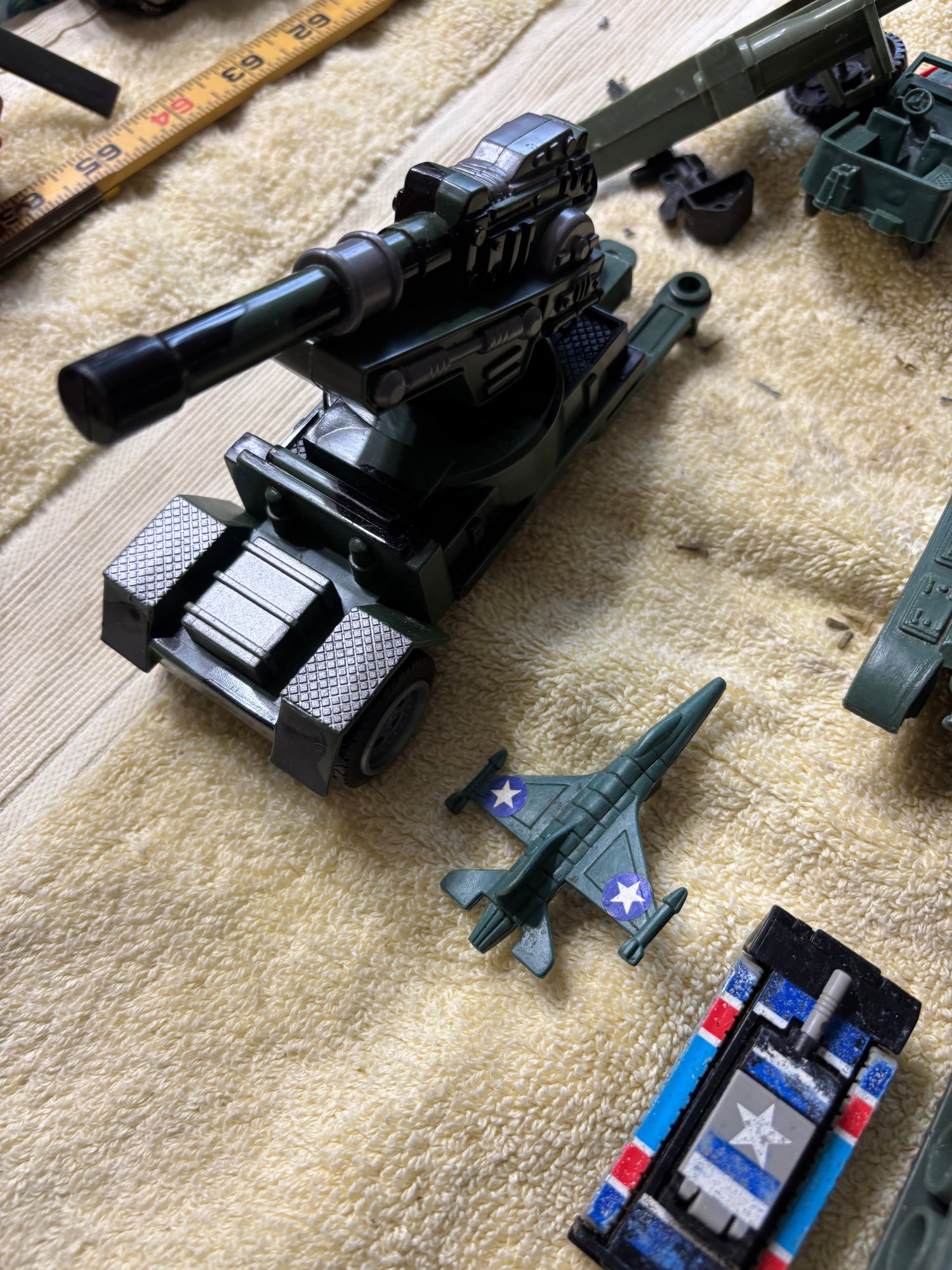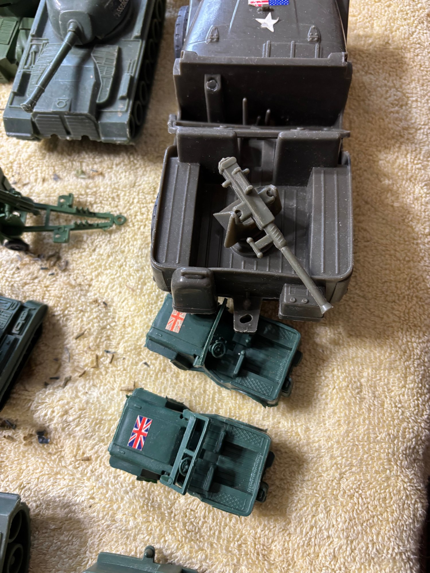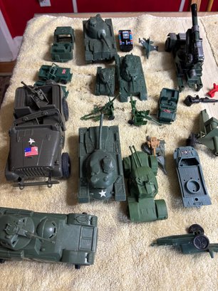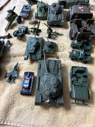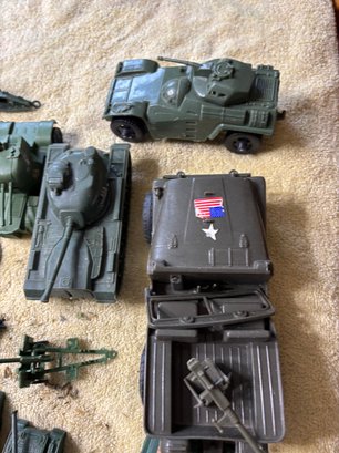 Plastic military vehicle toys some labeled china or Hong Kong and some ho name