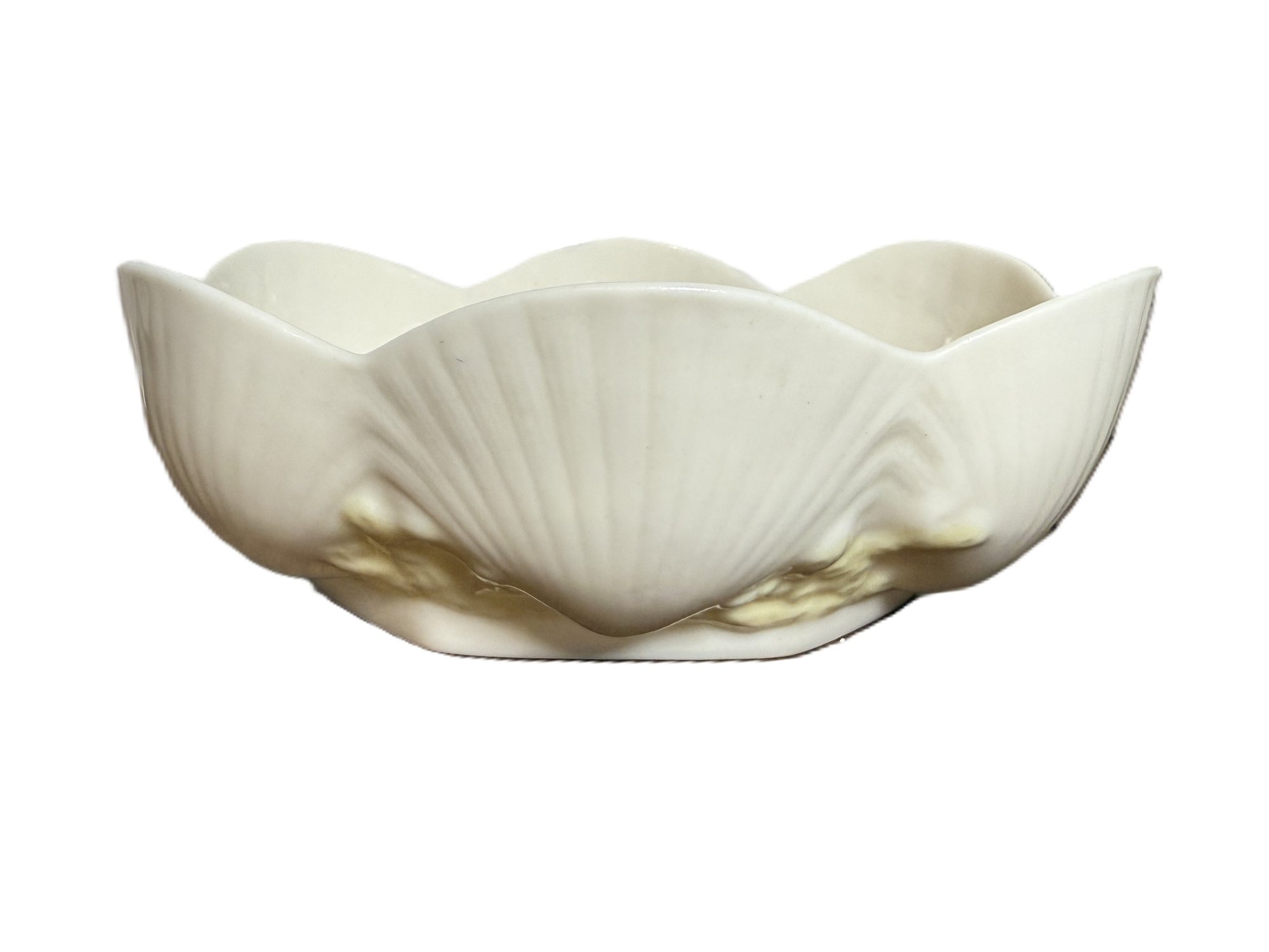 Delightful Irish-made vintage Belleek shell form bowl with small yellow coral details toward the base.