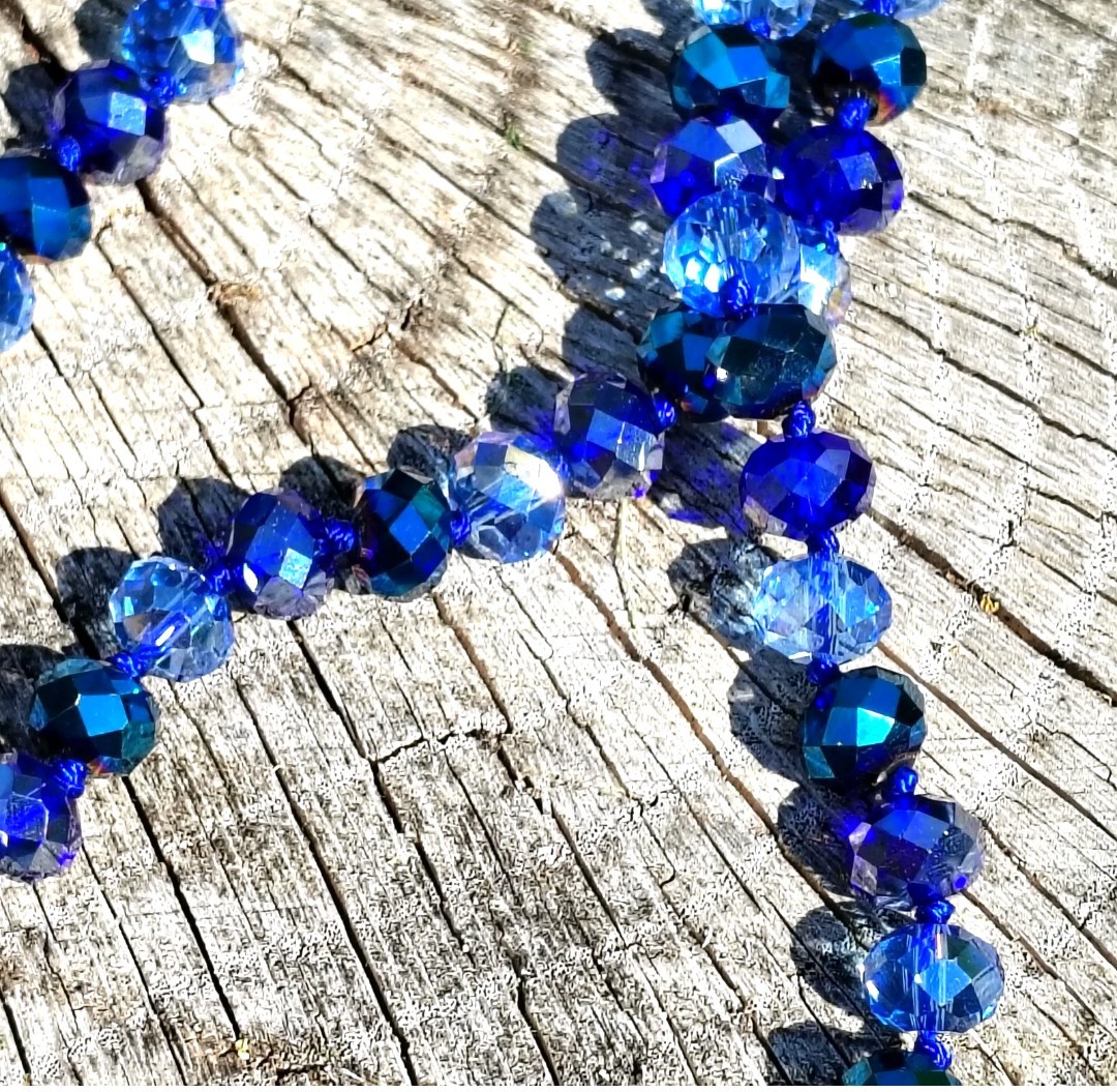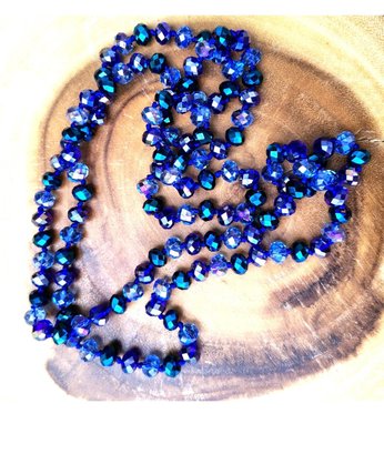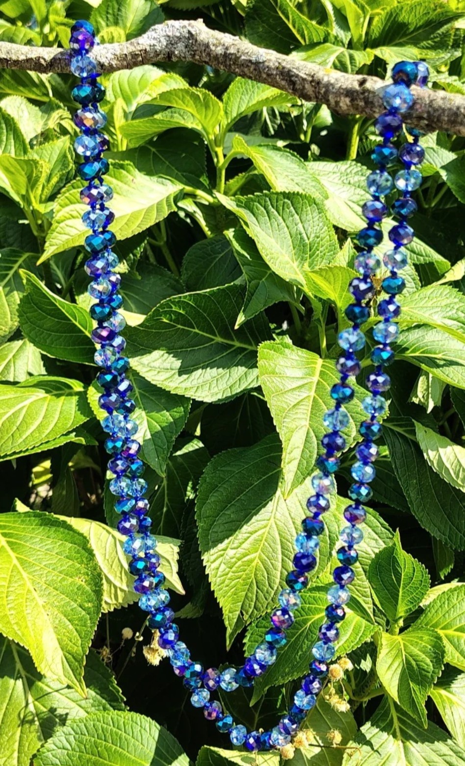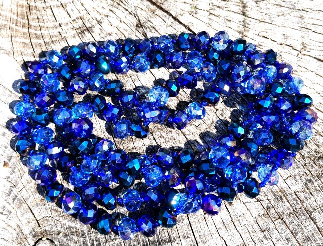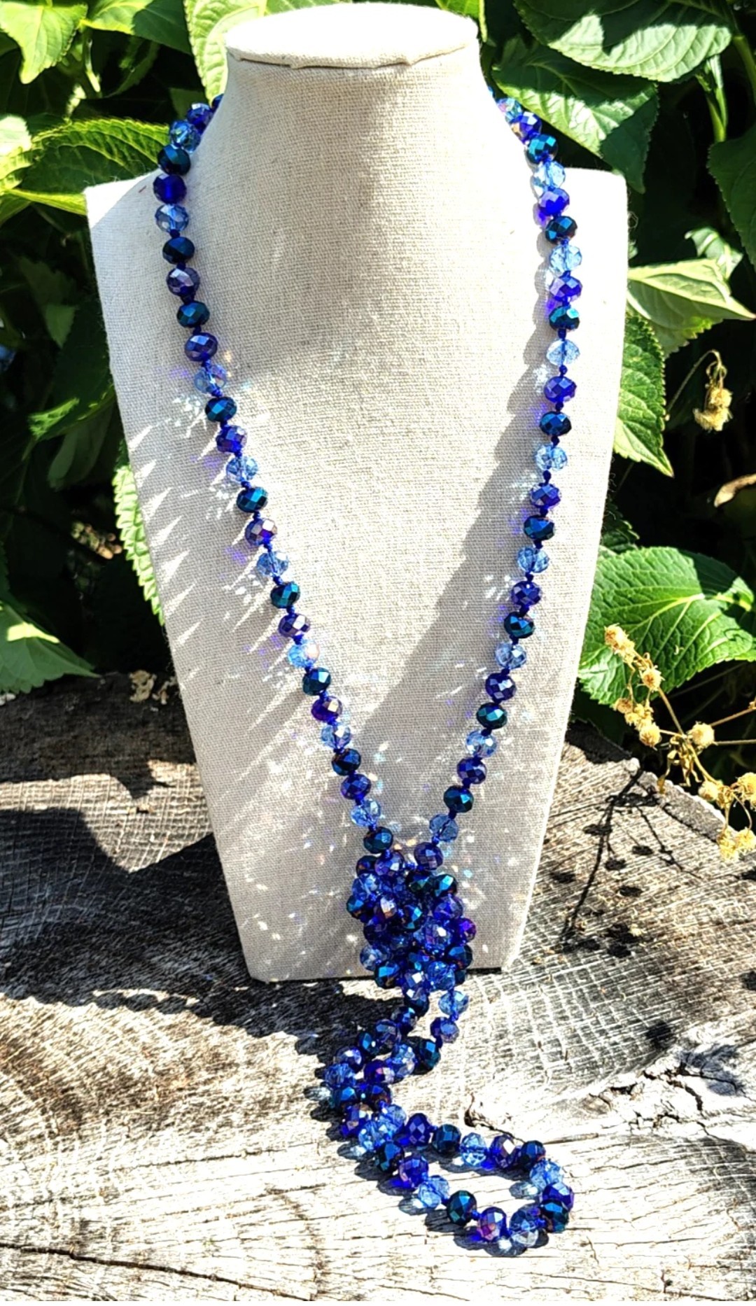 Stunning Tri Color Blue Purple AB Austrian Crystals Hand Knotted Opera Necklace 48"