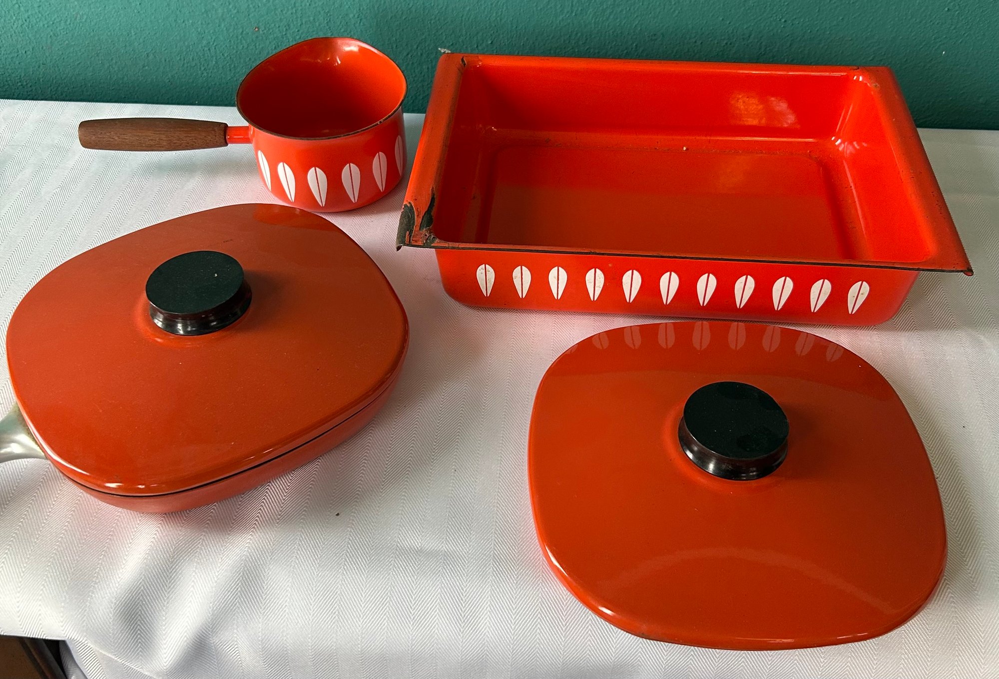 Includes casserole, 2 pots and 2 lids (one does not fit small pot). Note damage to corner of casserole.