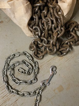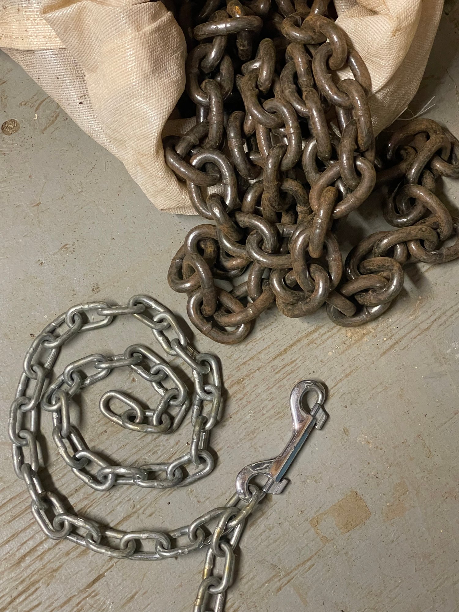 Heavy bag full of heavy chain and smaller length of smaller chain with hook.