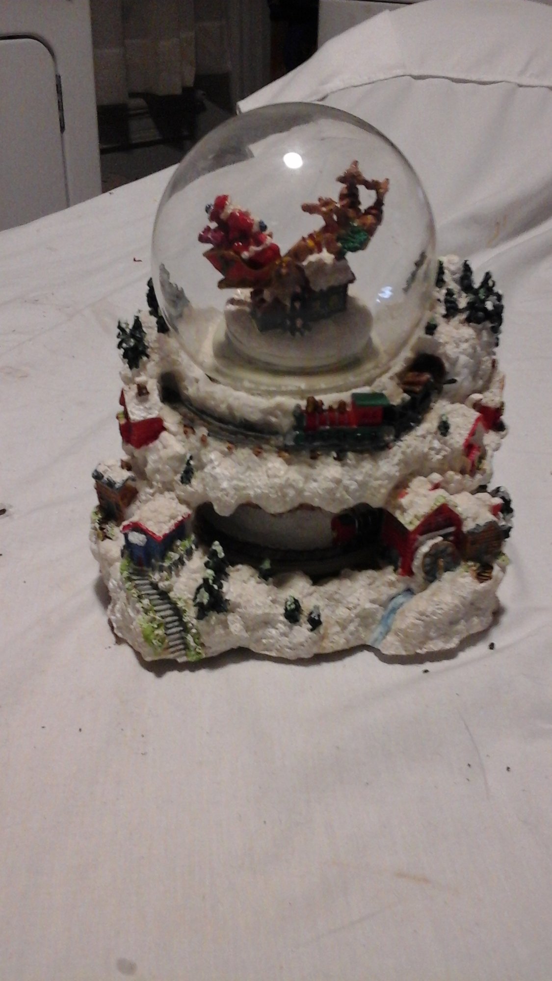 this music box plays Santa Claus is Coming to Town the carousel underneath still spins however there is no water in the snow globe part still a very nice Christmas decorative peace for the shelf that has working music box