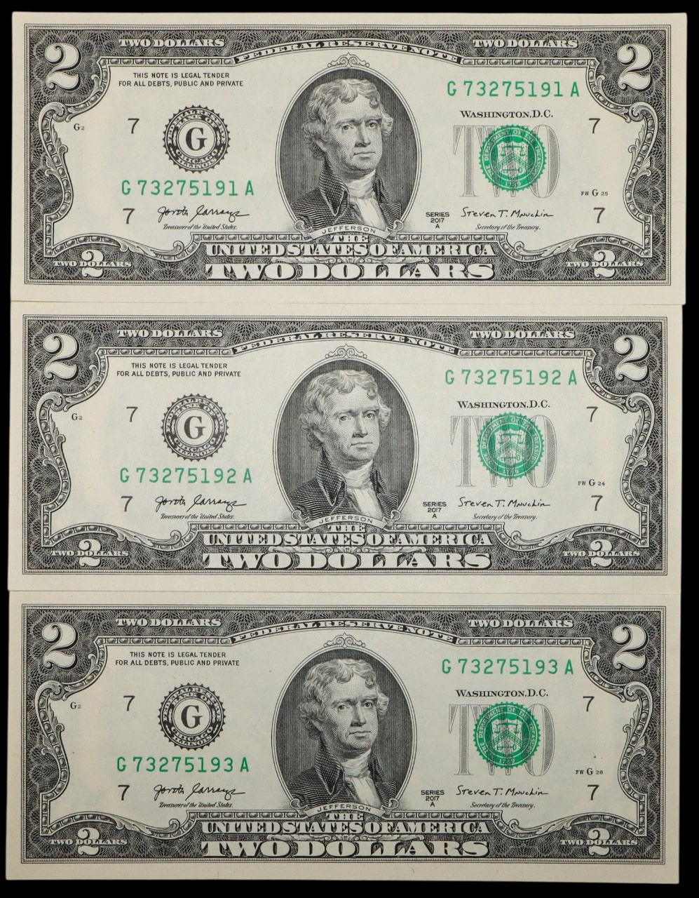 Crisp Consecutive uncirculated $2 federal reserve notes green seal