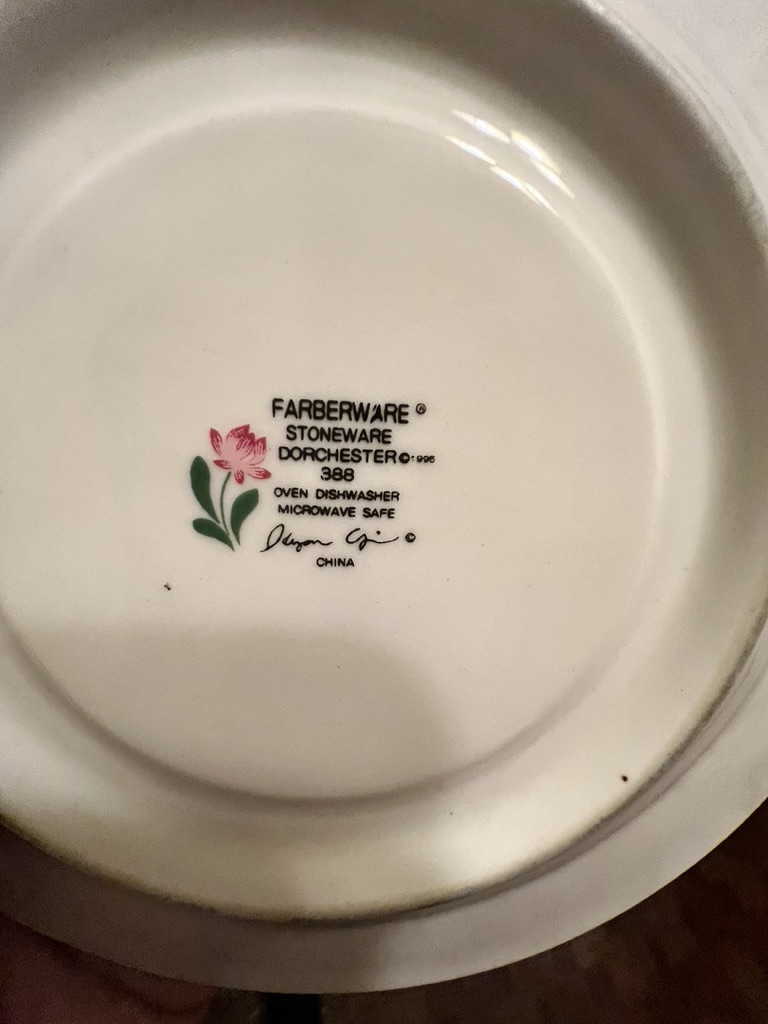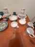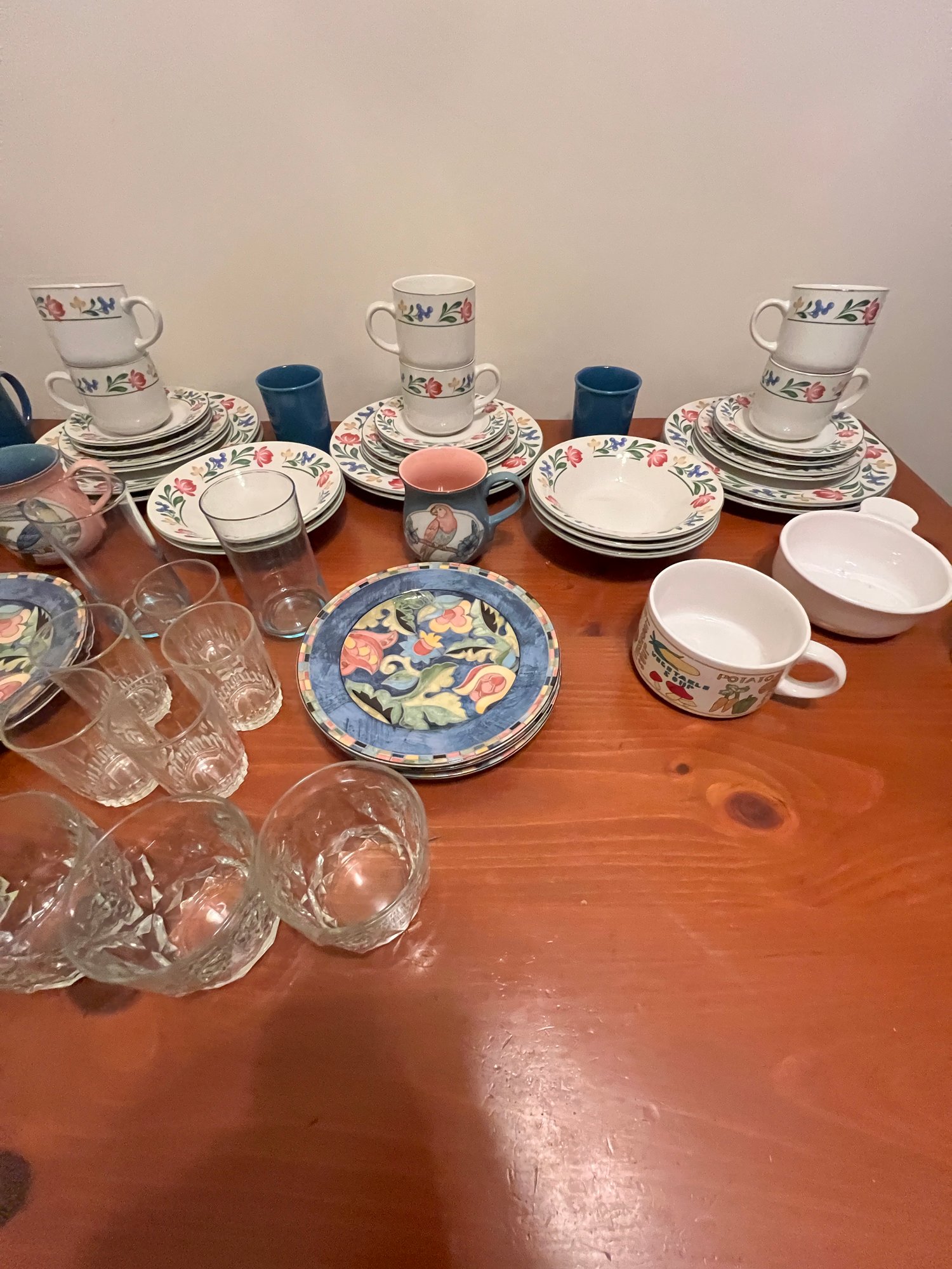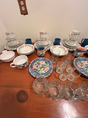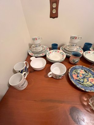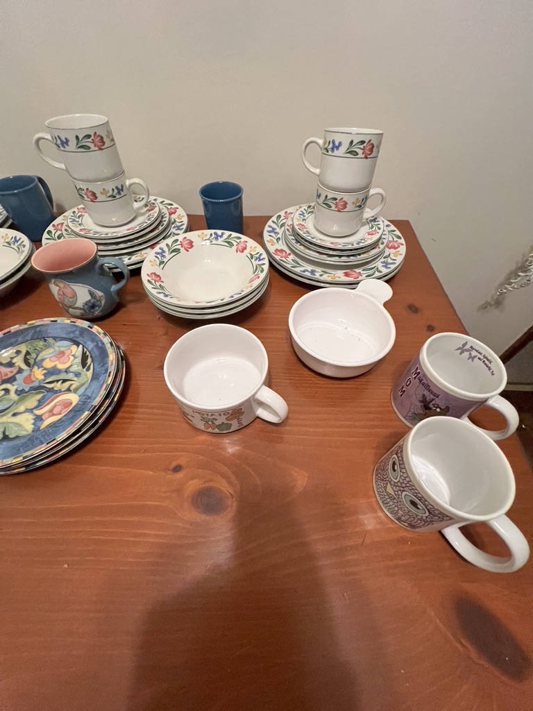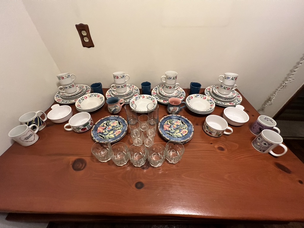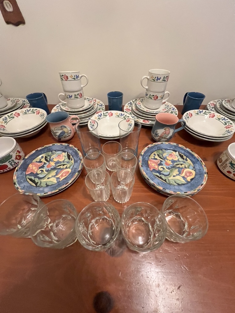 dishes and glassware, mugs and extra plates, serv for 8 less 1 saucer