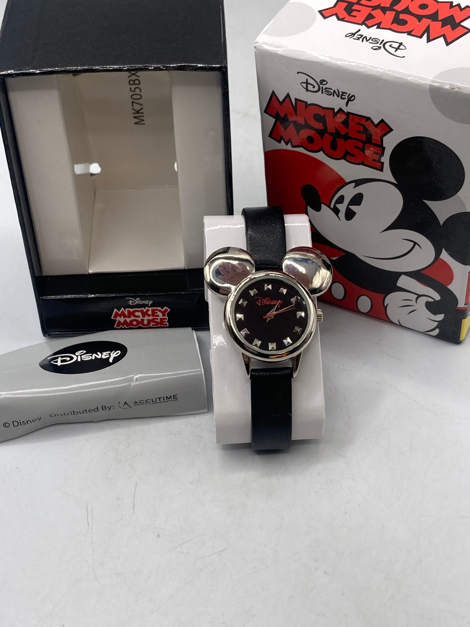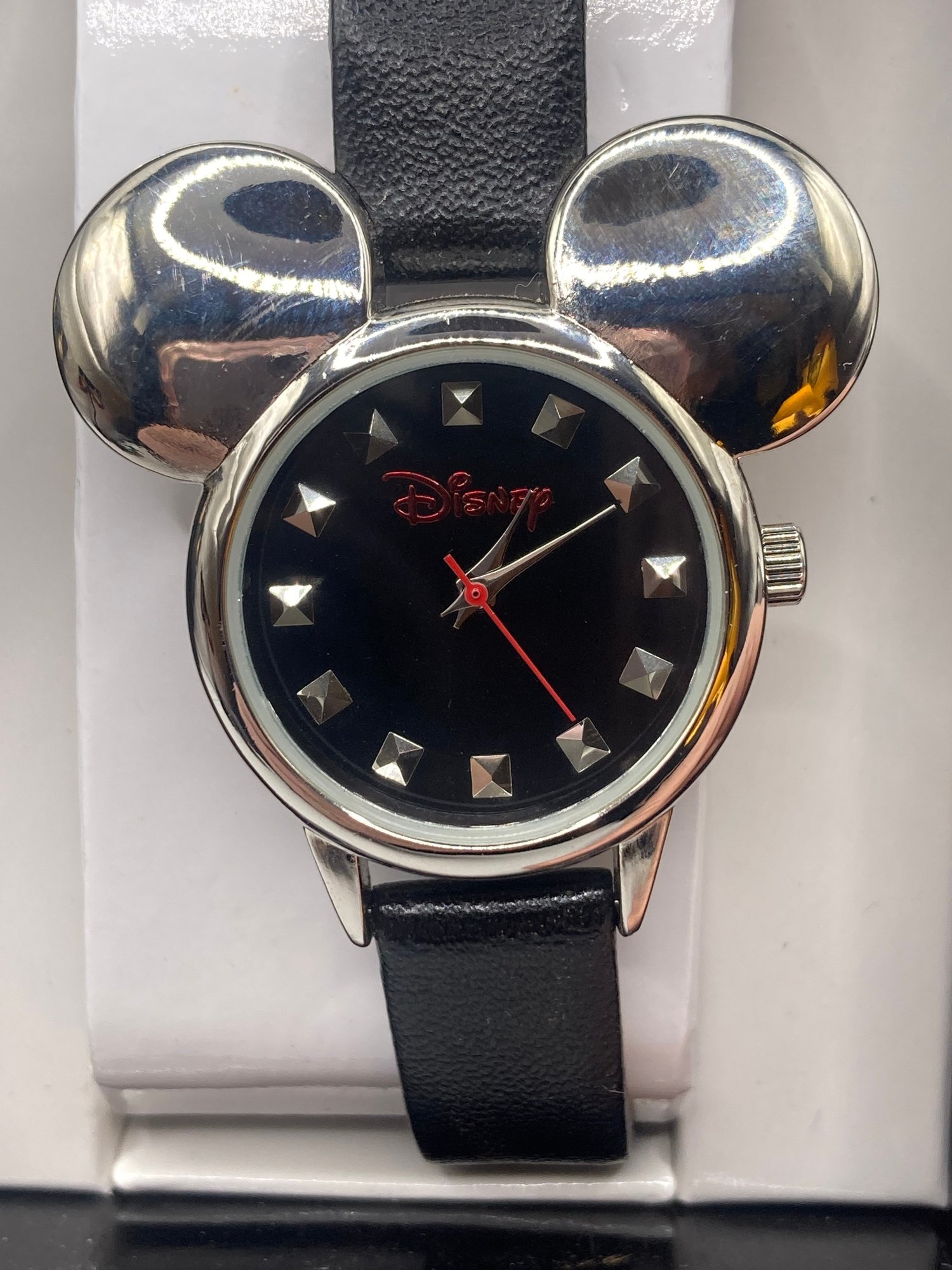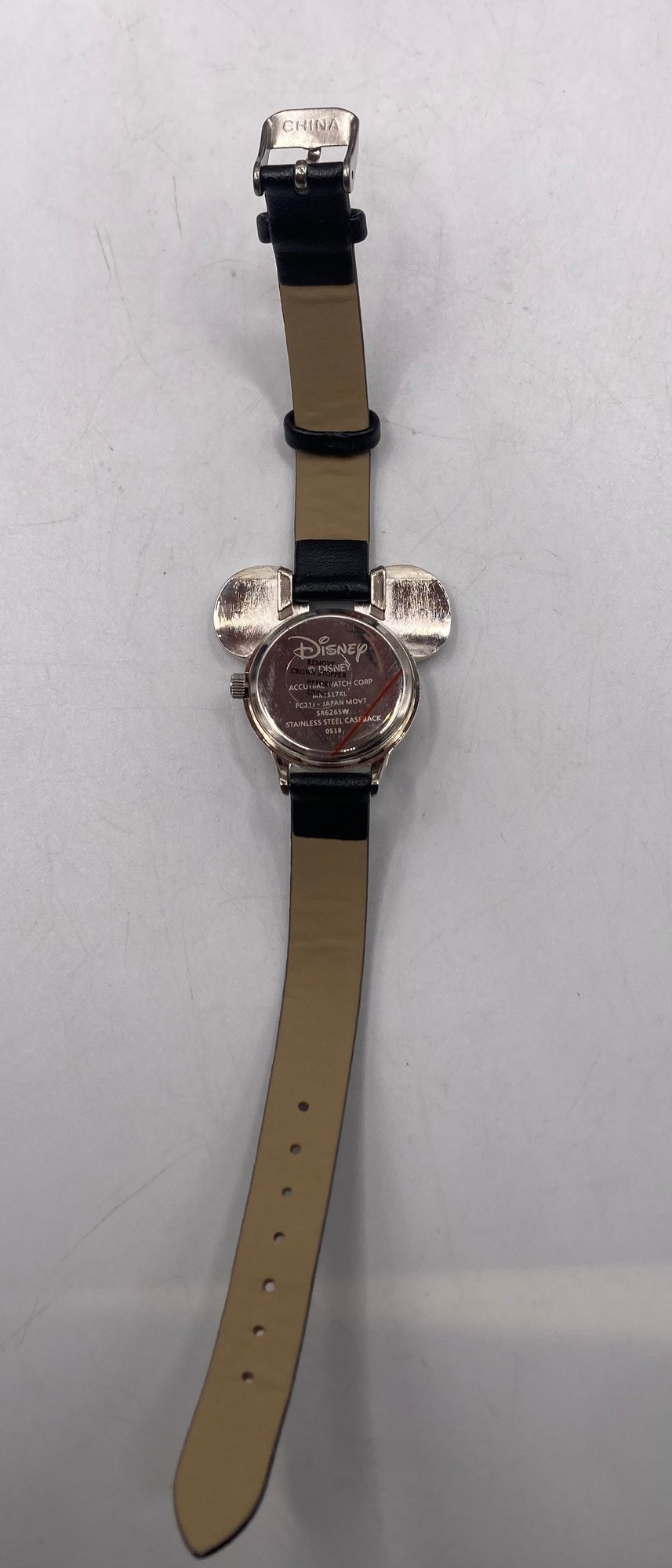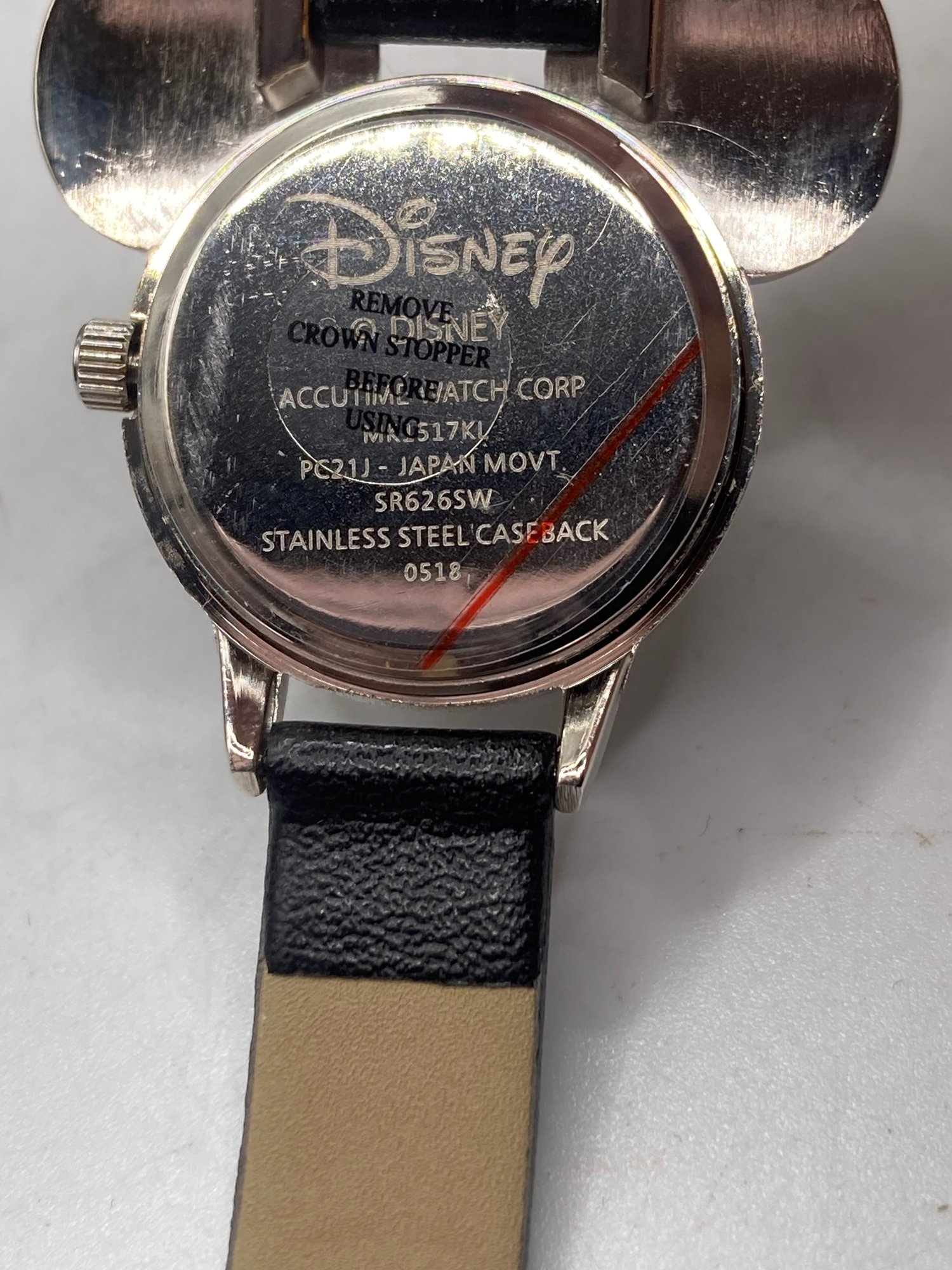 Brand new Disney Mickey Mouse wristwatch by Accutime. Manufactured May 2018. Watch was opened only to check/replace battery and confirm it is in working order. Protective plastic seal remains on the stainless steel caseback. Includes original Disney box and insert. Silver-tone Mickey ears case with black strap. Japan quartz movement.