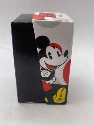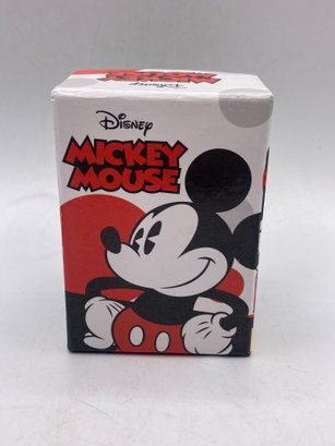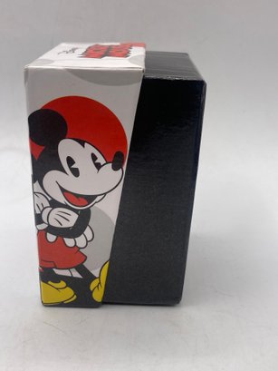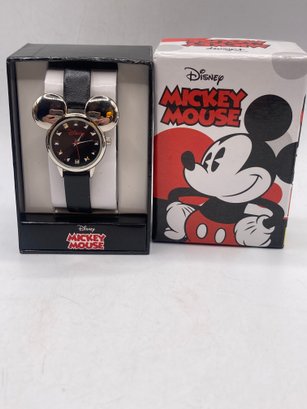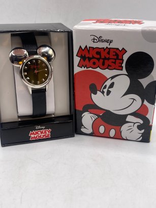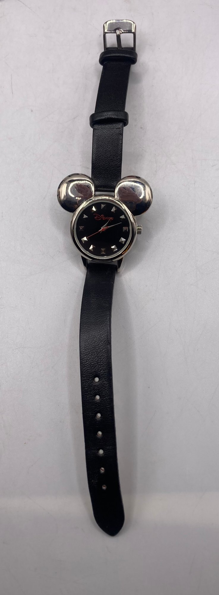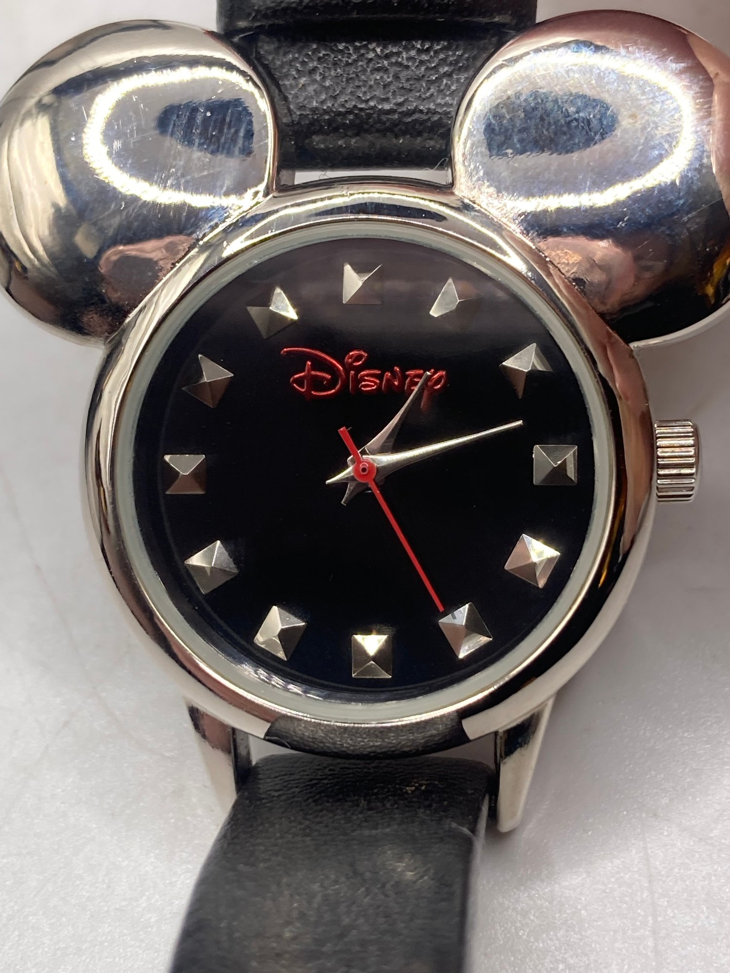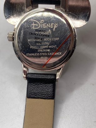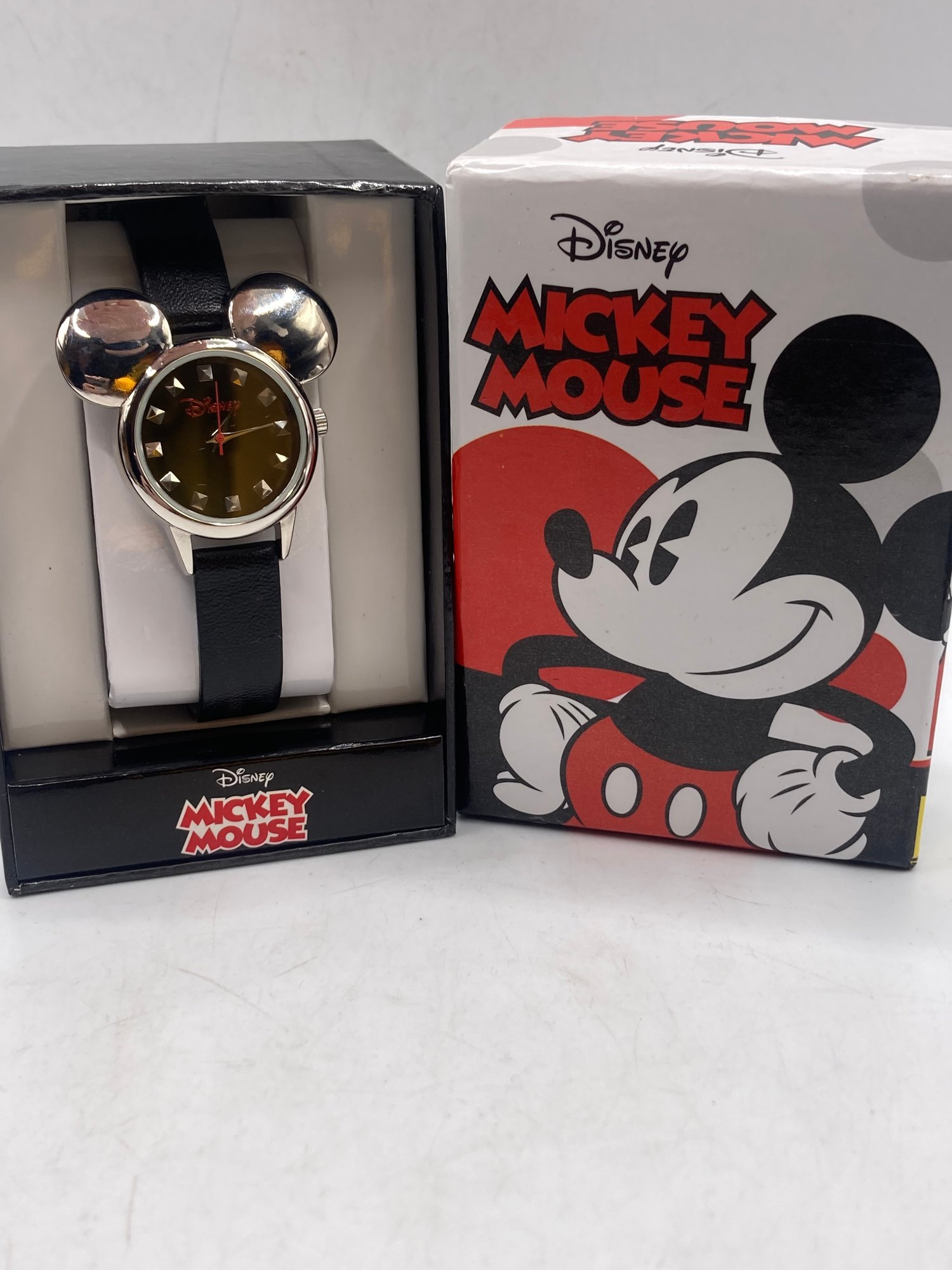 Brand new Disney Mickey Mouse wristwatch by Accutime. Manufactured May 2018. Watch was opened only to check/replace battery and confirm it is in working order. Protective plastic seal remains on the stainless steel caseback. Includes original Disney box and insert. Silver-tone Mickey ears case with black strap. Japan quartz movement.