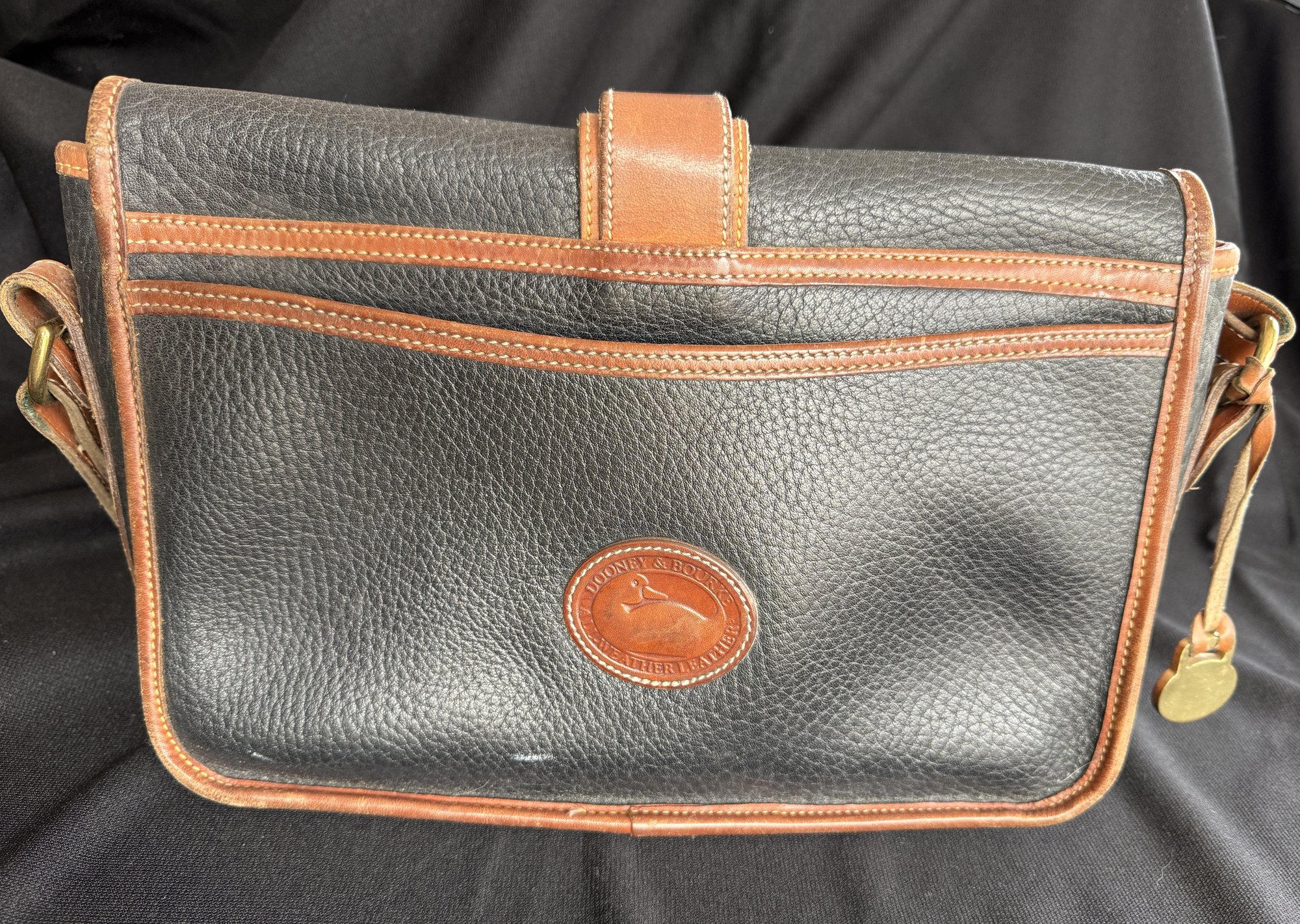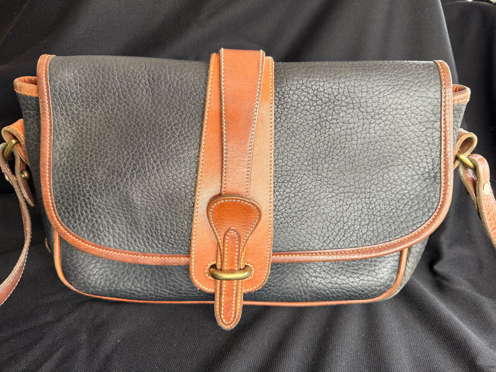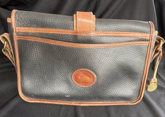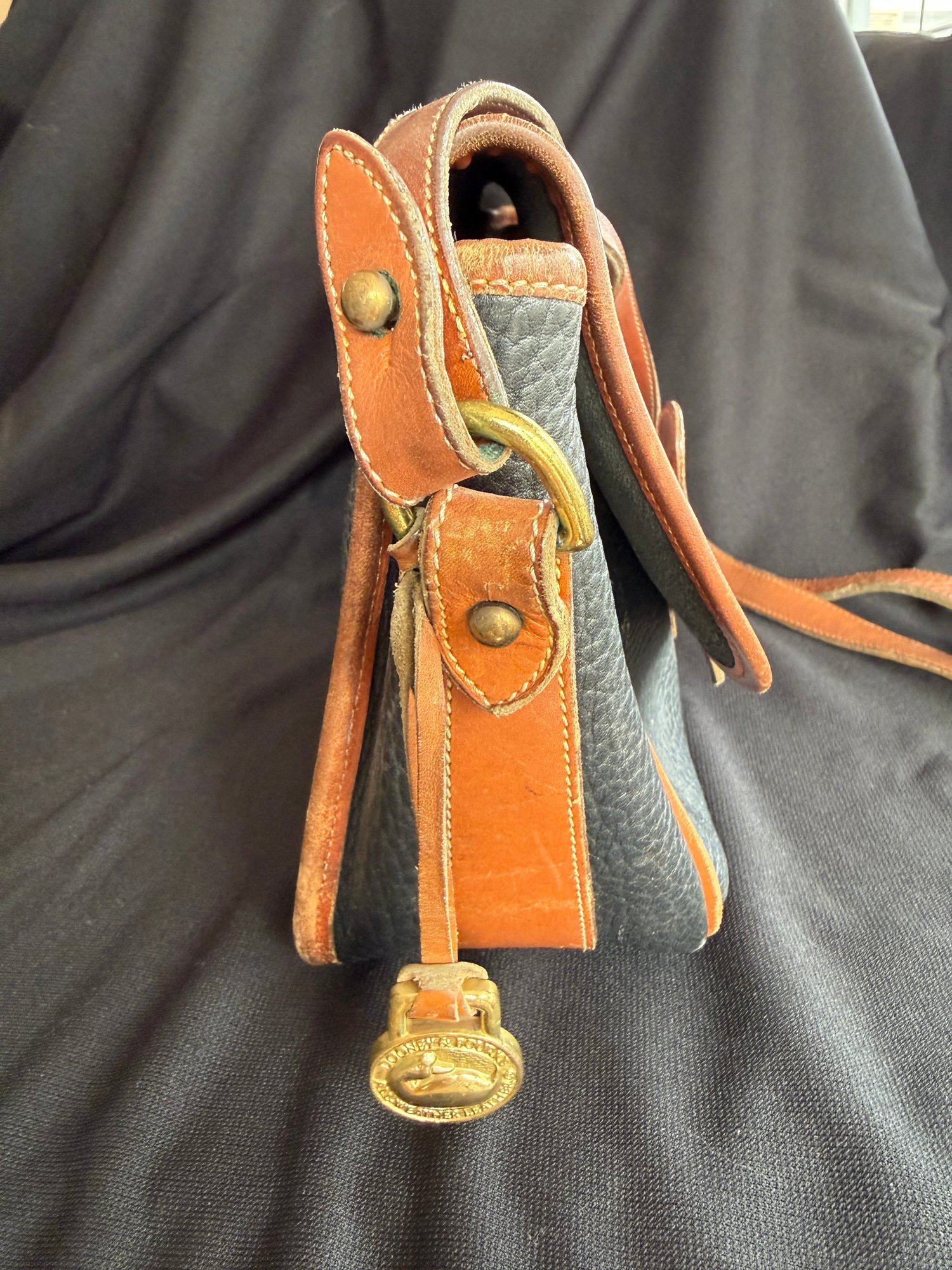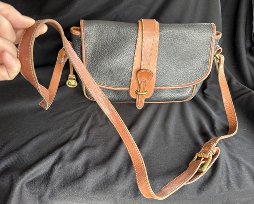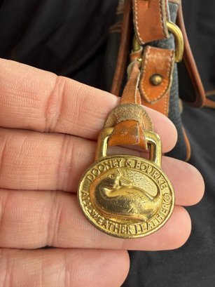Classic navy and tan "all weather" leather handbag by Dooney & Bourke, with solid brass hardware - the sign of real quality - and nicely kept with only one scuff on the backside and the interior in great shape.