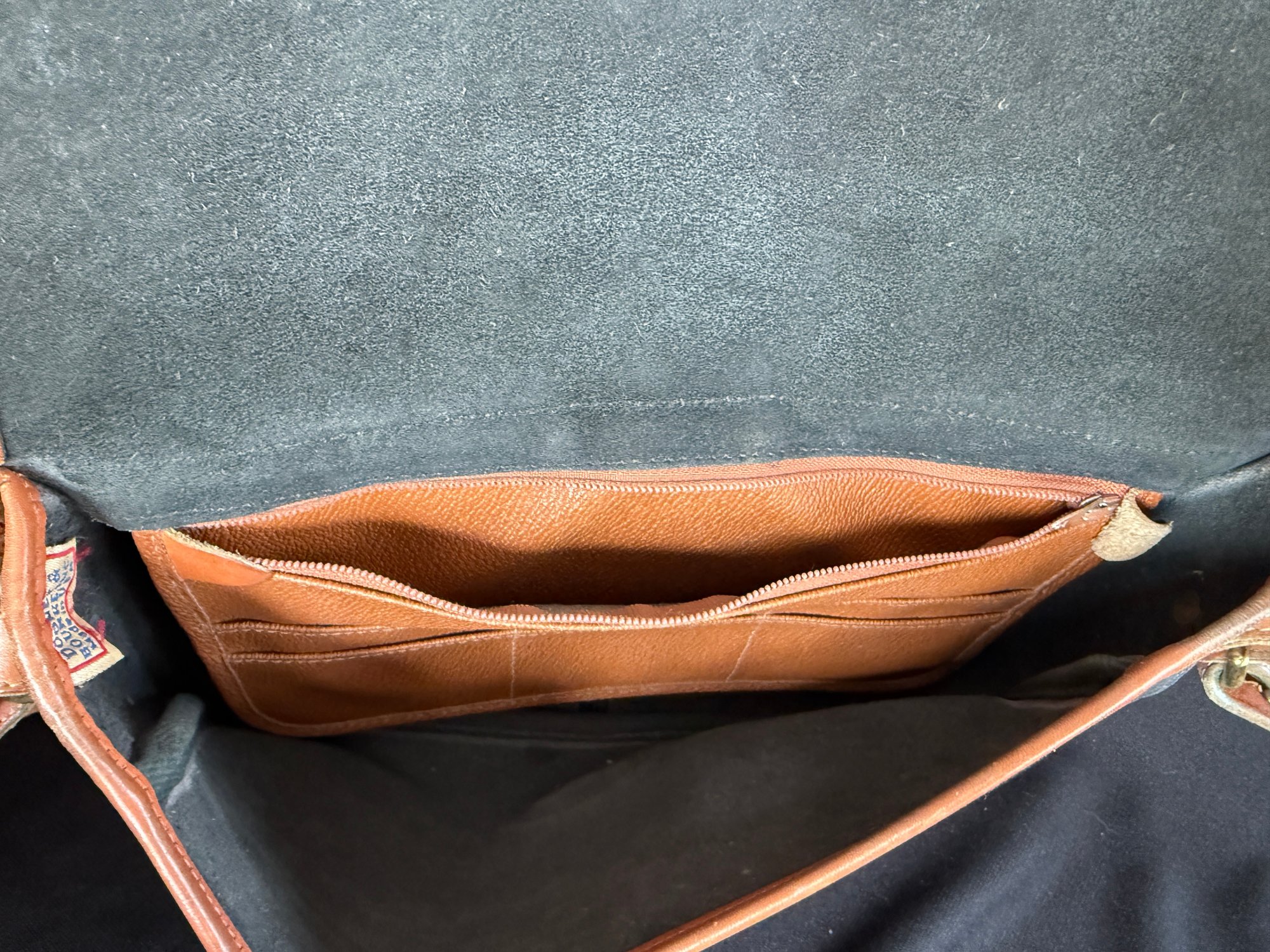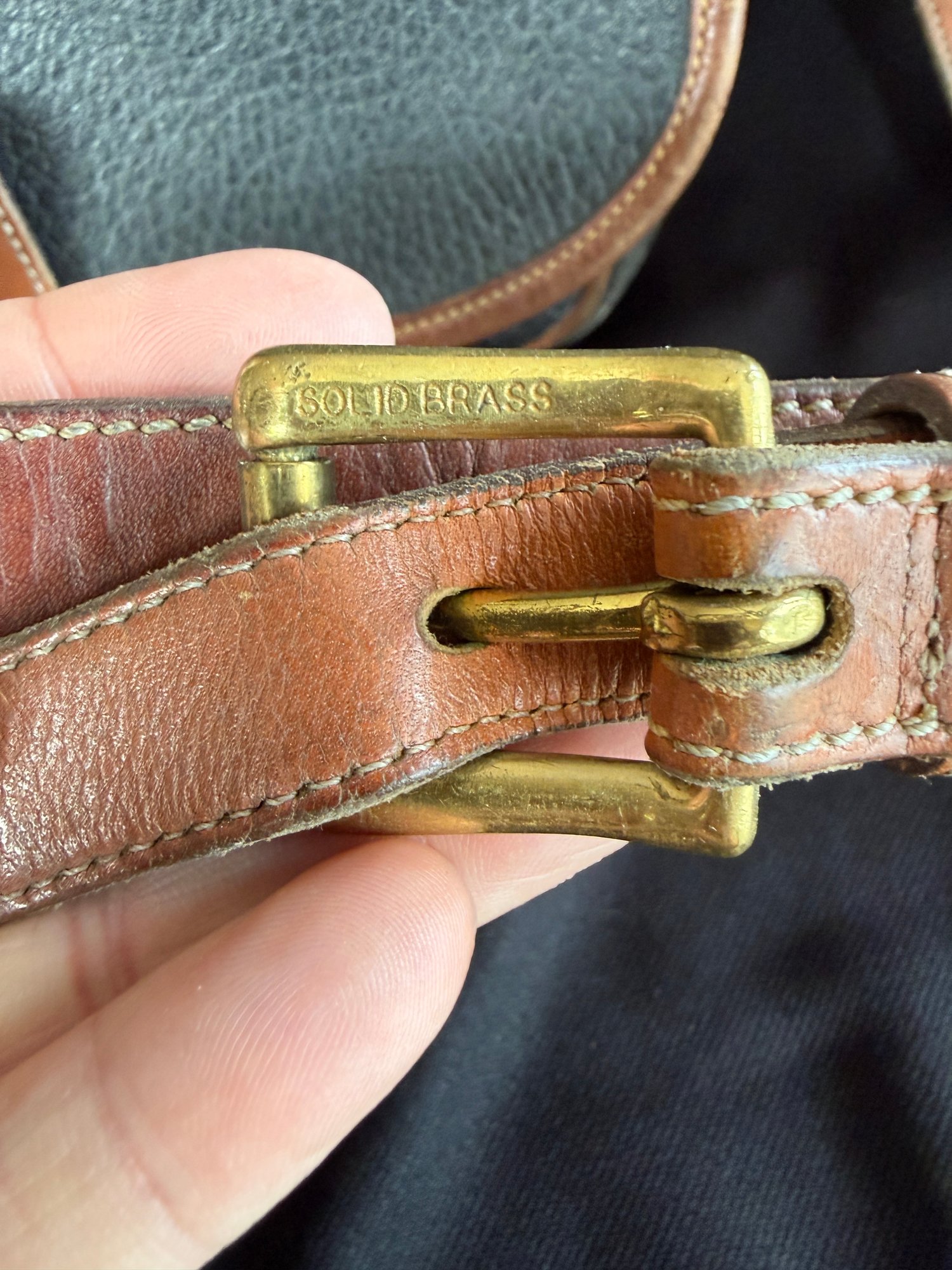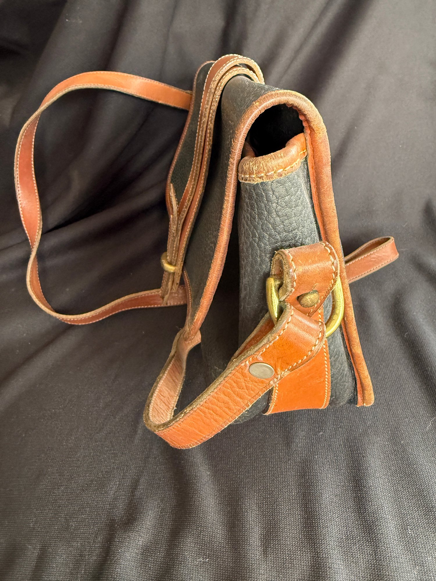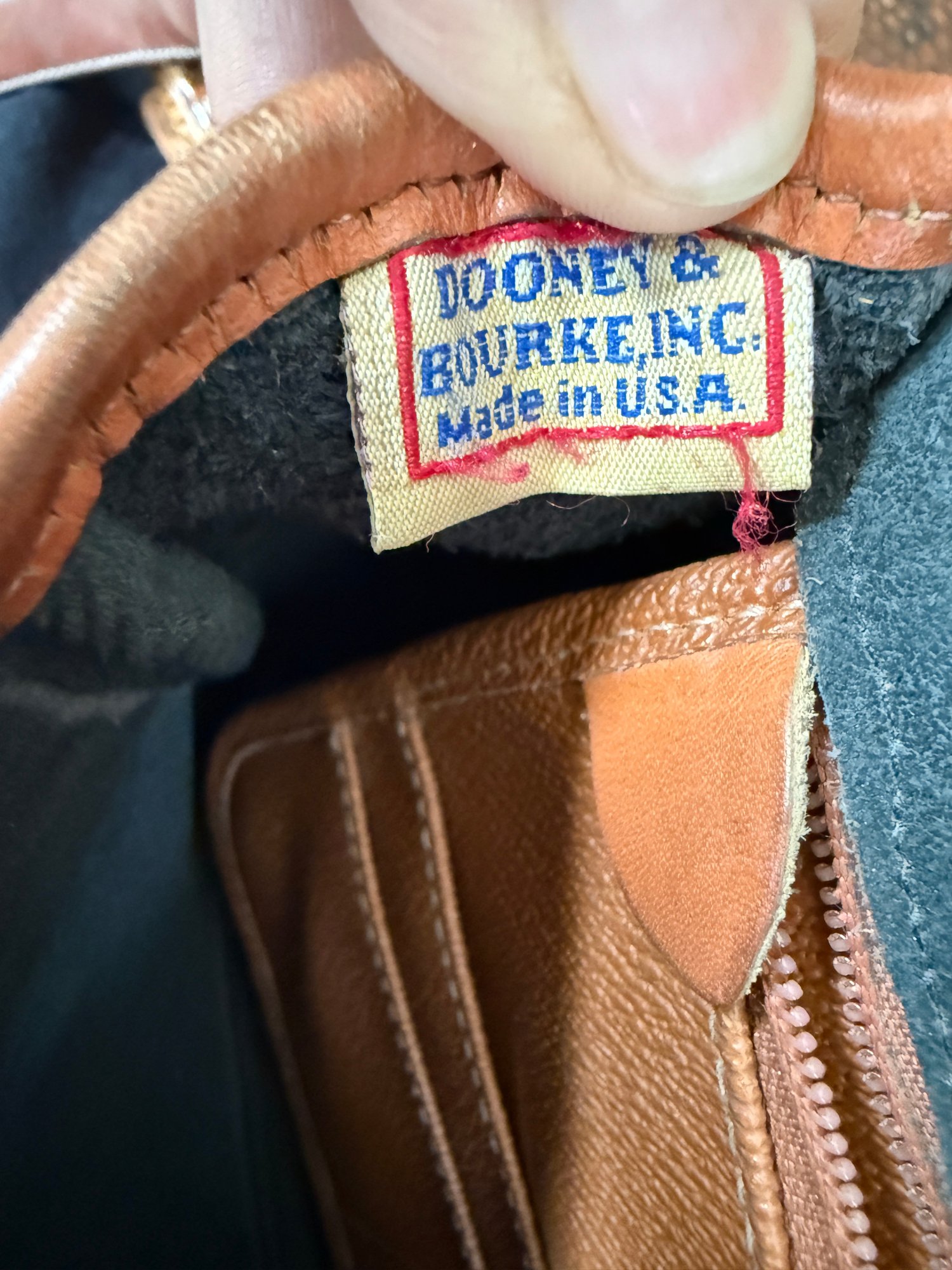 Classic navy and tan "all weather" leather handbag by Dooney & Bourke, with solid brass hardware - the sign of real quality - and nicely kept with only one scuff on the backside and the interior in great shape.