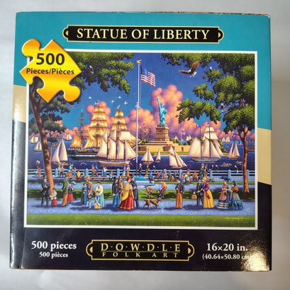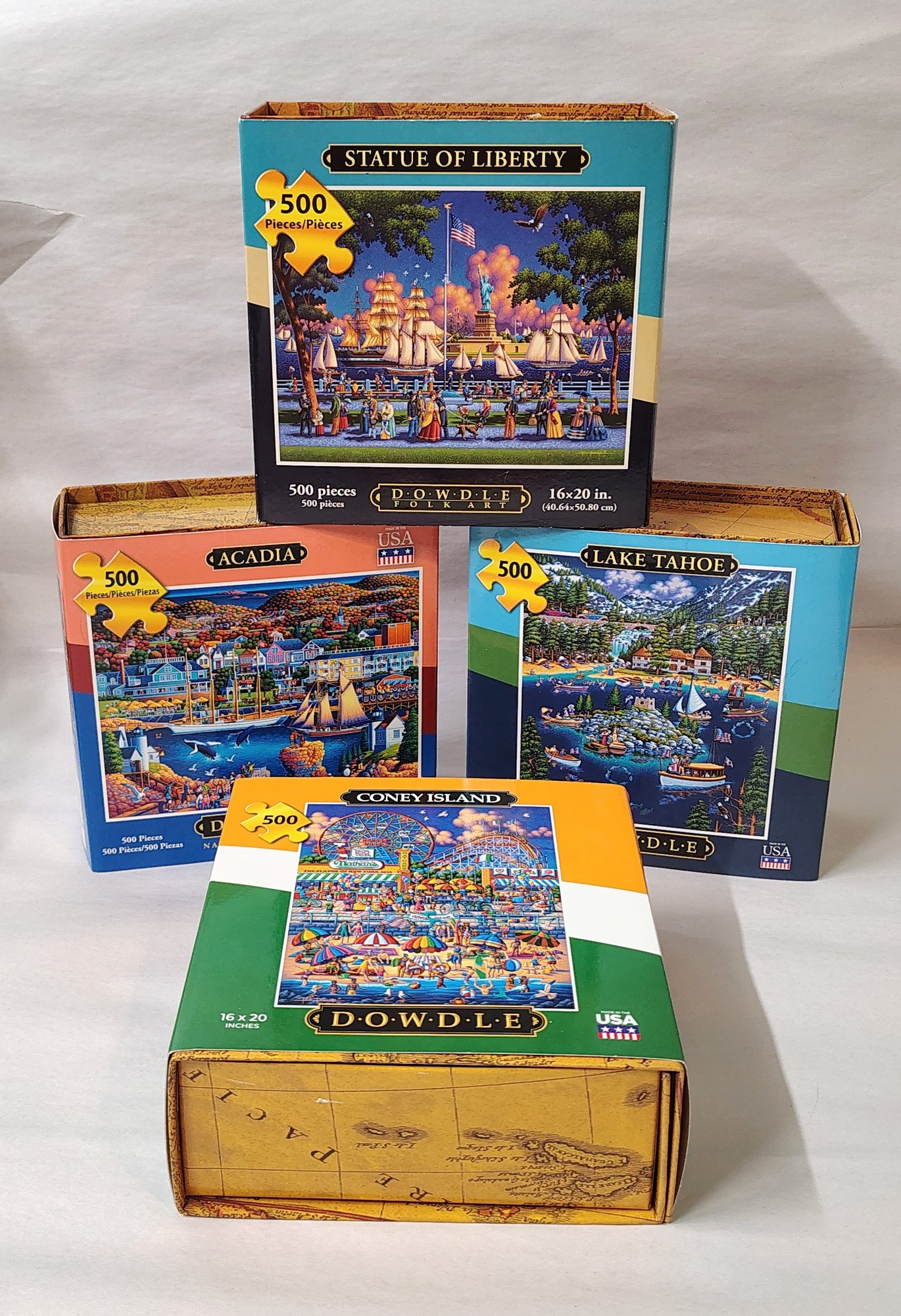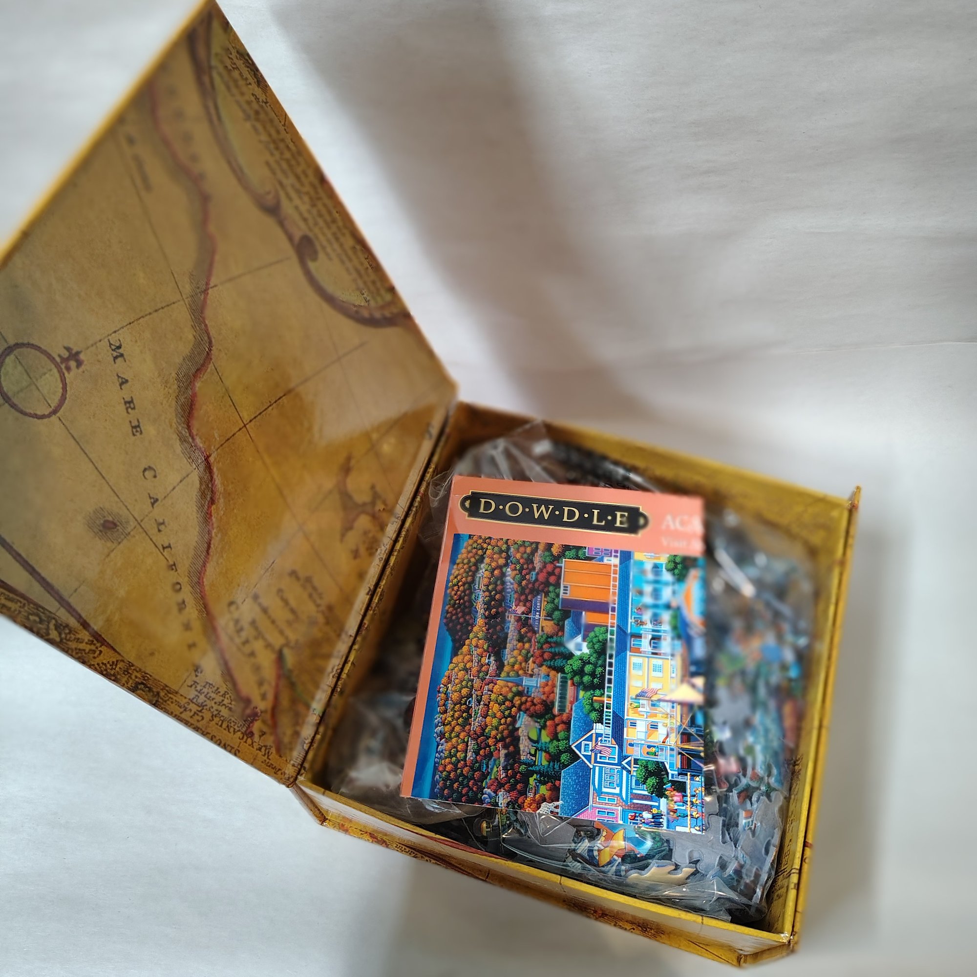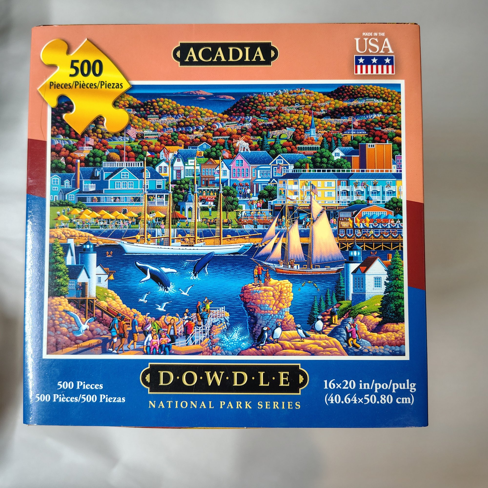 Nice 500 piece puzzles comes with cardboard sleeve and flip top box that velcros shut