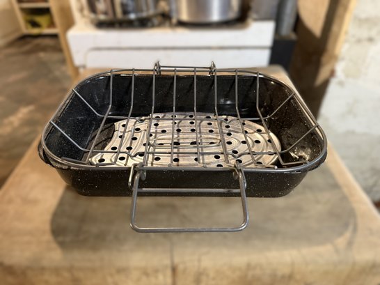 Just in time for the holidays - a well-kept deep roasting pan perfect for your turkey, ham or roast, with aluminum insert and handled cradle for easily lifting your roast out of the pan.