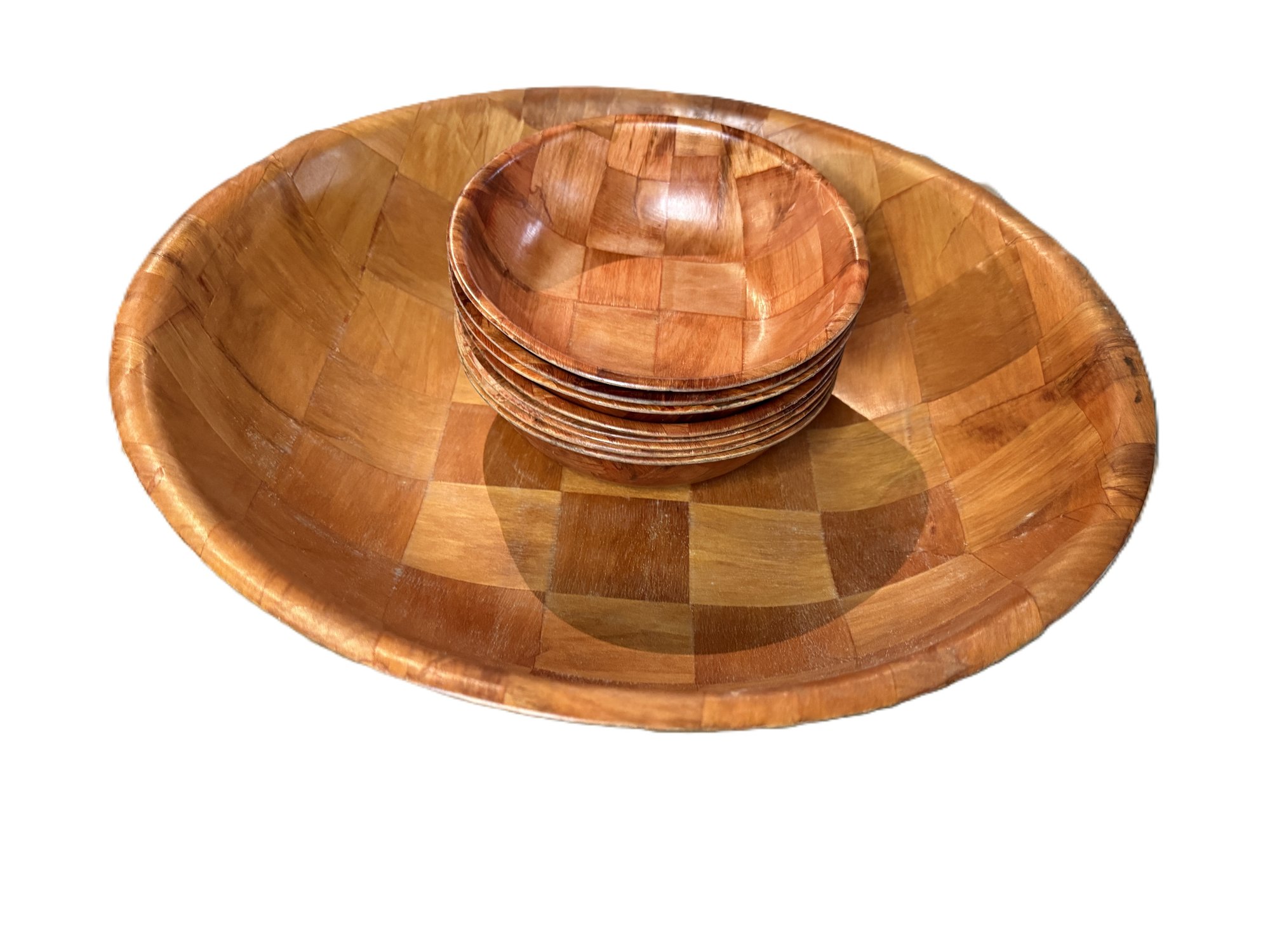 Extra large Formosa wood salad serving bowl with eight matching individual salad service bowls.