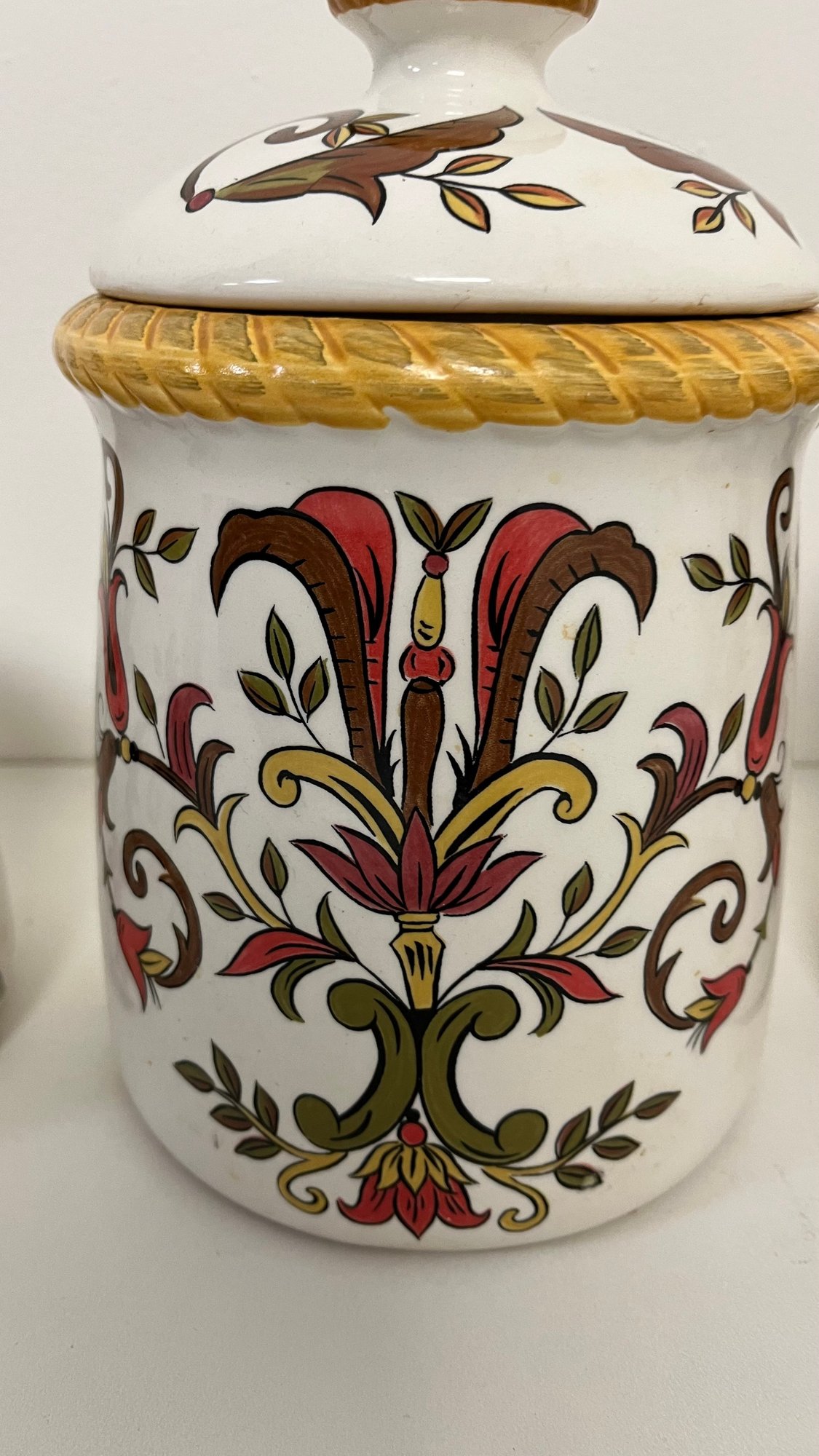 Pier one imports earthenware Oralia pattern set. Missing top on one. See photos for details and imperfections. Size small: 5” wide x 8” high with lid. Large size: 6” wide x 9” high with lid.