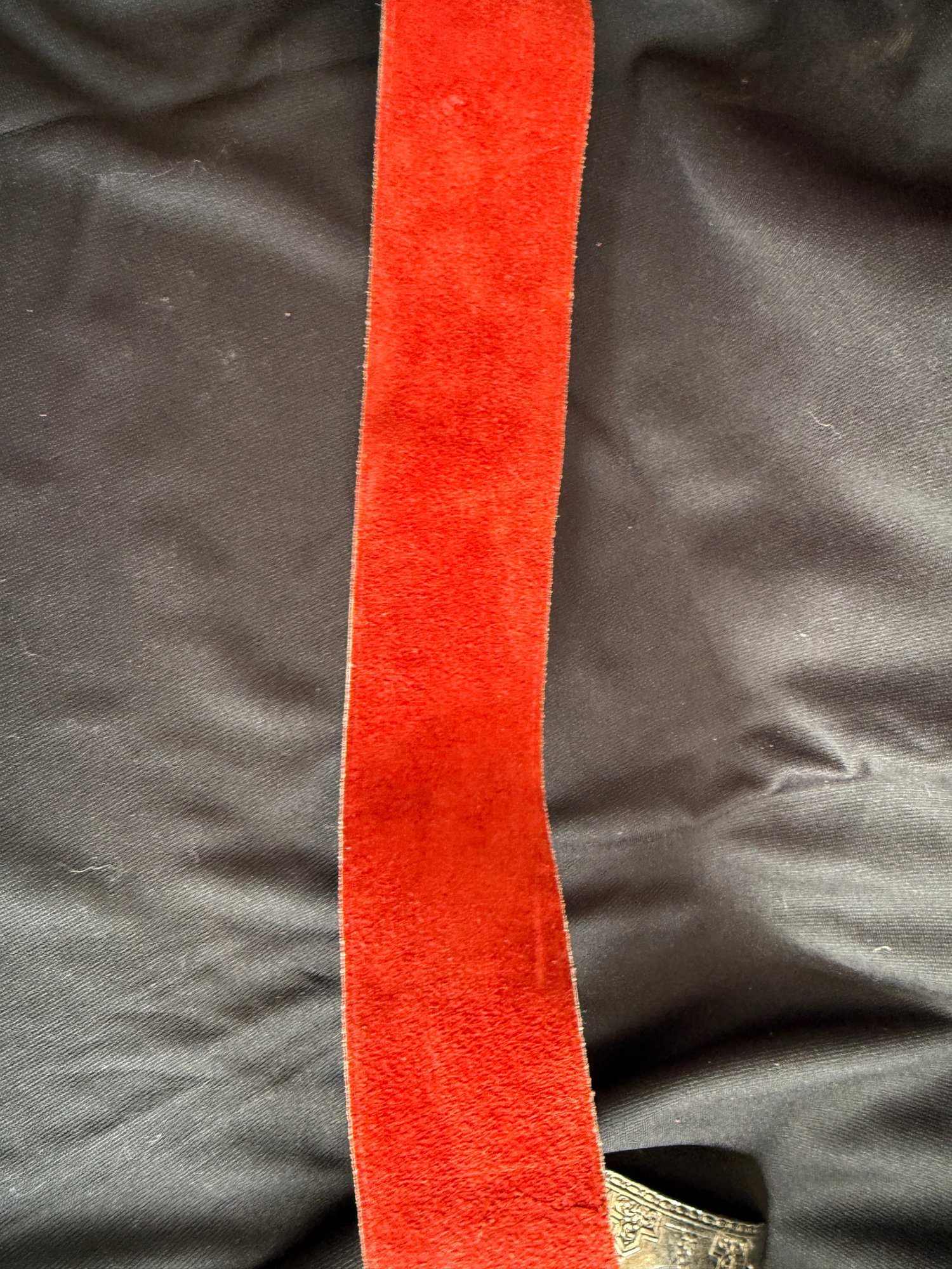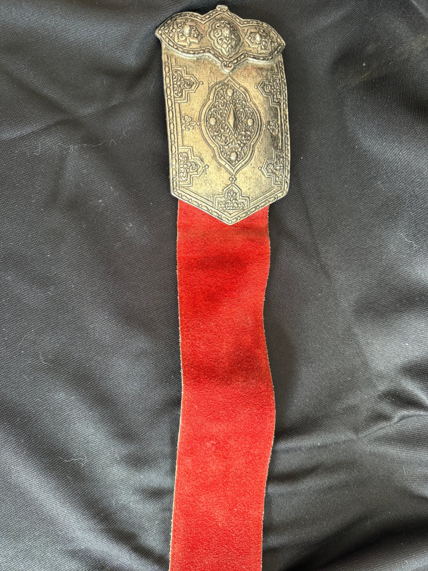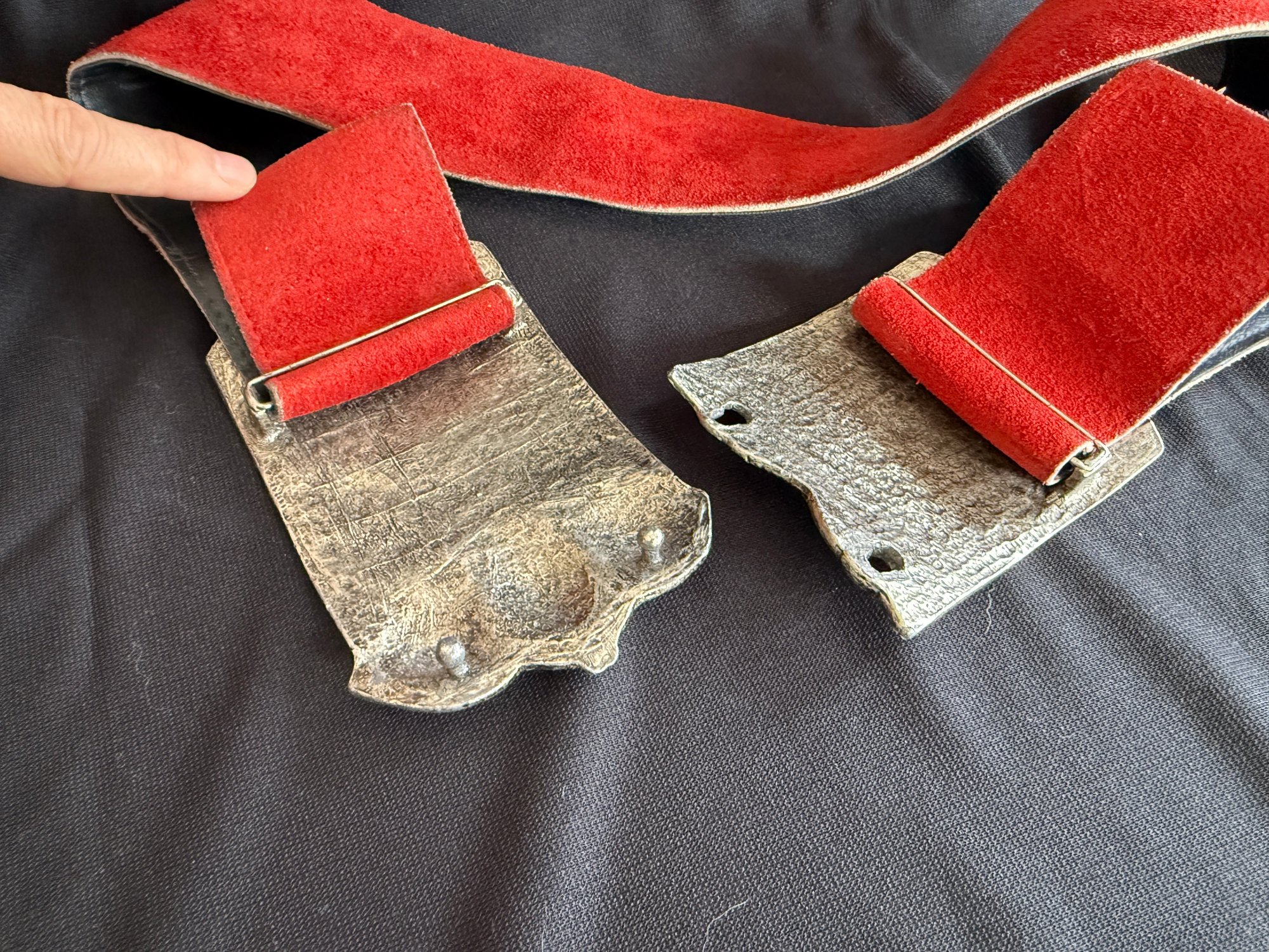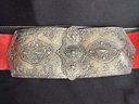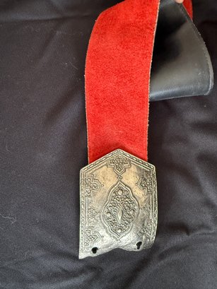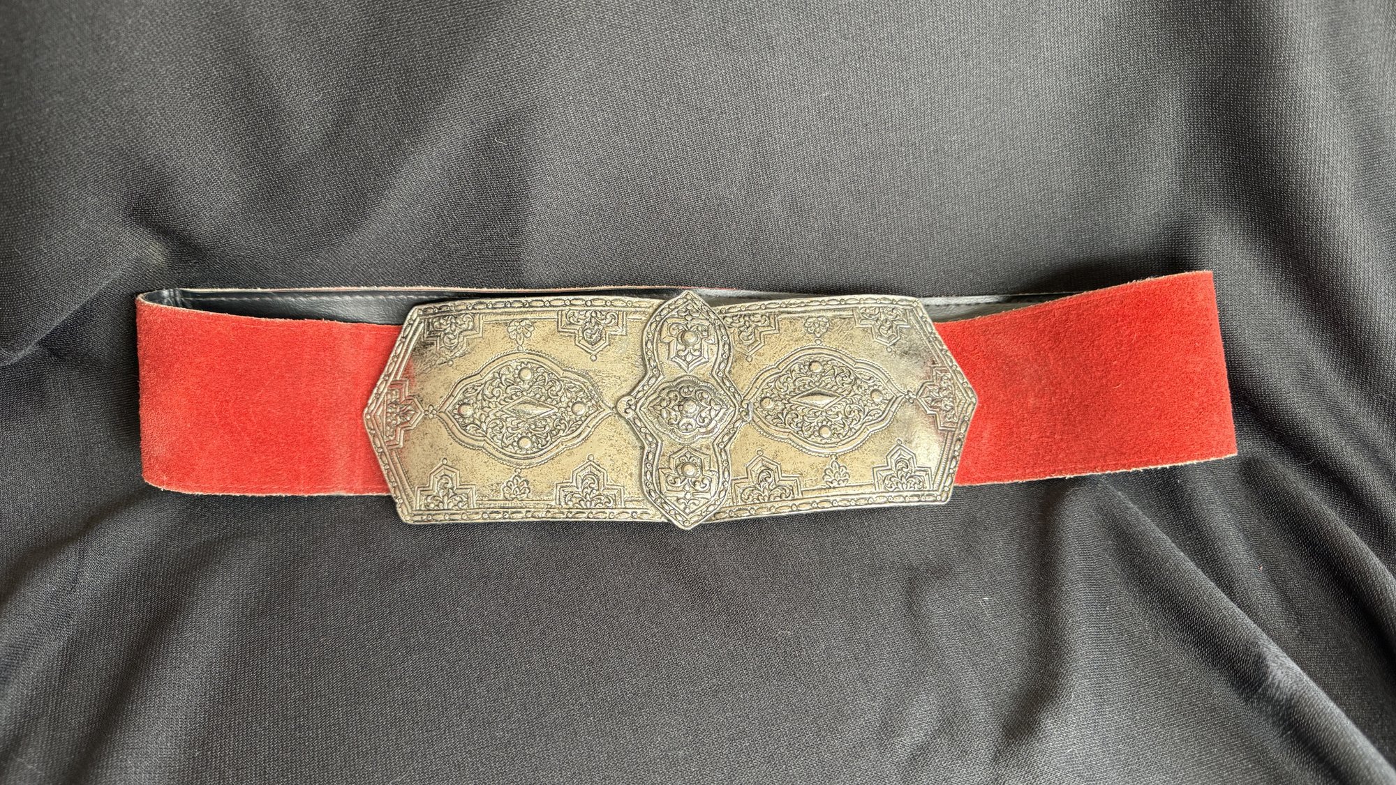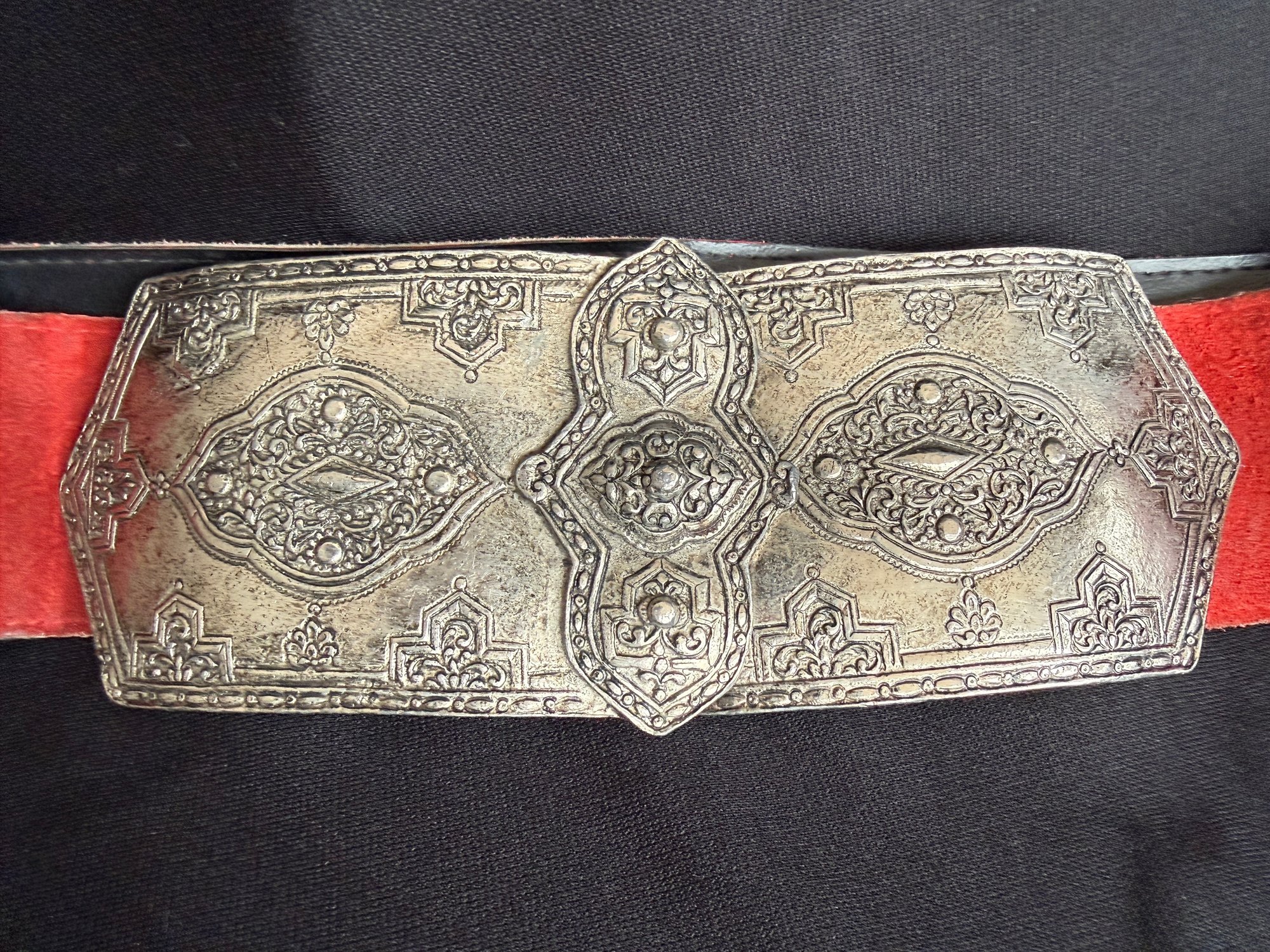 Exceptional 1980s plate style belt buckle likely in nickel with a chased Eastern inspired design and a red suede adjustable belt (currently measures 32").