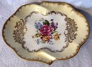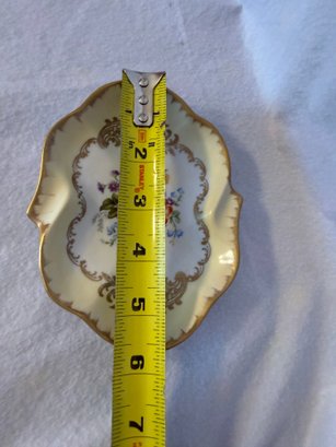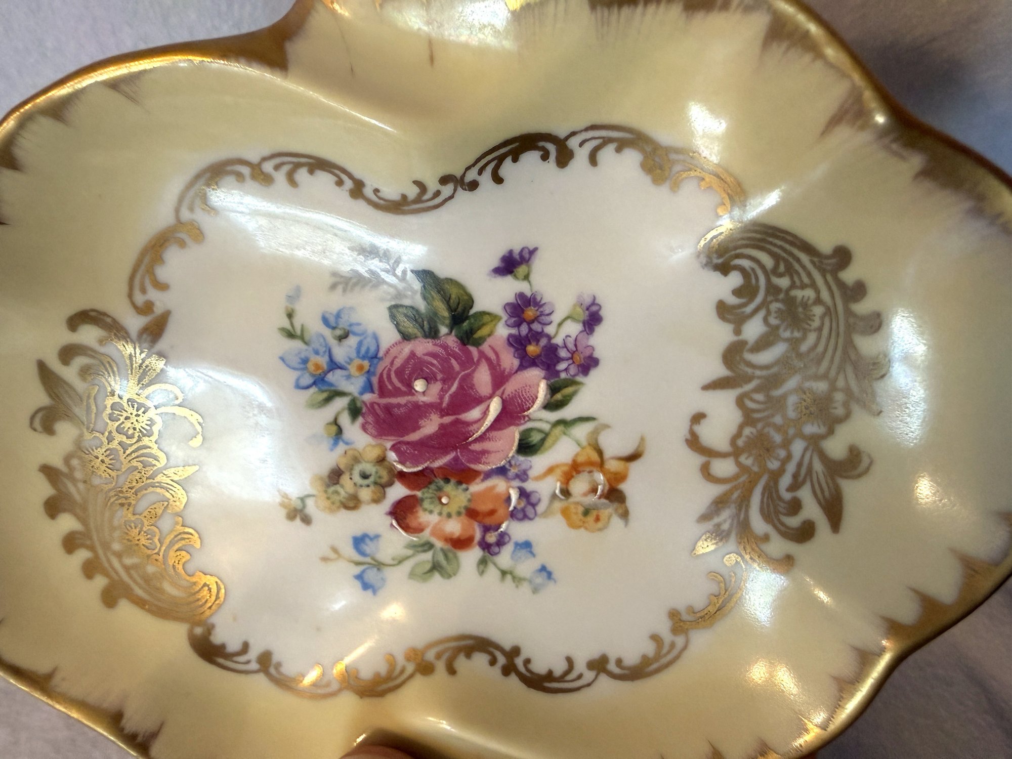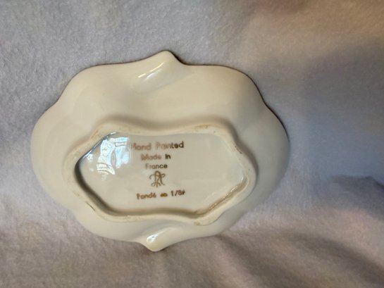 Gorgeous petite French hand-painted vintage trinket dish with a rose bouquet design at the center with tiny slip-painted and gold accents.