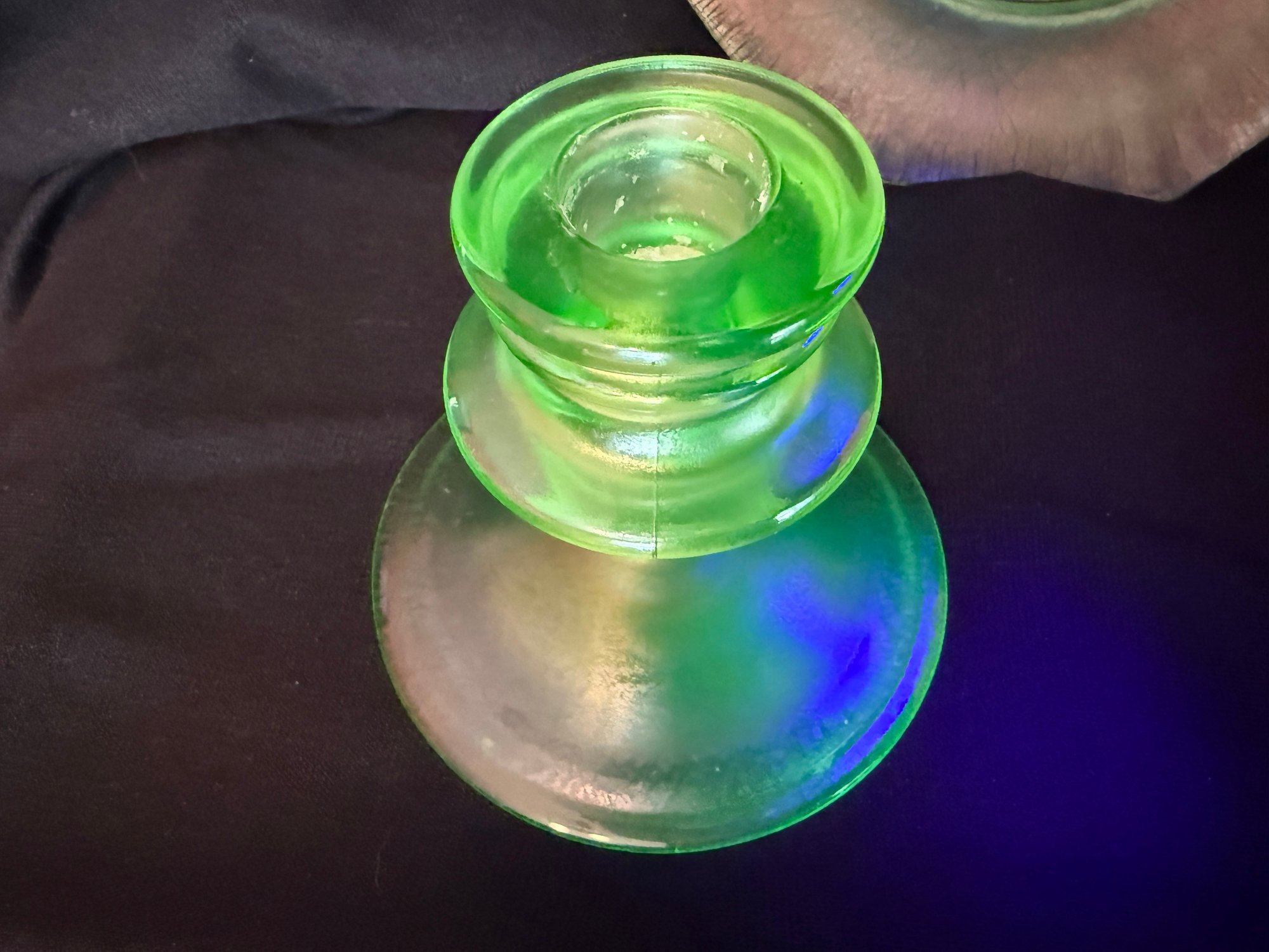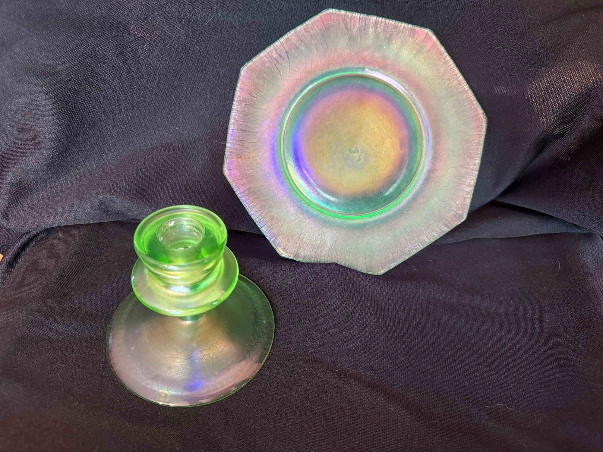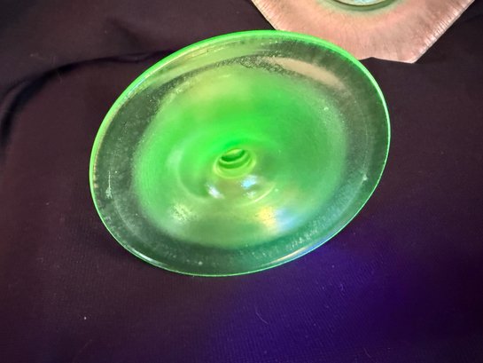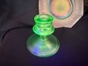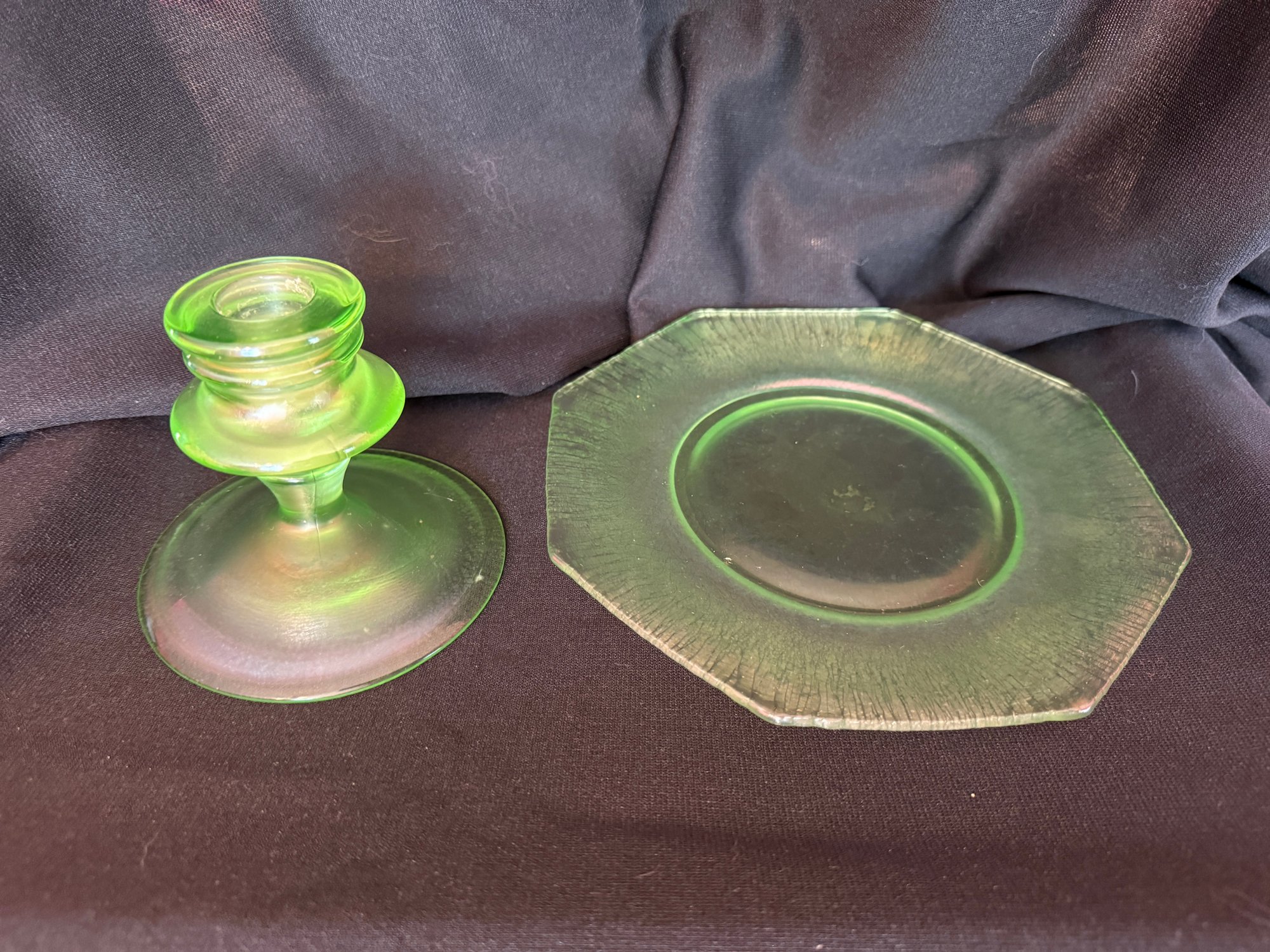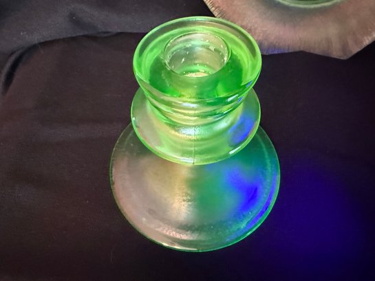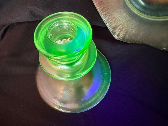 Wonderful Depression-era frosted uranium glass duo including a single candlestick and a iridescent octagonal dish or saucer. The photos were primarily taken under a black light mini flashlight, the last group photo shows them in natural lighting.