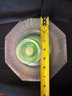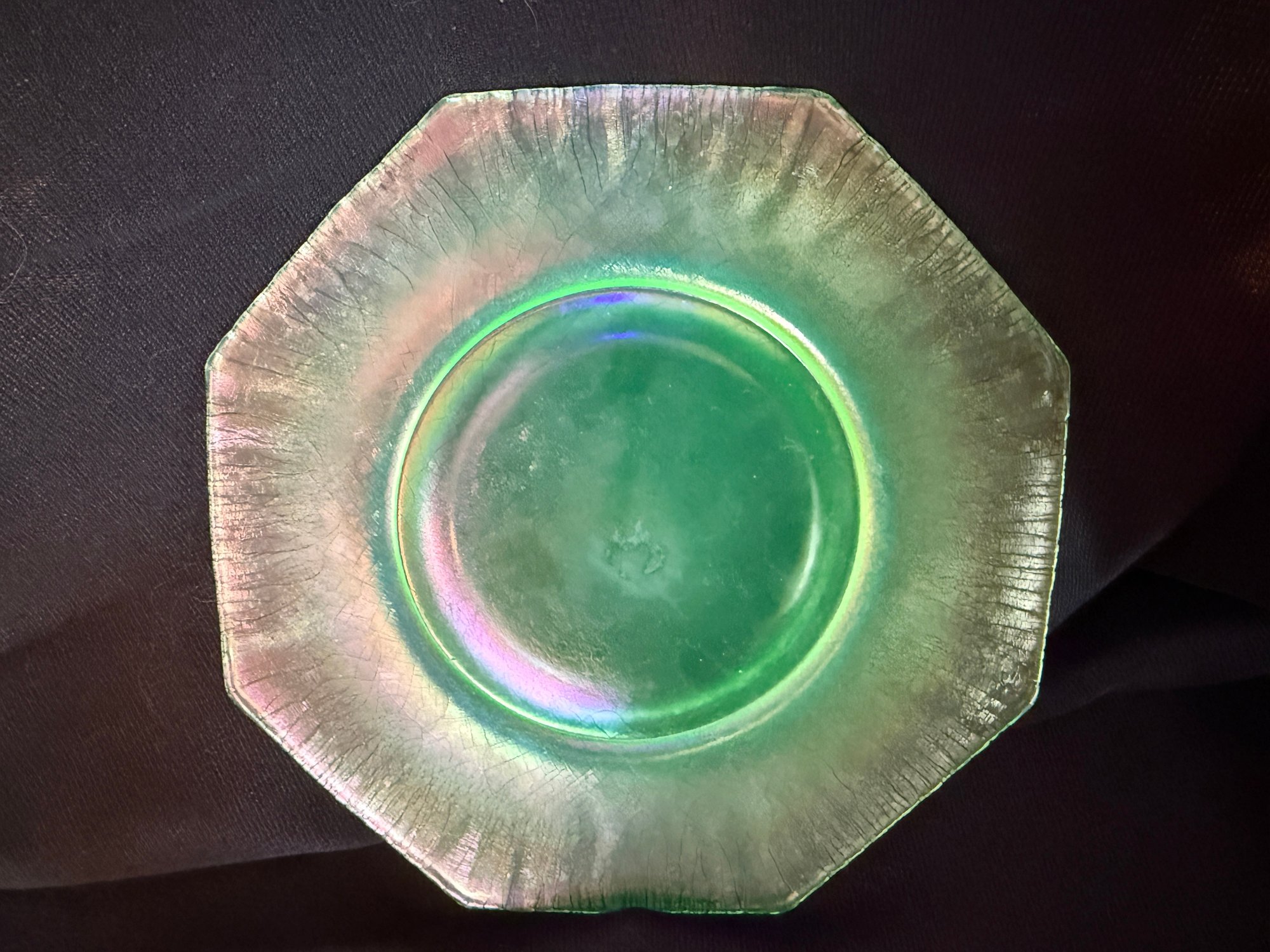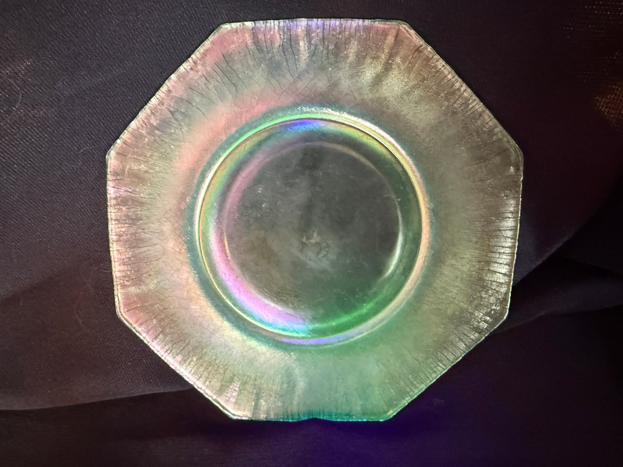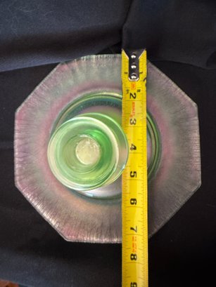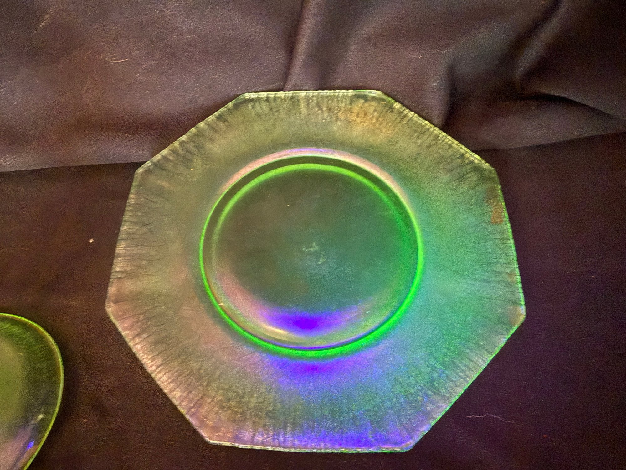 Wonderful Depression-era frosted uranium glass duo including a single candlestick and a iridescent octagonal dish or saucer. The photos were primarily taken under a black light mini flashlight, the last group photo shows them in natural lighting.