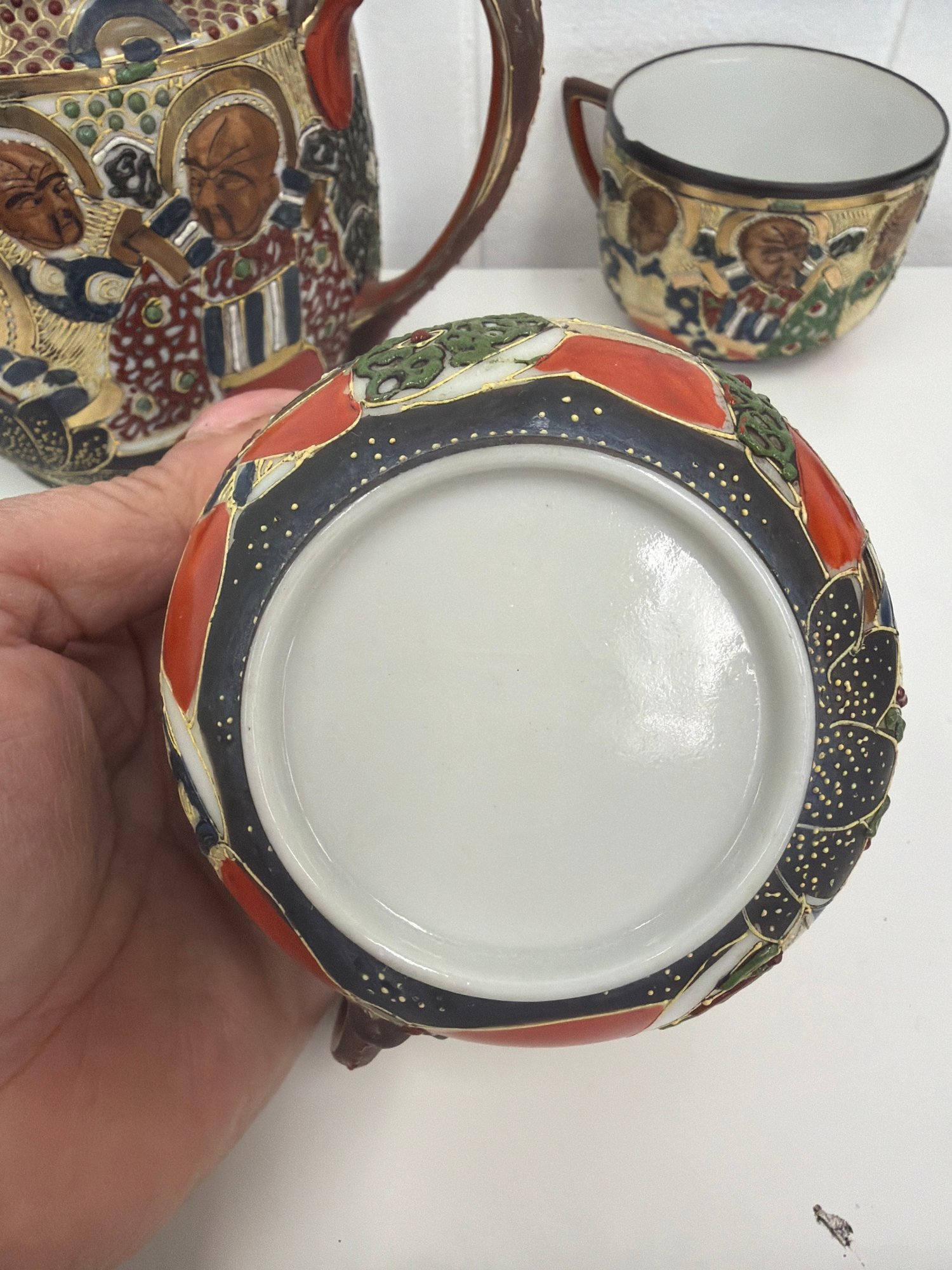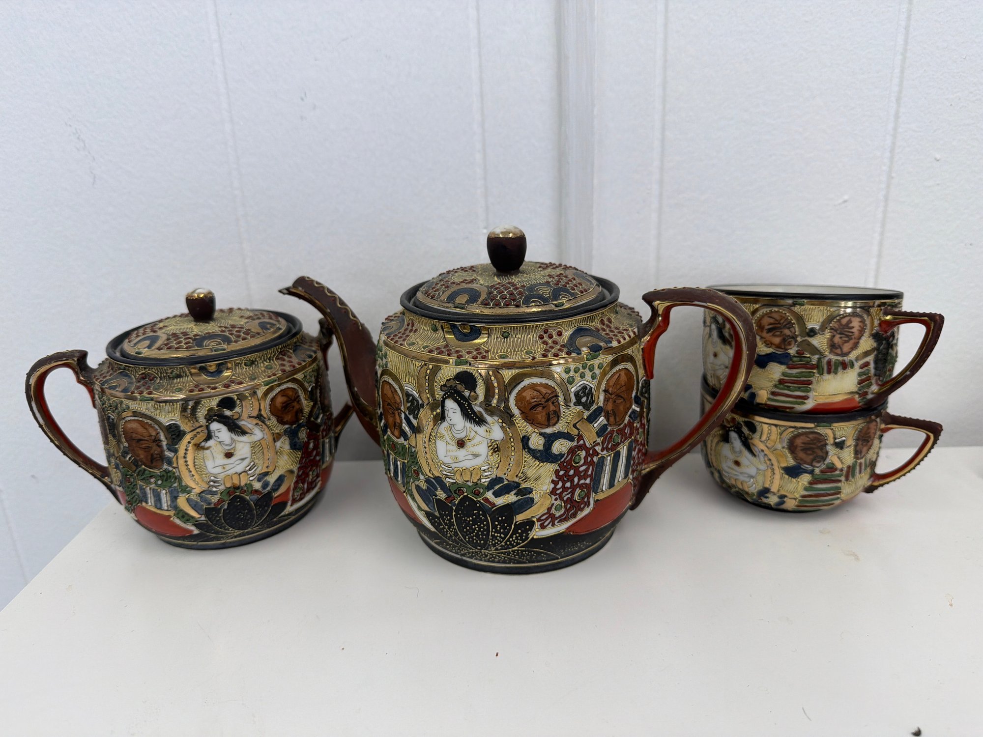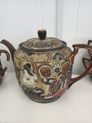 These sets, often hand painted with scenes of immortals, geishas or rulers were typically produced in the mid 20th century for export
