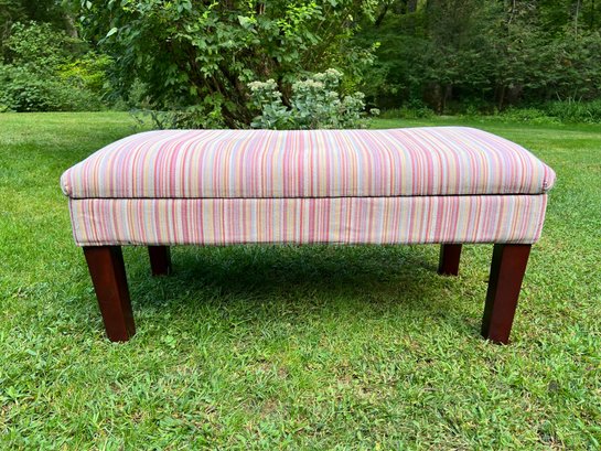 The multipurpose bench fits nicely beside dining tables, at the foot of a bed, entryway and many rooms. Its comfy seat features thick, upholstered fabric in a beautiful red, pink and grayish blue design that adds a bright splash to existing decor. Dark legs to finish the decor.