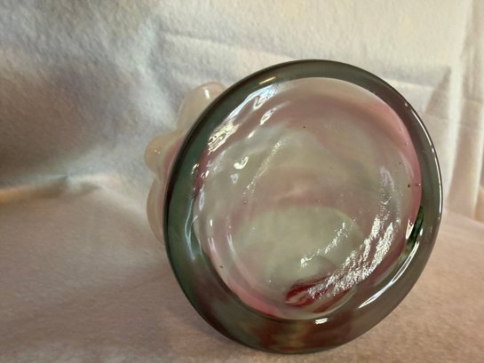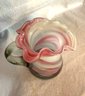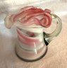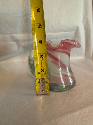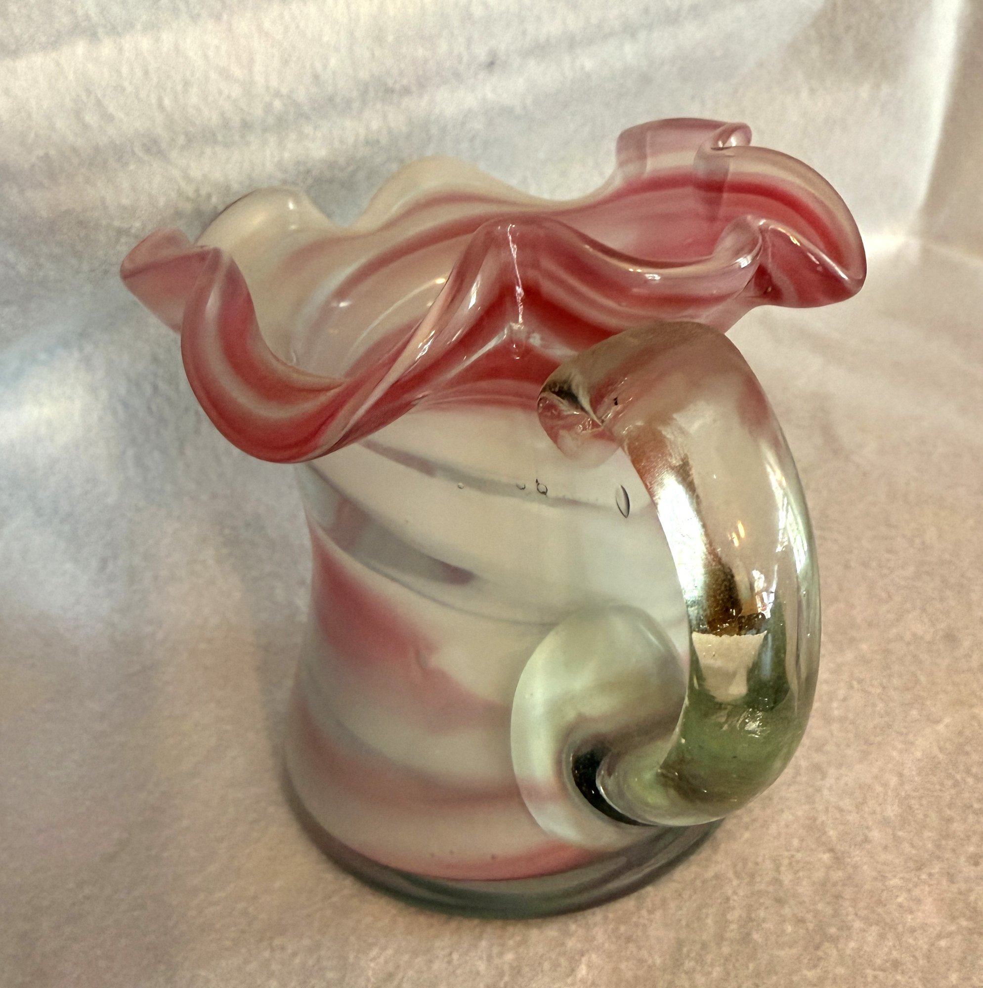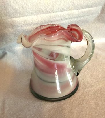 Tiny art glass pitcher with a pink and white optic swirl pattern.