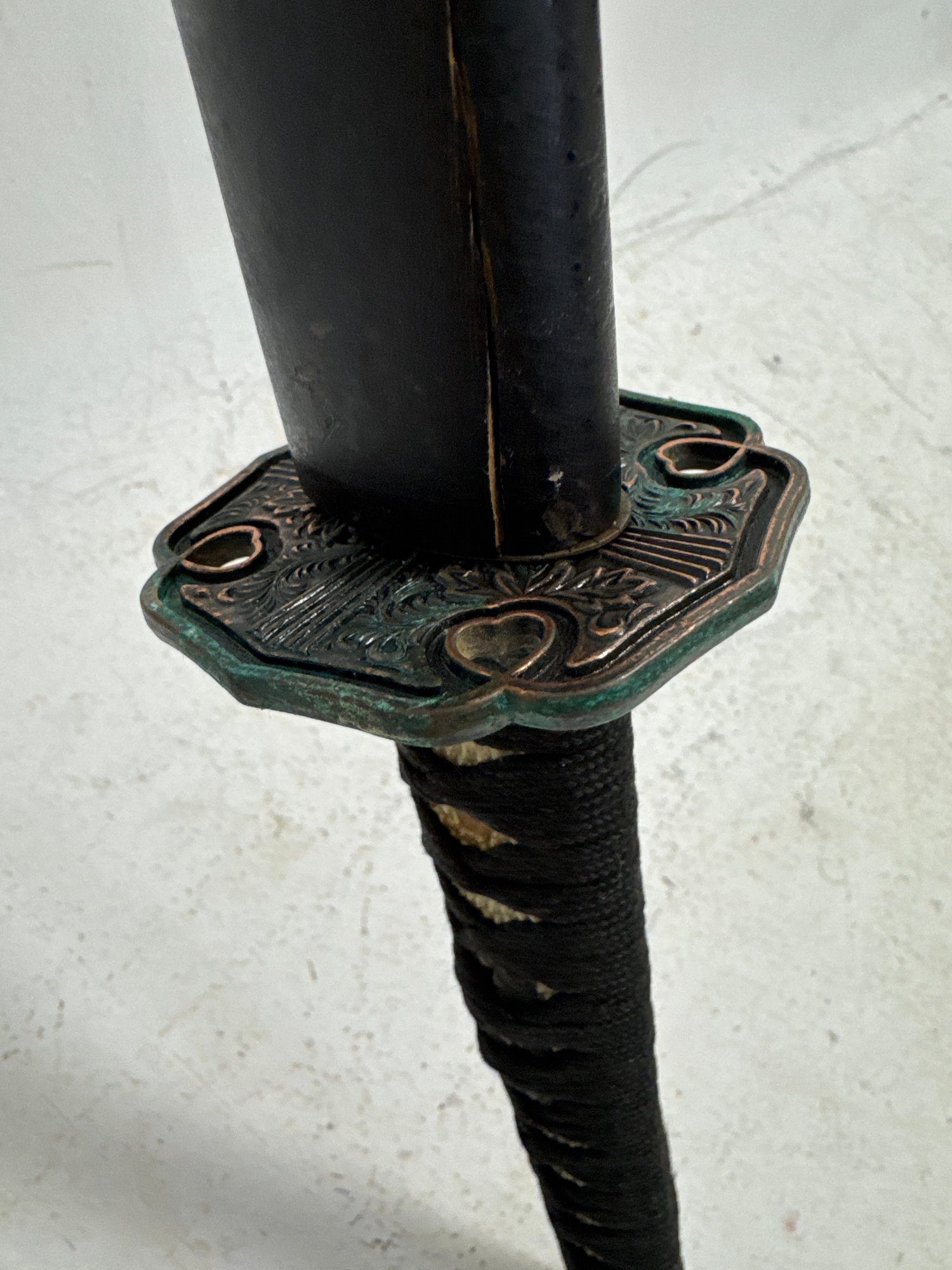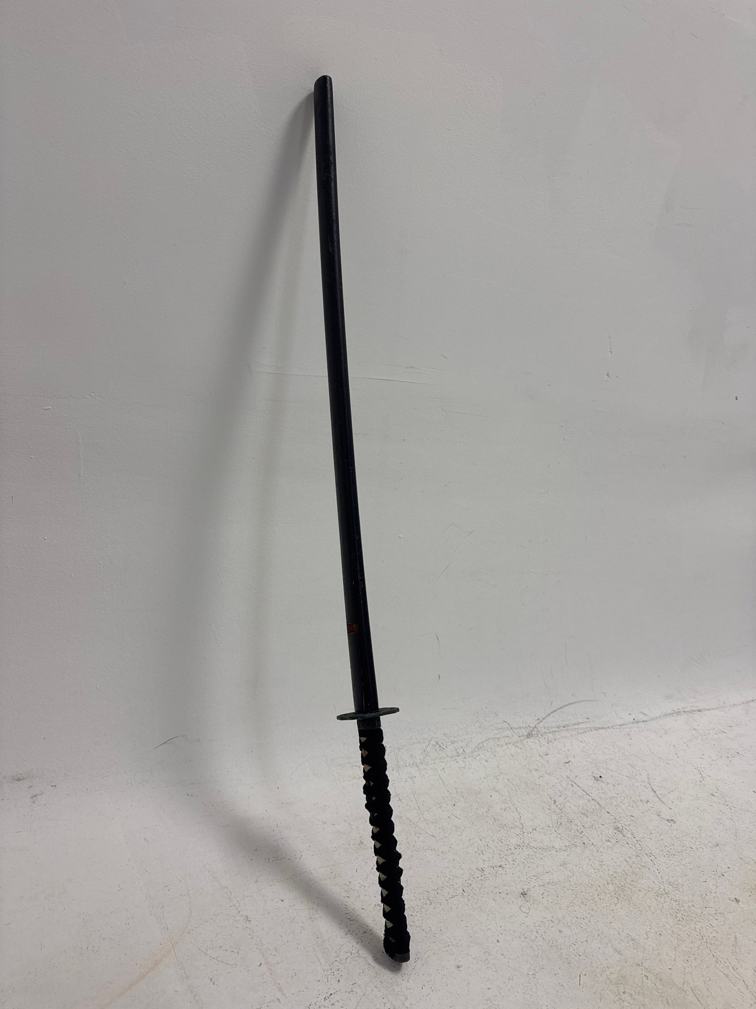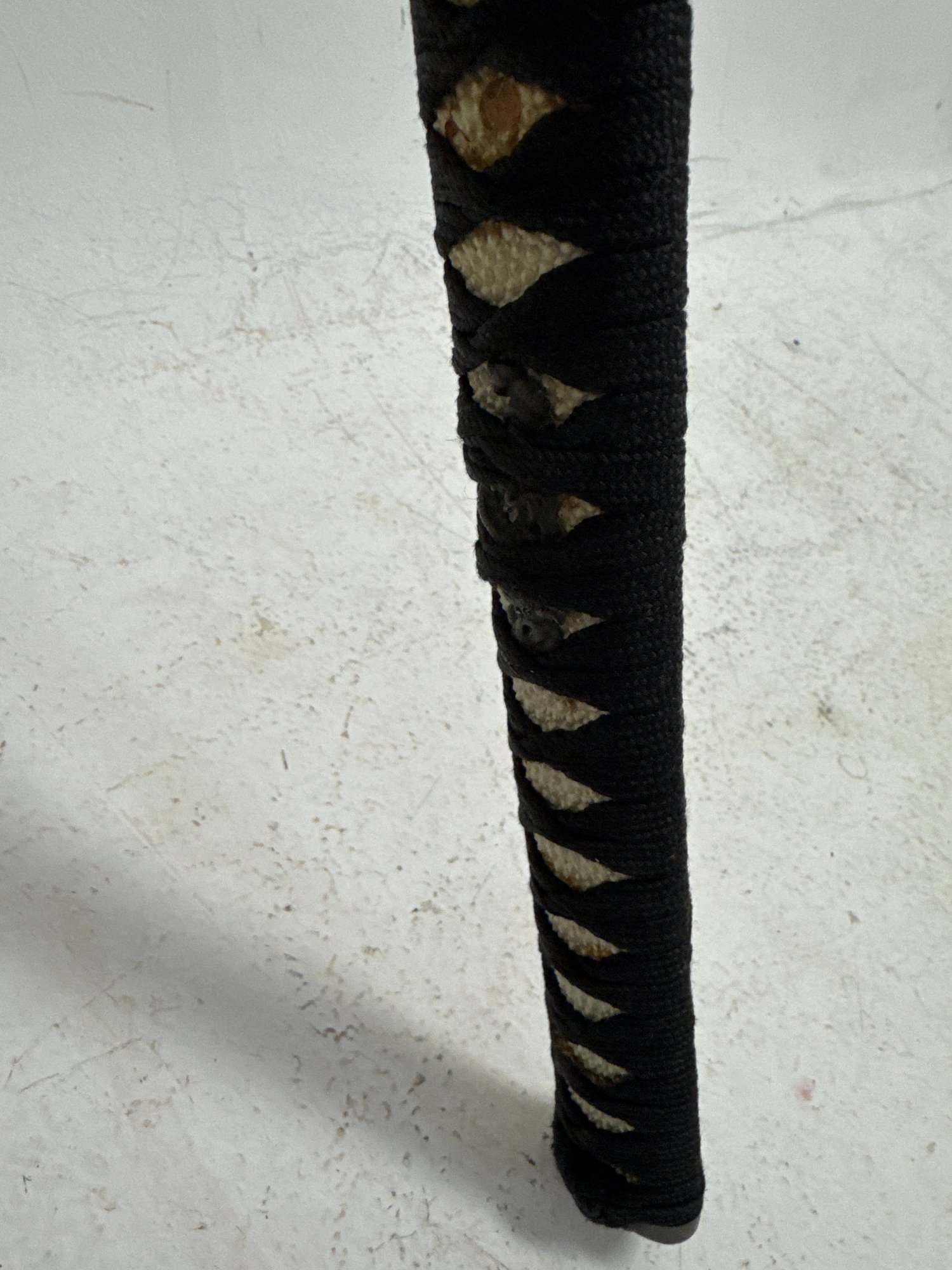 Katana, A Type Of Japanese Samurai Sword, Featuring A Traditional Black Handle Wrap Over A White Rayskin Textu