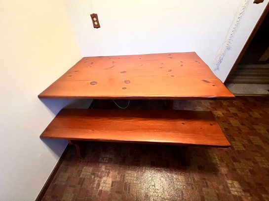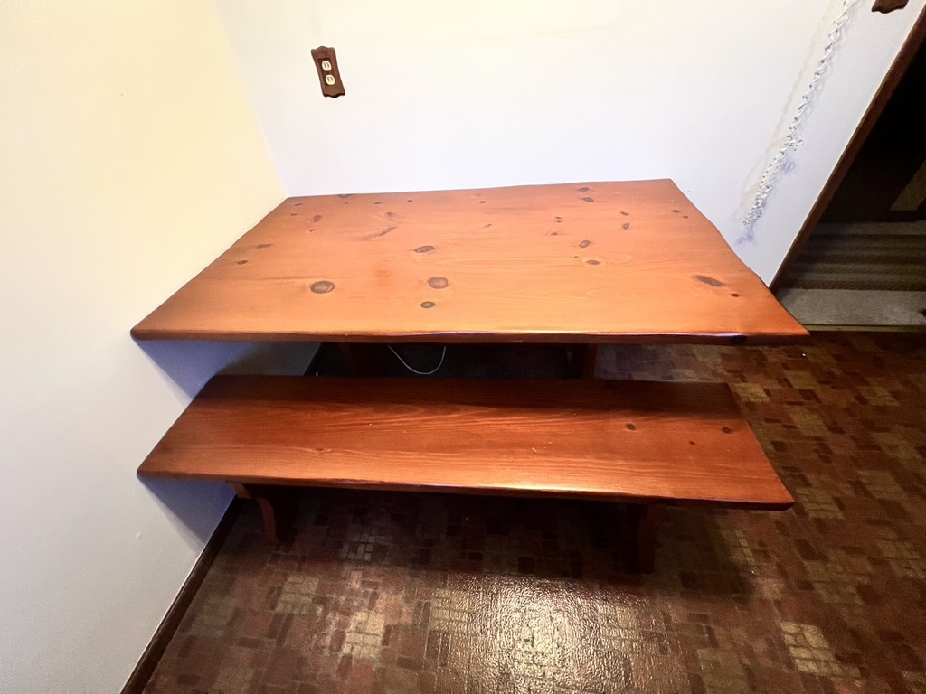 Knotty pine picnic style Trestle table w/2 benches, Wonderful! This is 5' long, 29" high, and 29" deep, the 2 benches are each 5' long, x 13" deep x 18" high. Super under a window, great against a wall, the benches nest into the table for ease of storage, making a great serving table. Lovely condition.