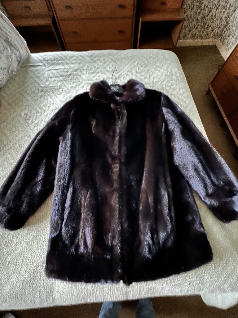 ladies black mink zip jacket, approx size 4-6, thigh length, snug fit around the bottom to your thighs, and arms, with a full body, zipper, and collar, nice condition