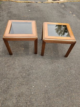 Glass top end tables with wood frame, measures 26 x 26" and 21-1/2" tall