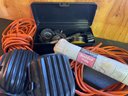 Plastic Tool Box With Contents, 2 Extension Cords, Knee Pads And New Rope