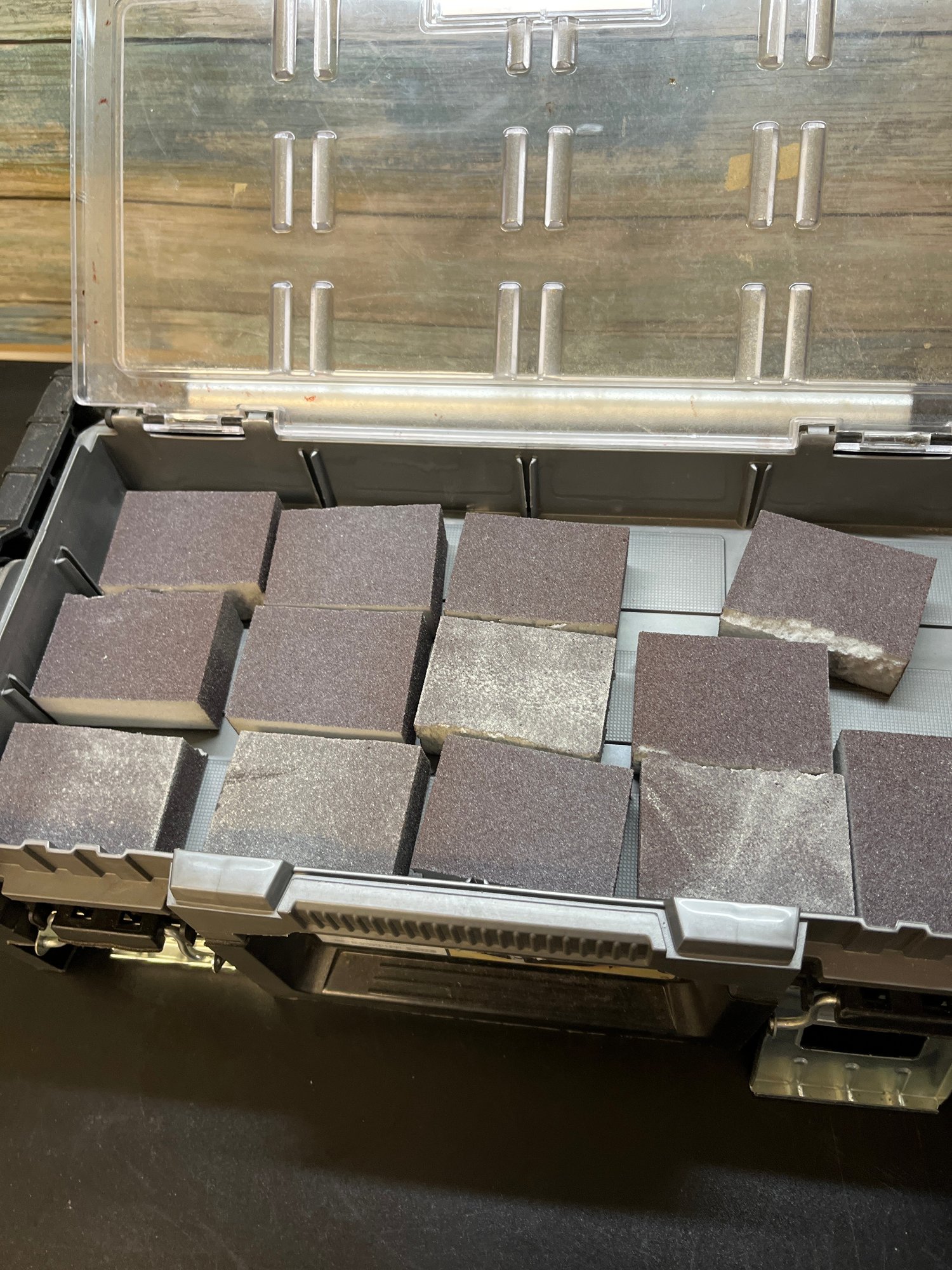 With pieces of sanding block, nine small hammers and three pairs of needle nose. See pictures for details.