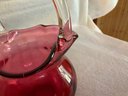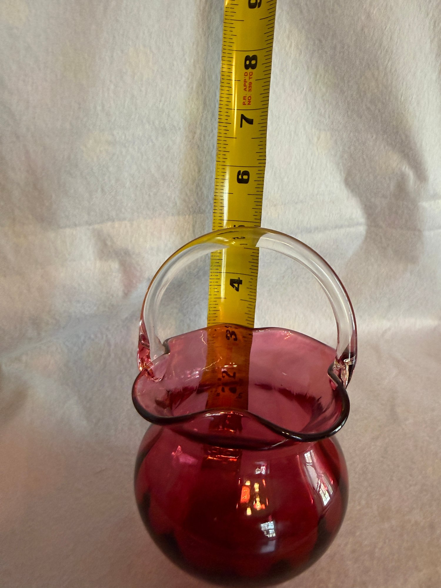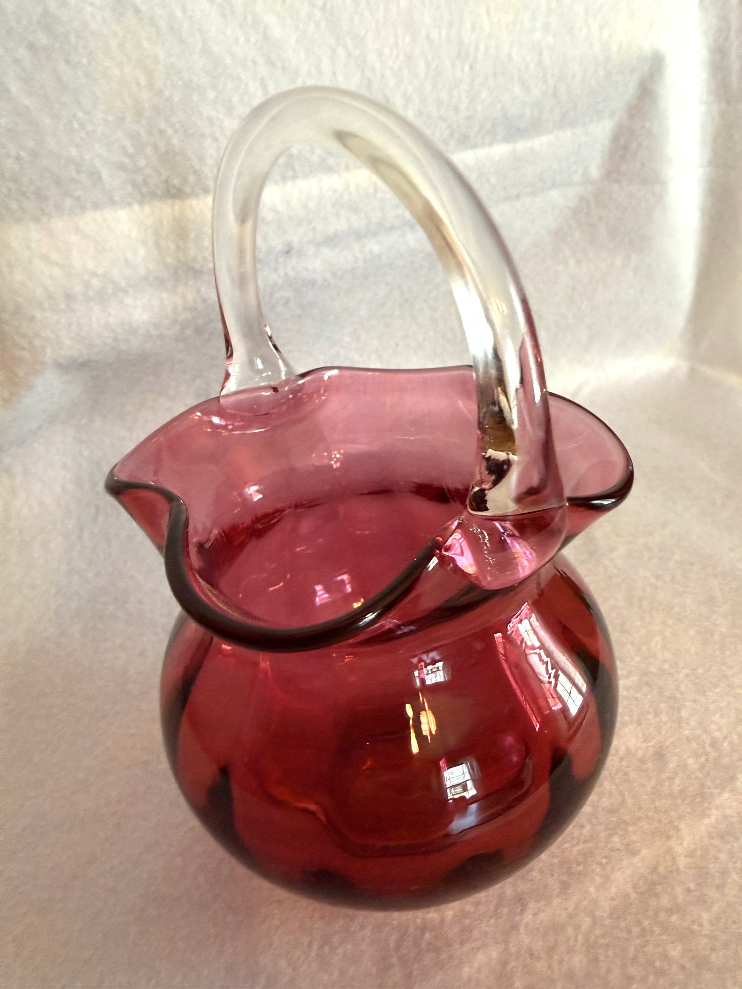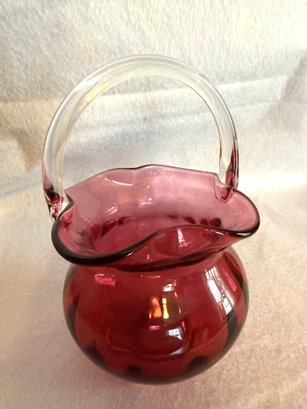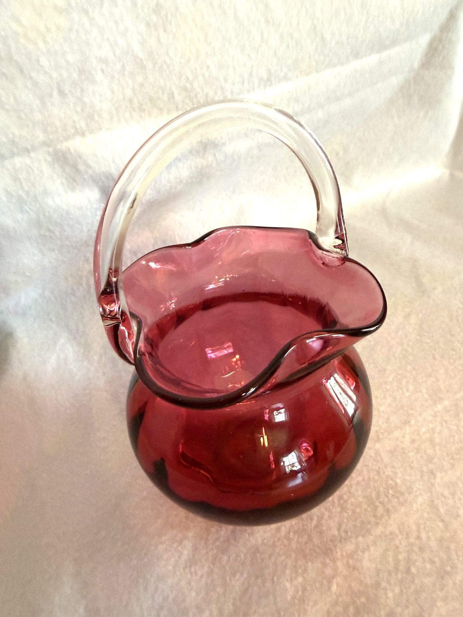 Sweet little glass basket with ruffled edge and colorless applied handle, by Pilgrim Glass.
