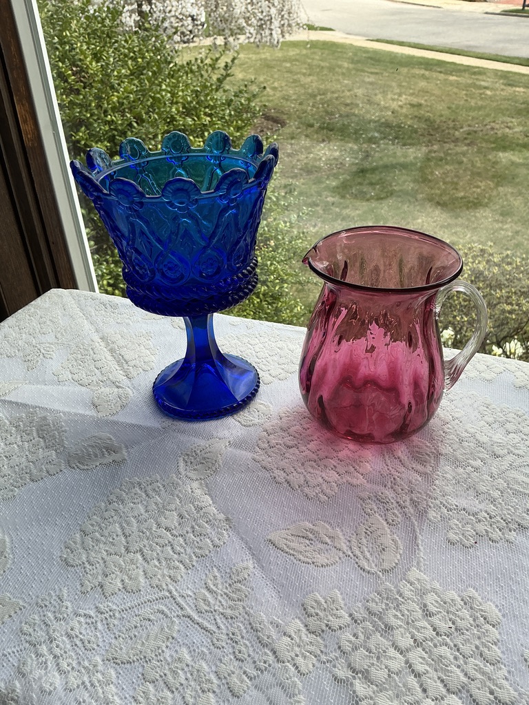 Pilgrim cranberry pitcher with applied clear reeded handle, Tiara Hapsburg, by Fostoria, candy dish, missing lid, in classic Cobalt Blue, in otherwise, both are in very good condition
