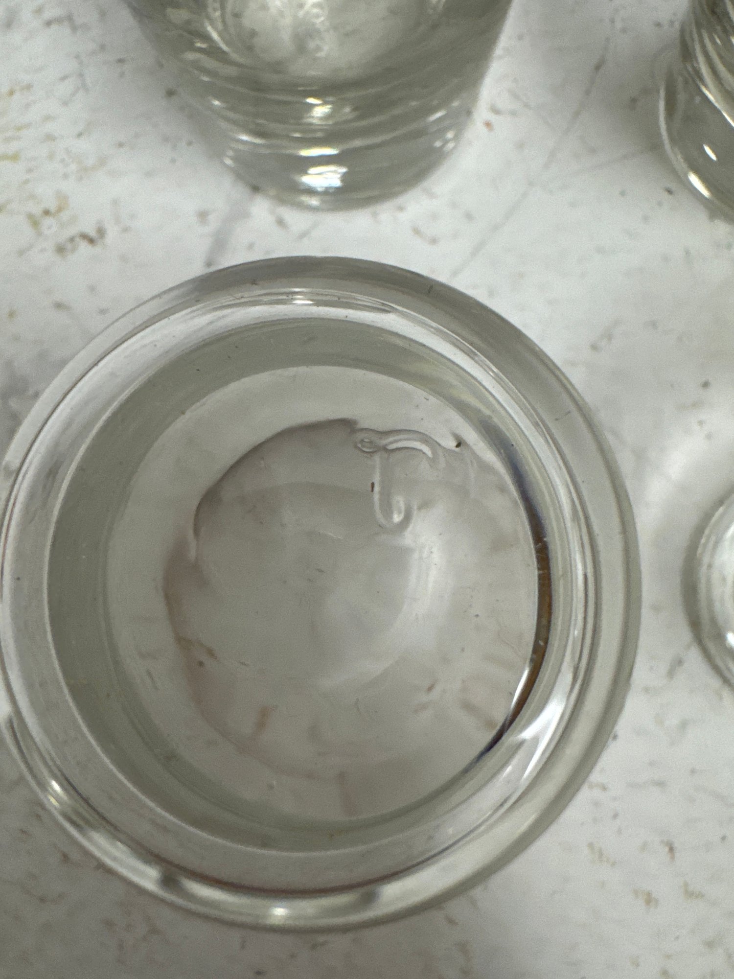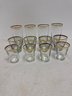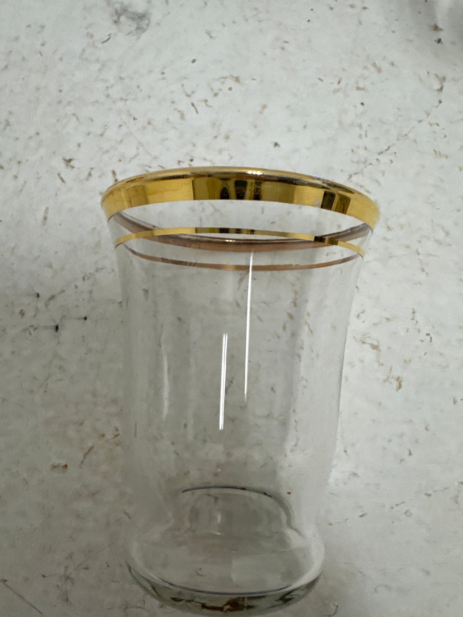 See pics for details. The tallest glass is 5 1/2 inches. The middle glass is 3 1/2 inches and the smaller glasses are 3 inches.