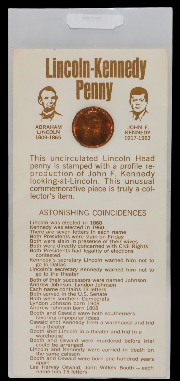 This uncirculated Lincoln Head cent is stamped with the profile reproduction of JFK looking at Lincoln.