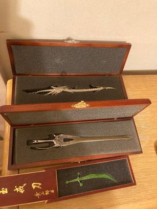one is a sword. other looks like it could be a letter opener, third is some sort of metal weapon