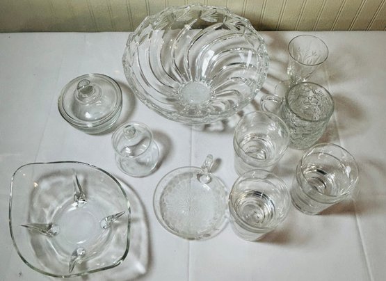 Lot Of Clear Glass - 2 Bowls, Glasses, Covered Jars And More