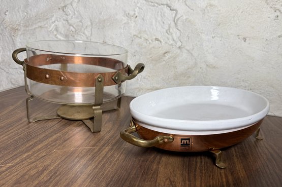European copper accented duo including a Nilsjohan! of Sweden copper handled and footed chafing dish and a Portuguese made Metalutil copper footed porcelain serving dish.