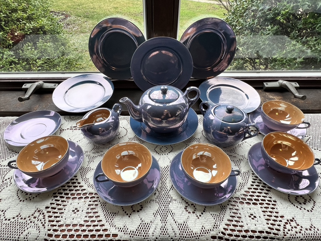 Lustreware tea service, note lid repair, chip on saucer, 5 tea cups,