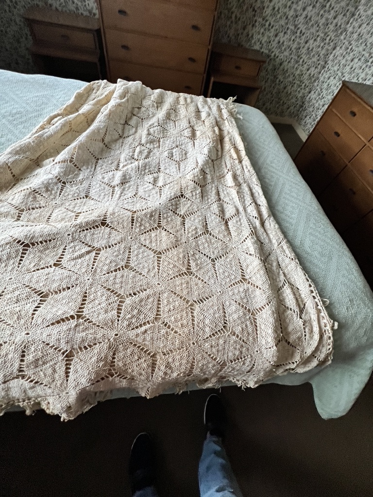 machine made linen bedspread with fringe, bone color, queen size, or large full