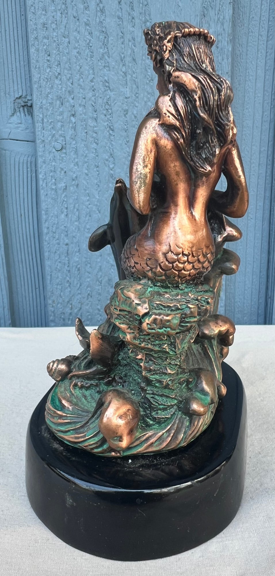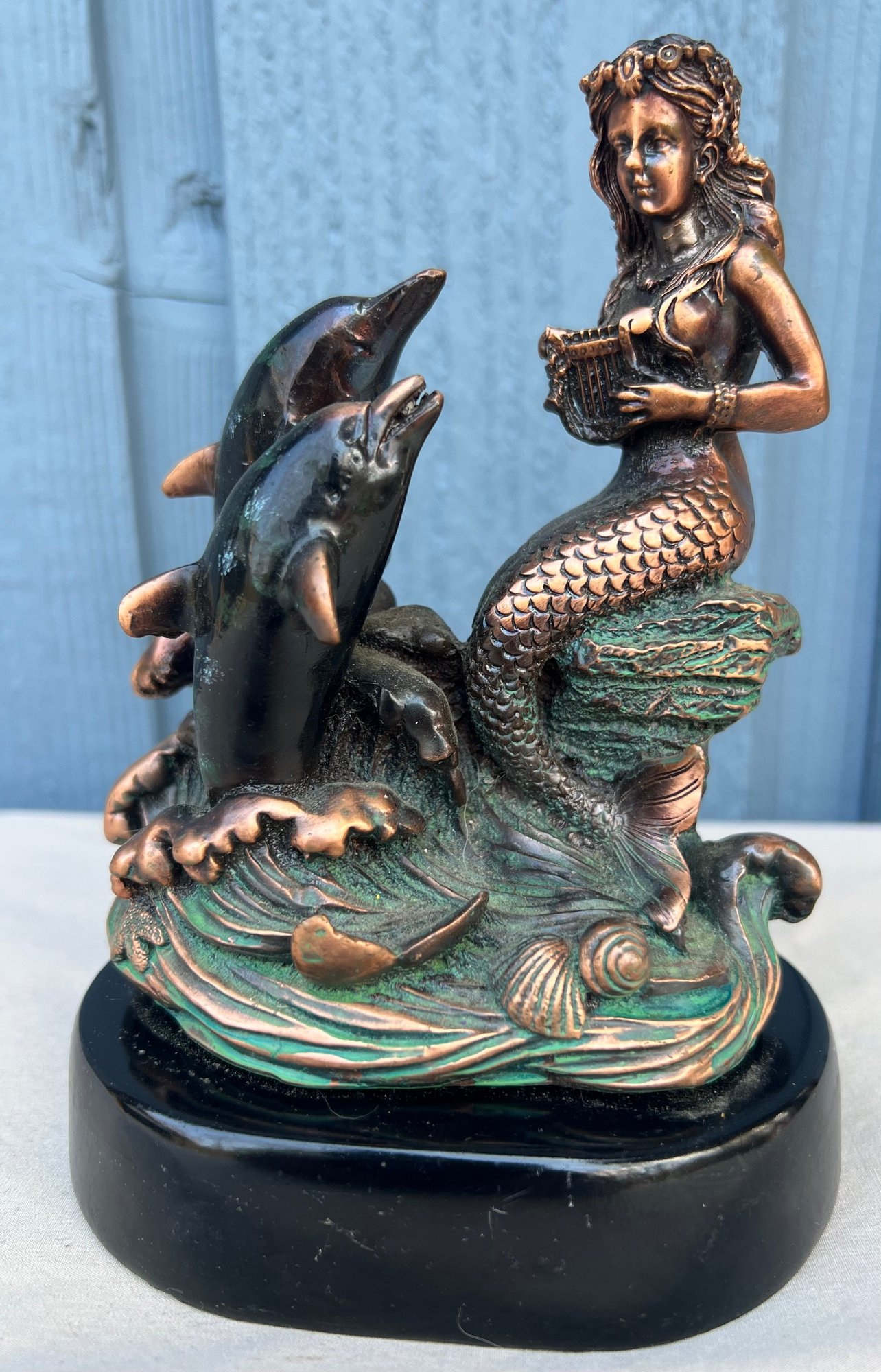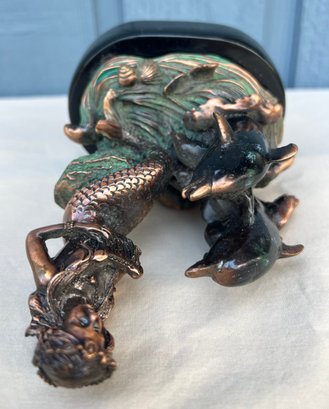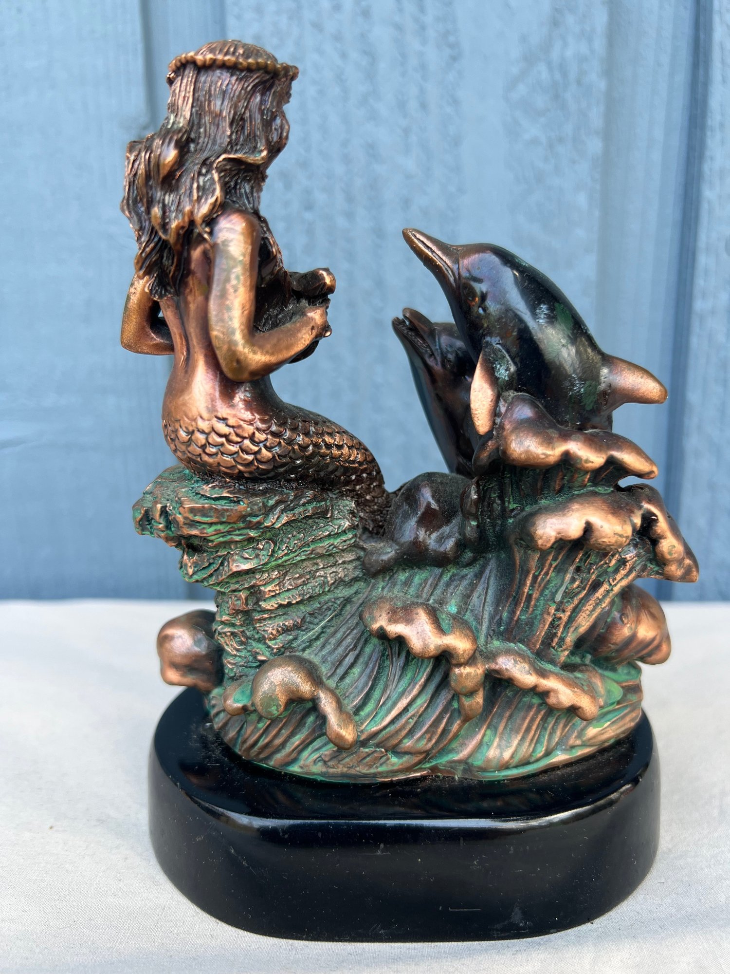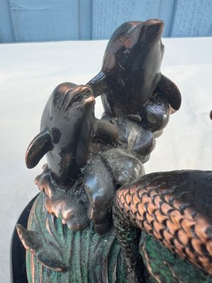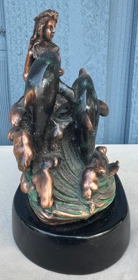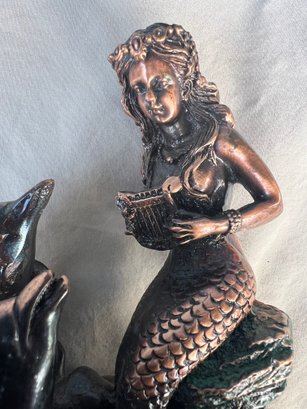 Mermaid with 2 Dolphins Figurine Statue decoration. The craftsmanship of this piece is superb, this piece is made of resin but it is heavy and may contain brass and/or copper.