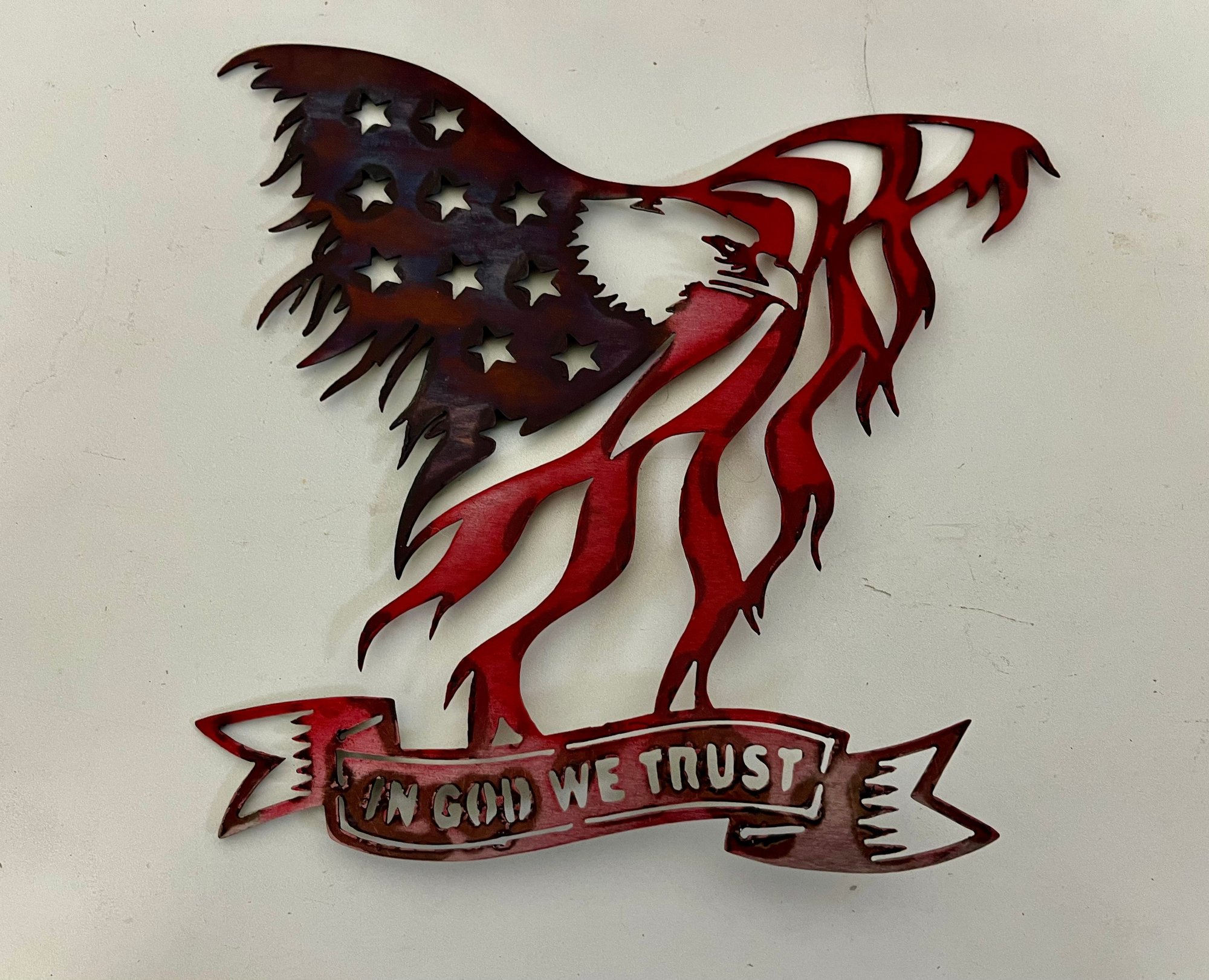 Heavy duty metal in God we trust sign. See photos for details and imperfections. Size: 12” wide x 12” high.