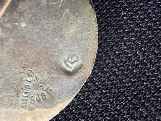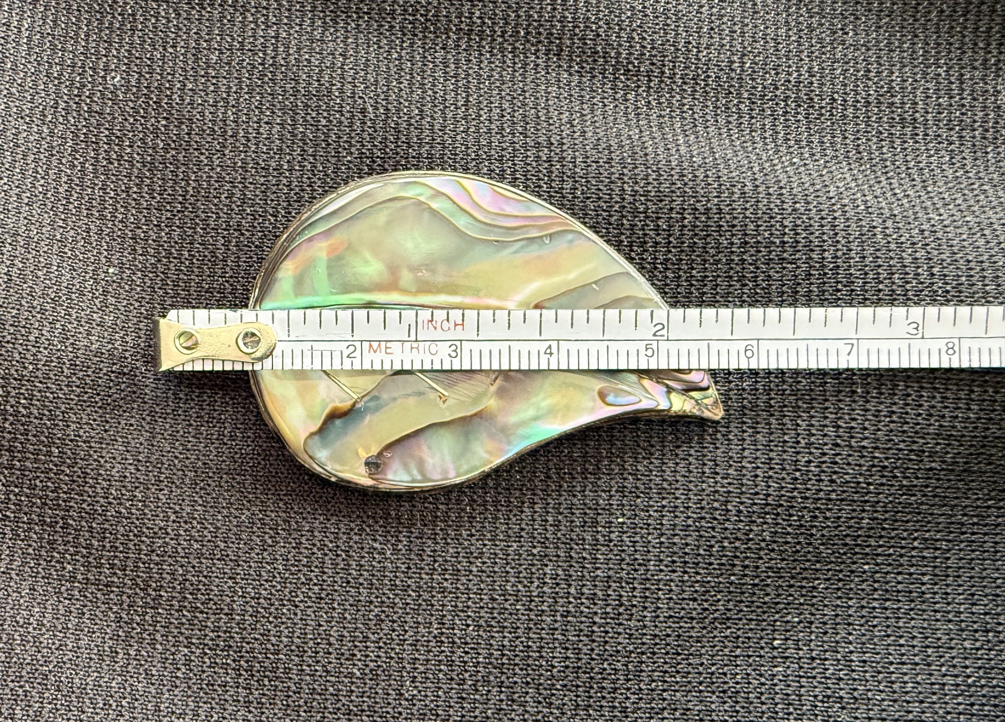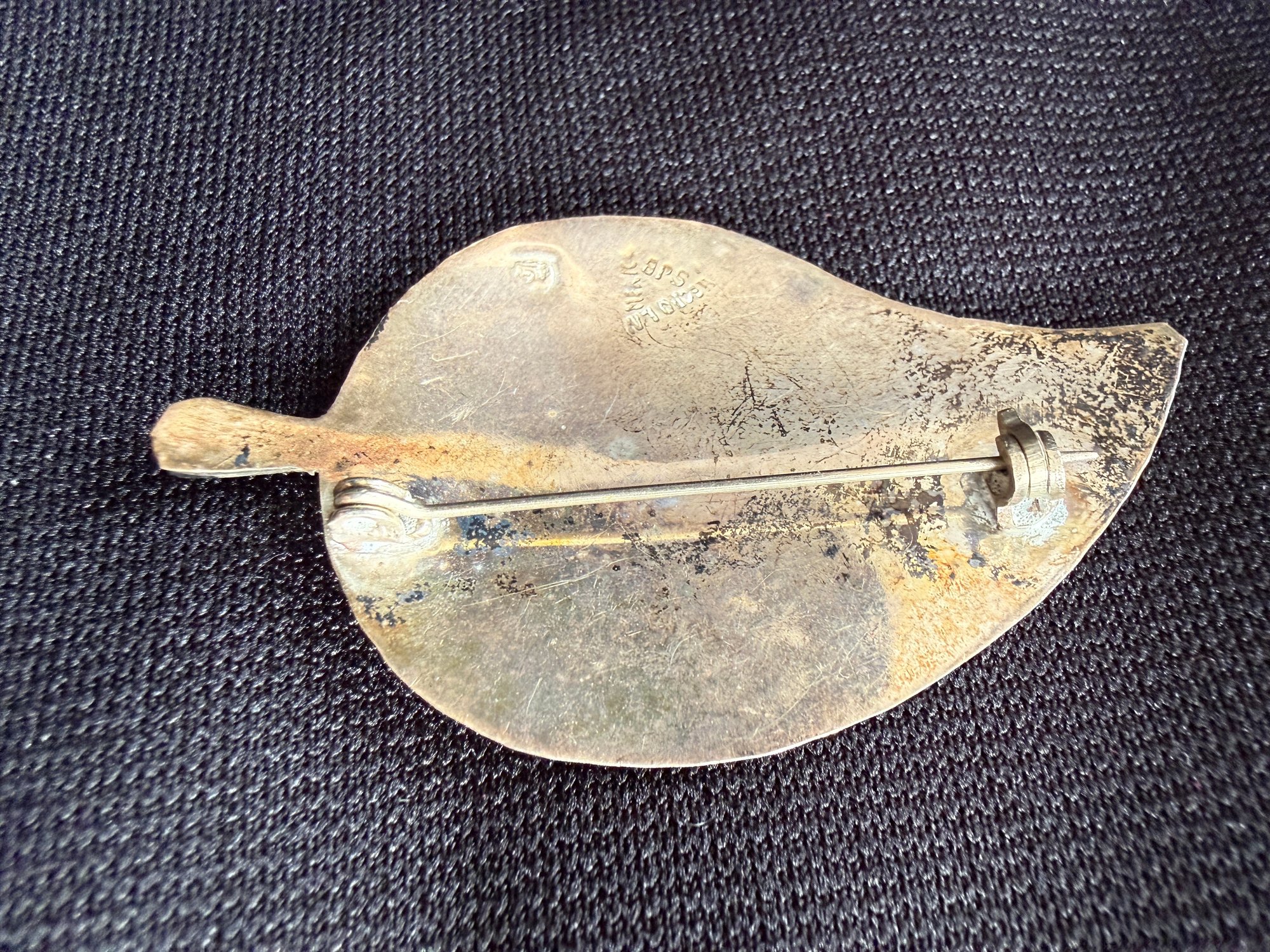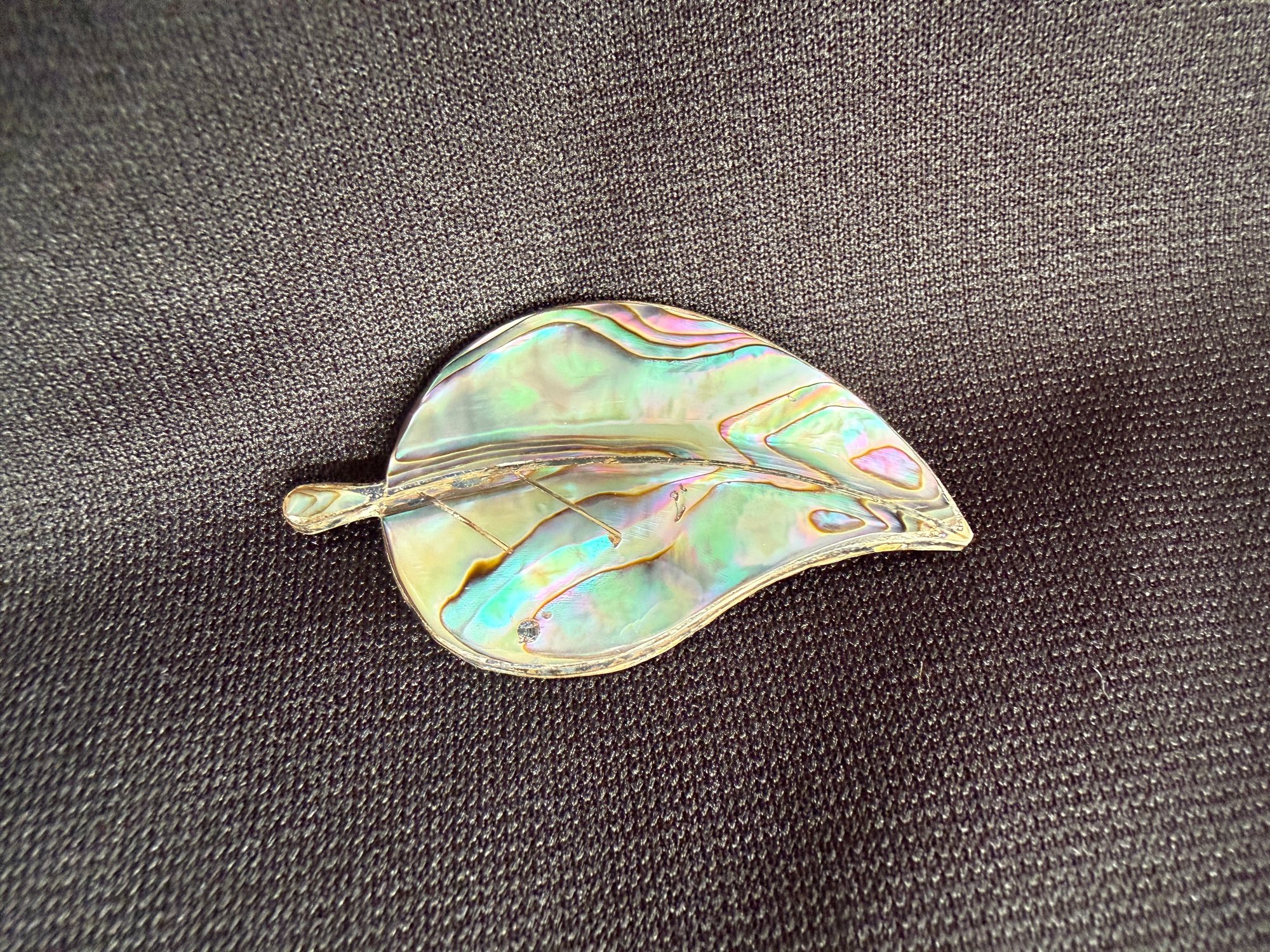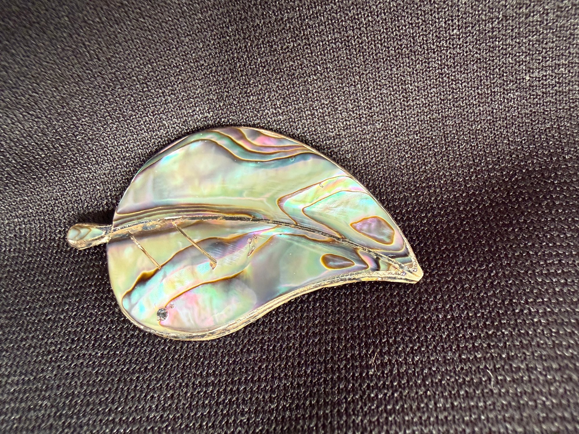 Nice little Mexican made abalone and silver leaf brooch, marked on the back "Hecho en Mexico" and "SJB" but does not show clear sterling marks - possibly unmarked silver or the mark has rubbed off.