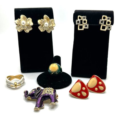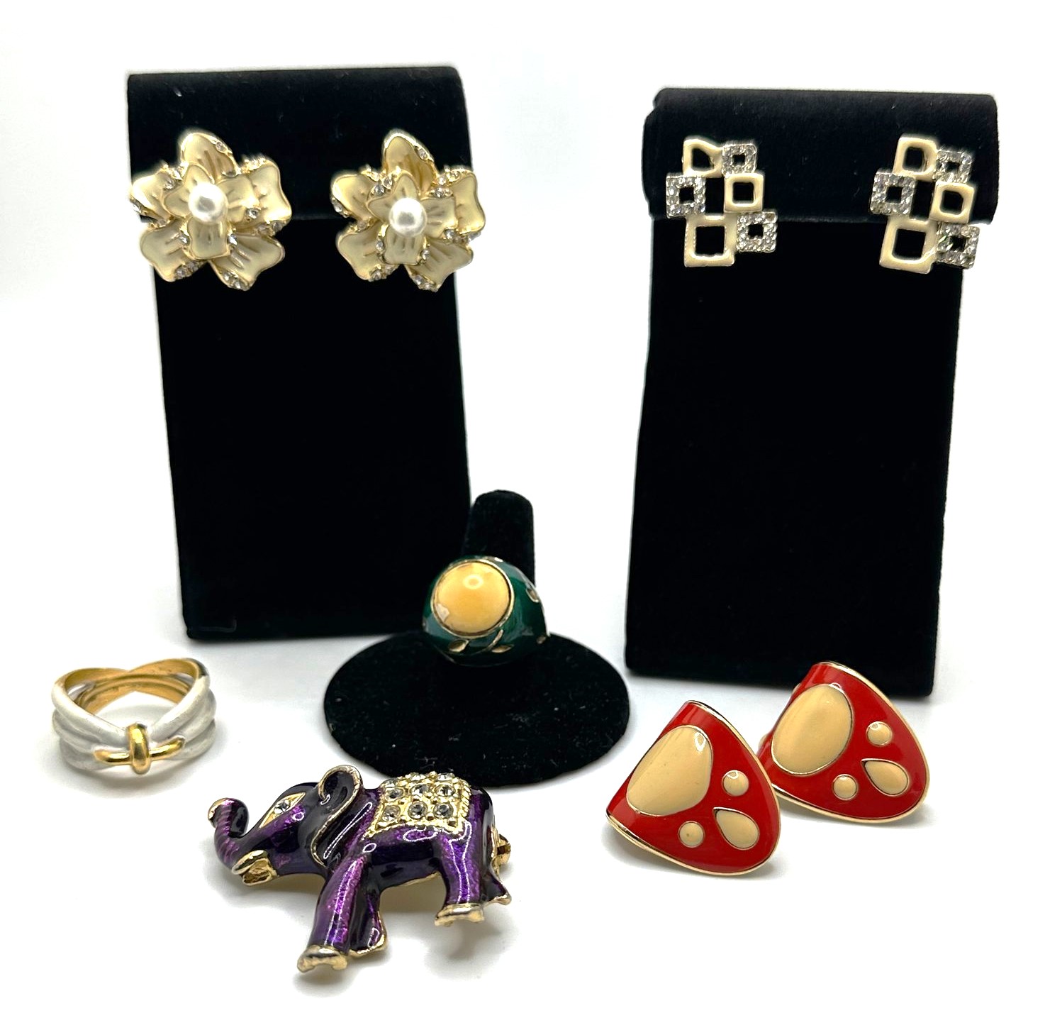 including an elephant measuring 1½" L, Trifari ring, three pair earrings and rings.