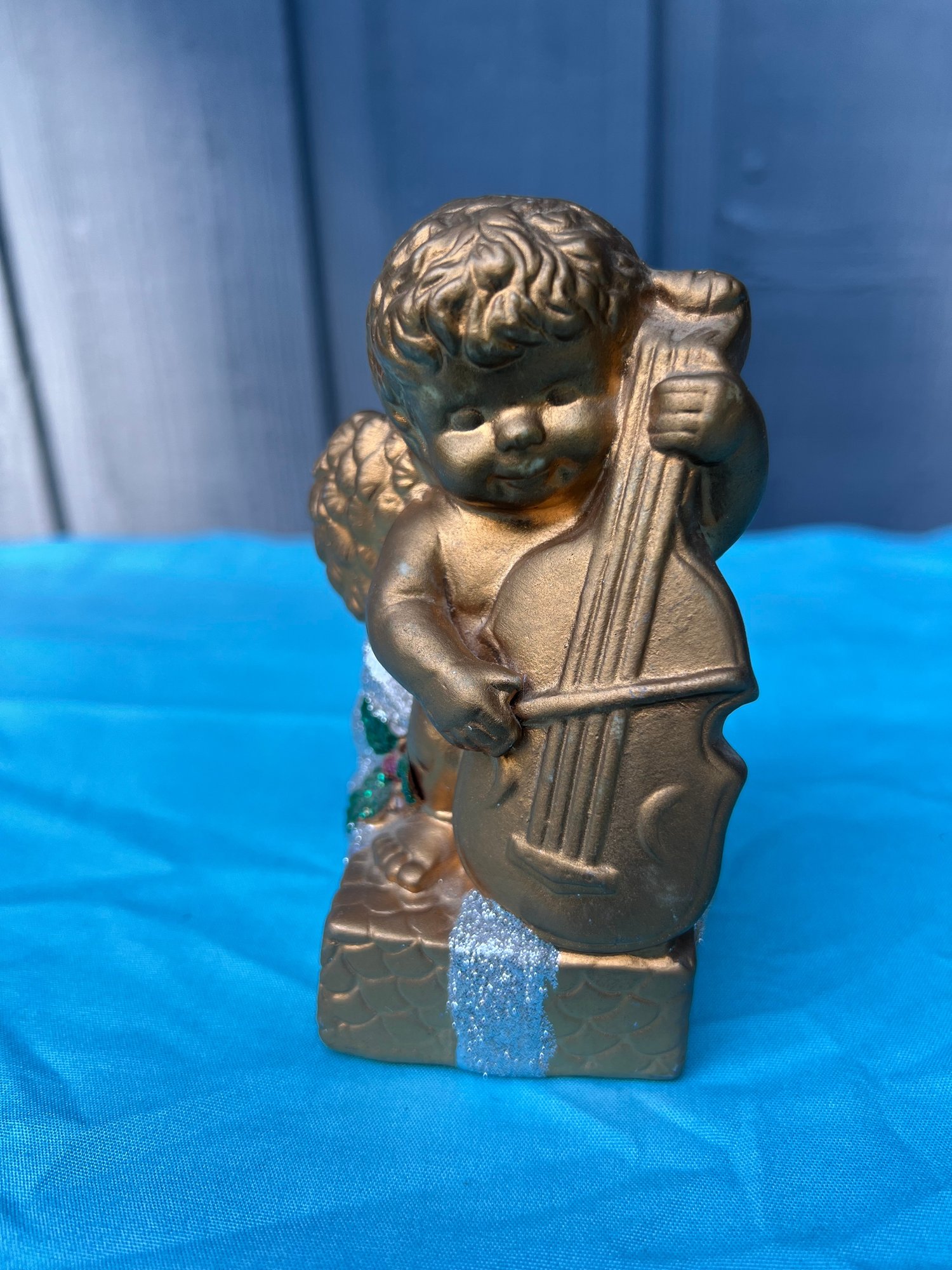 Gold Cherub Angel playing the harp On Silver Ribbon Wrapped Present Base With a hollie on the side. The silver ribbon shimmers.