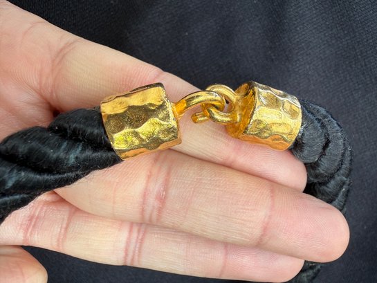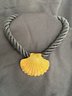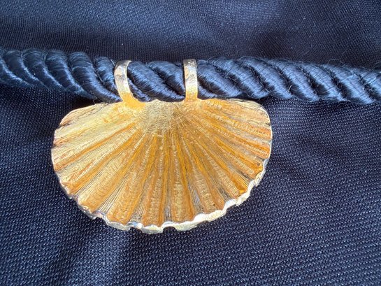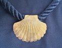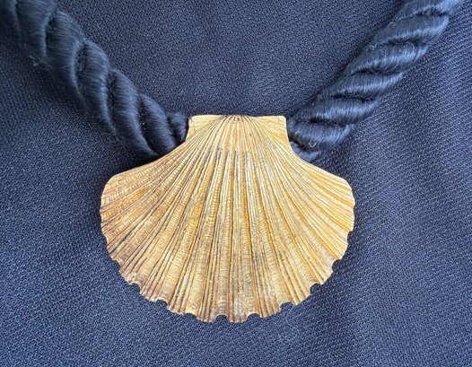 Mermaid-chic gold tone seashell statement necklace on a nautical inspired black rope with hook clasp.