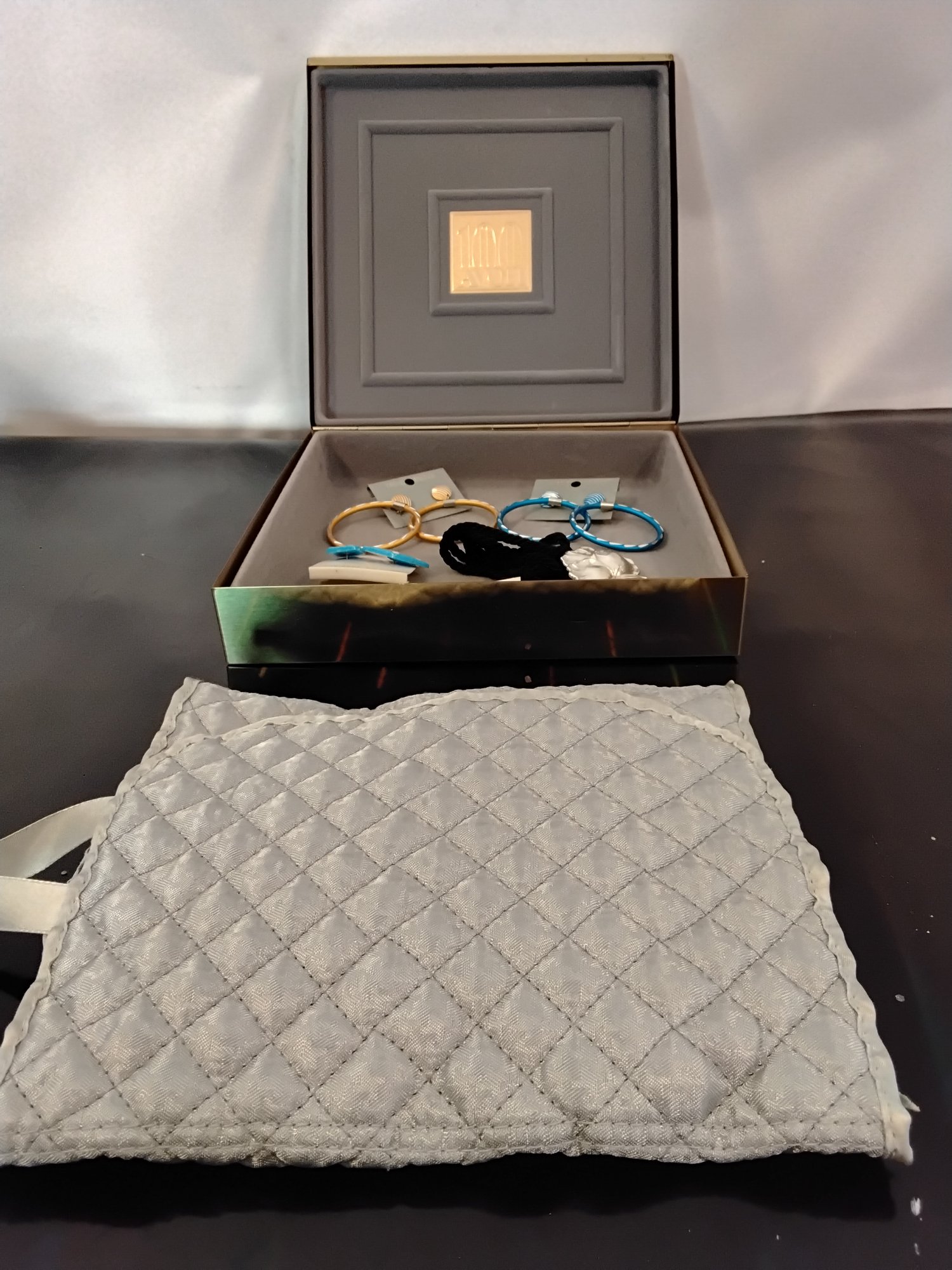 Gold tone Avon metal box with contents