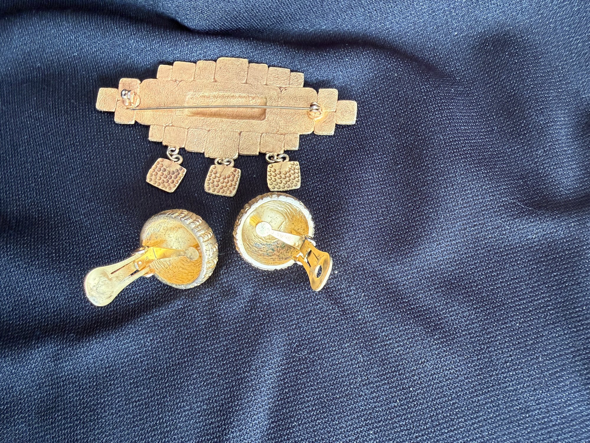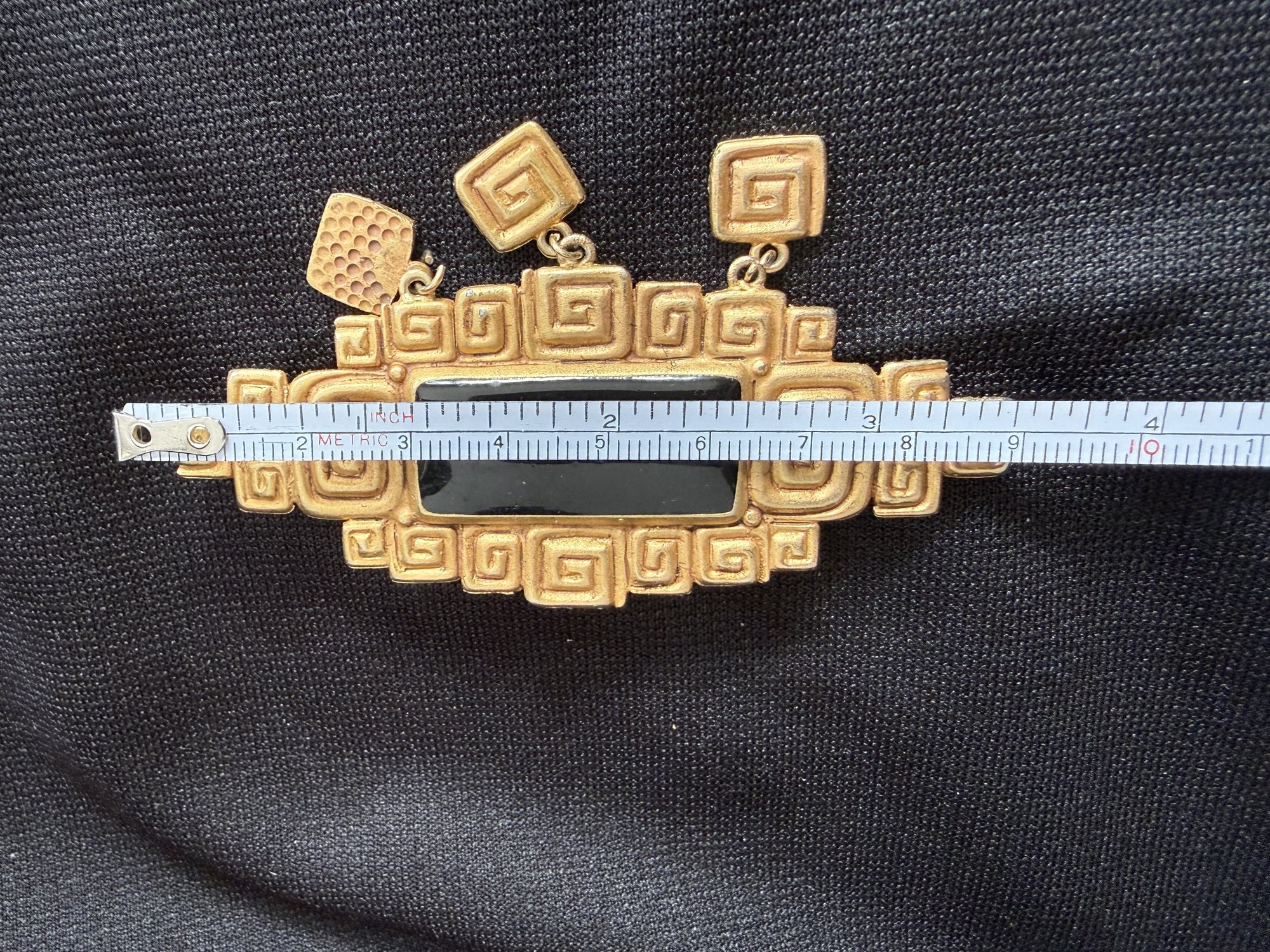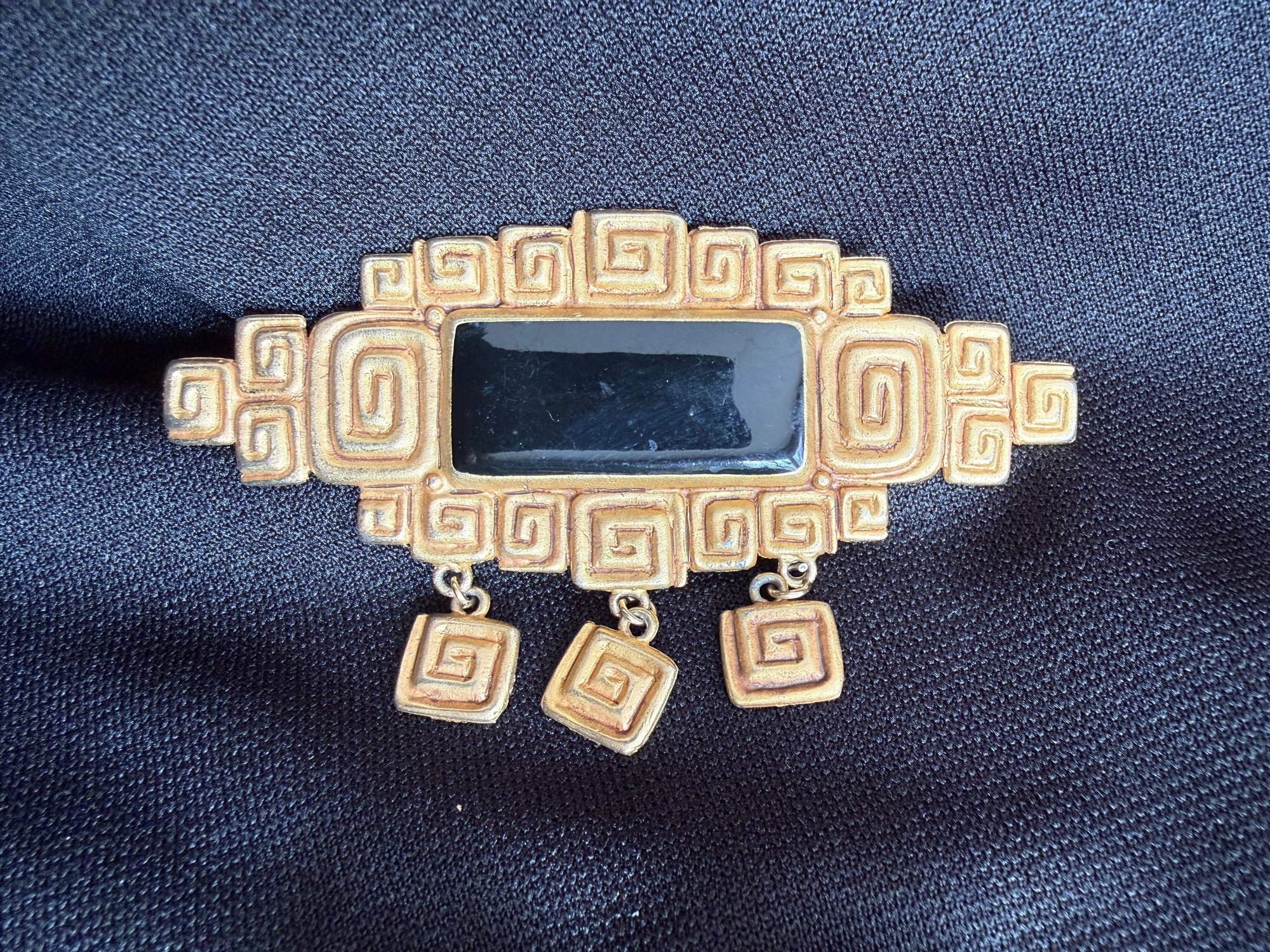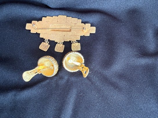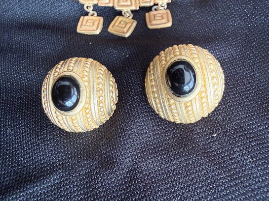 Nice grouping of vintage gold tone and onyx or black resin/glass jewelry - a brooch with striking spiral design and a pair of round clip-on earrings.